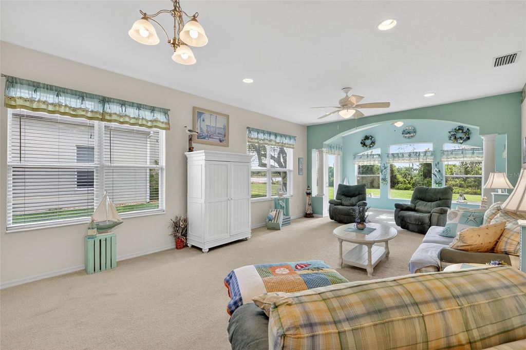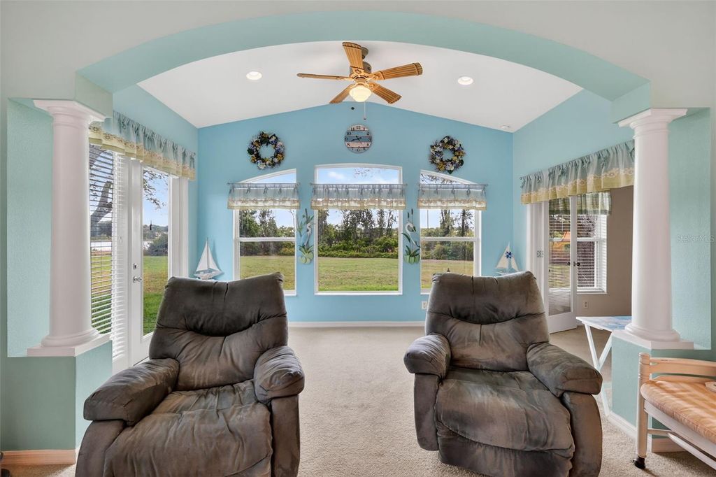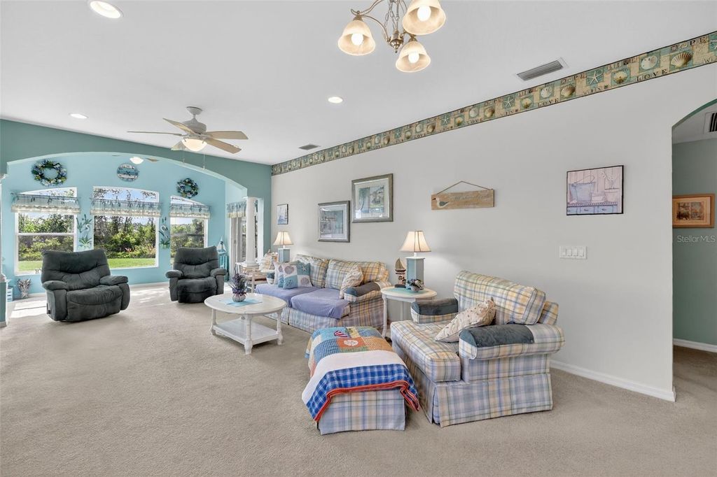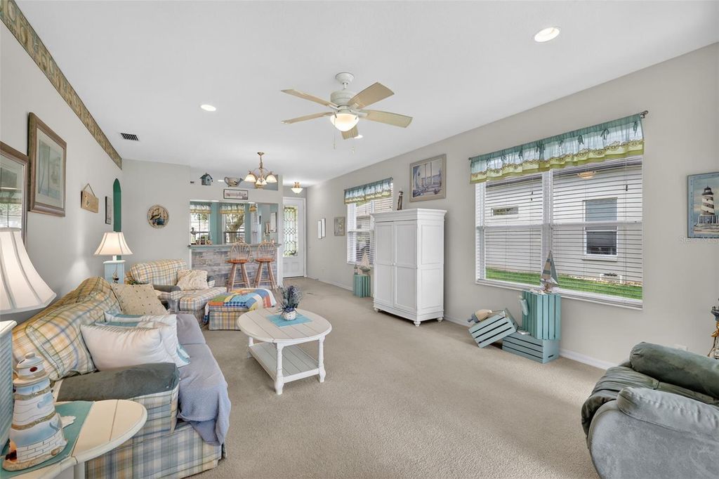 Welcome to this beautifully maintained, furnished/ turnkey Balmoral model, perfectly positioned to capture serene water and conservation views"”offering both privacy and a peaceful natural backdrop that so many buyers are searching for today. From the moment you arrive, the covered front porch creates a warm and inviting entry, setting the tone for the light-filled interior that follows. Step inside to a bright and open great room where natural light pours in, seamlessly connecting the living and kitchen spaces for easy everyday living and effortless entertaining. The main living area opens to an extended living space with picture windows that overlook the view "”an ideal setting to enjoy morning coffee or unwind in the evenings. The eat-in kitchen features a cozy breakfast nook and is conveniently located next to the indoor laundry room with pantry storage and direct access to the garage, creating a layout that is both functional and comfortable. The primary suite offers a relaxing retreat with a generous walk-in closet, while the en-suite bath includes a jetted tub, step-in shower and linen closet for added convenience. A flexible guest wing provides two additional bedrooms and a guest bath, perfect for visiting family or easily adapting one room into a home office or hobby space. Additional features include a 2024 water heater, 2023 roof, 2018 HVAC system, a termite bond with Florida Pest and a whole-home water filtration and softening system, offering peace of mind for years to come. Located in the highly sought-after Royal Highlands, this resident-owned, guard-gated 55+ community offers an exceptional lifestyle. Residents enjoy an 18-hole golf course with restaurant and pro shop, two pools (indoor and outdoor), lighted tennis and pickleball courts, shuffleboard and bocce ball, a softball field, billiards, a fitness center, card rooms, and a library. The Grand Hall serves as the heart of the community, hosting social events, fitness classes, concerts, and more. The HOA also includes cable, high-speed internet, and secure RV and boat storage. This is more than just a home"”it's a place where comfort, connection, and natural beauty come together in one of Lake County's most desirable 55+ communities.