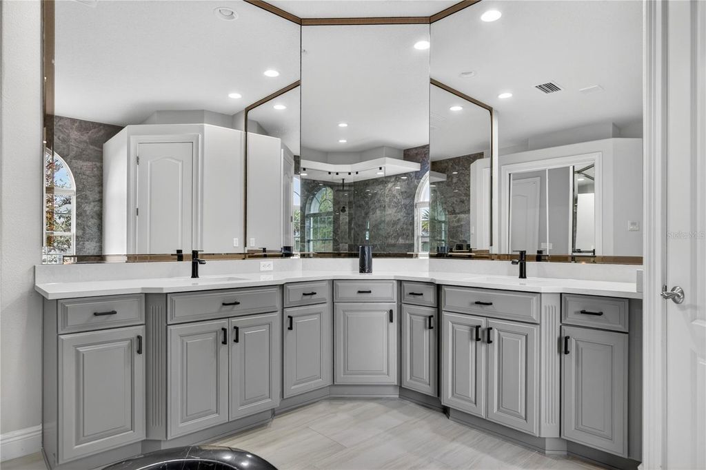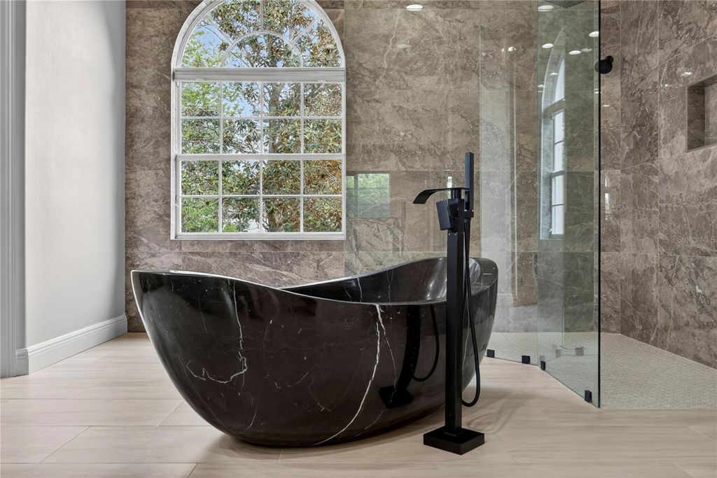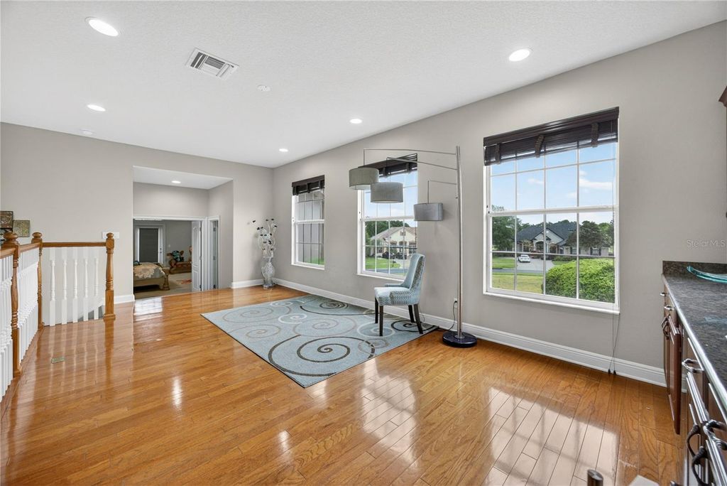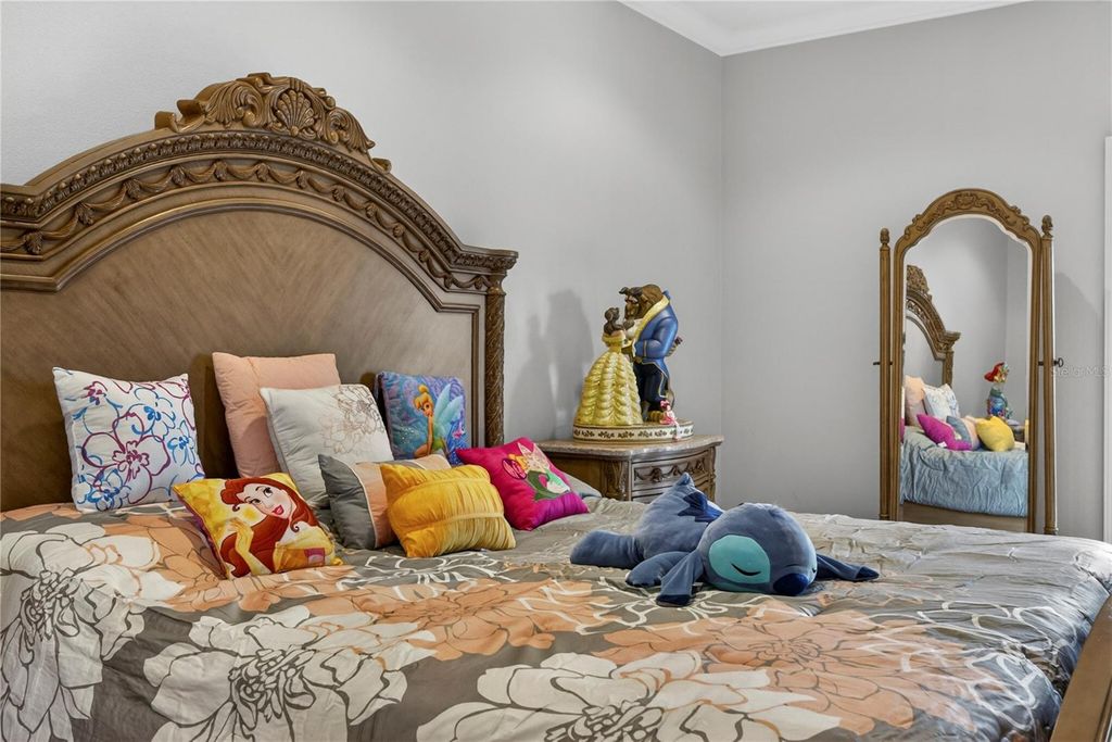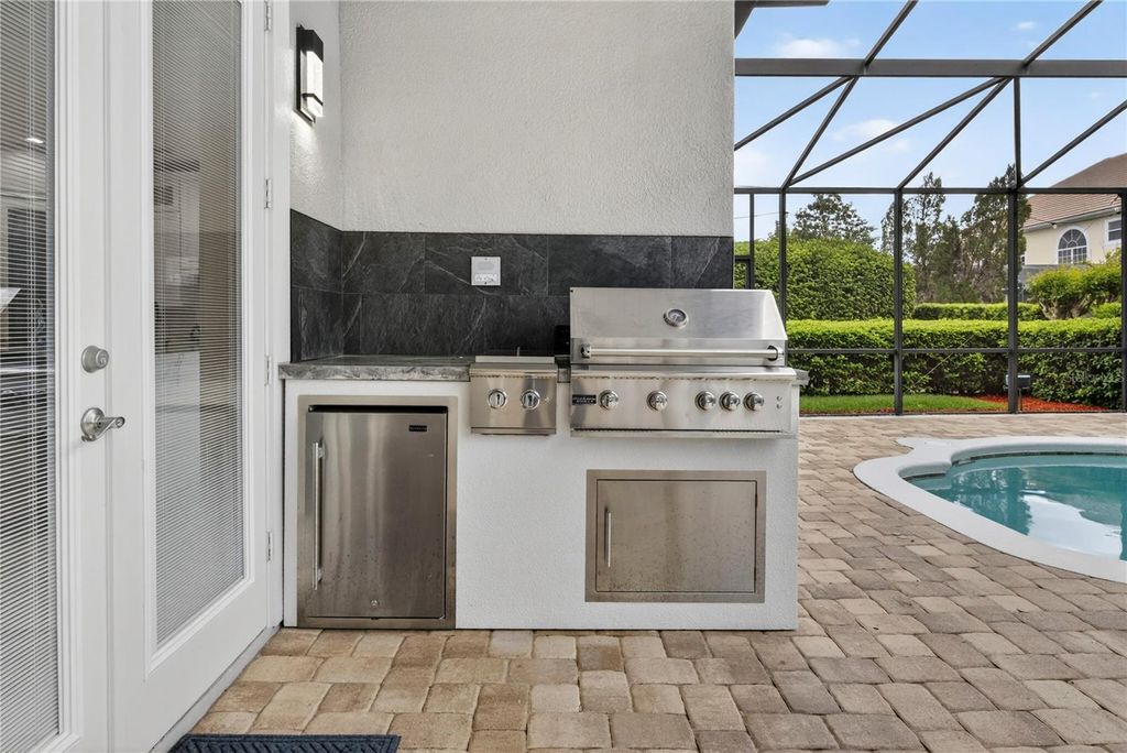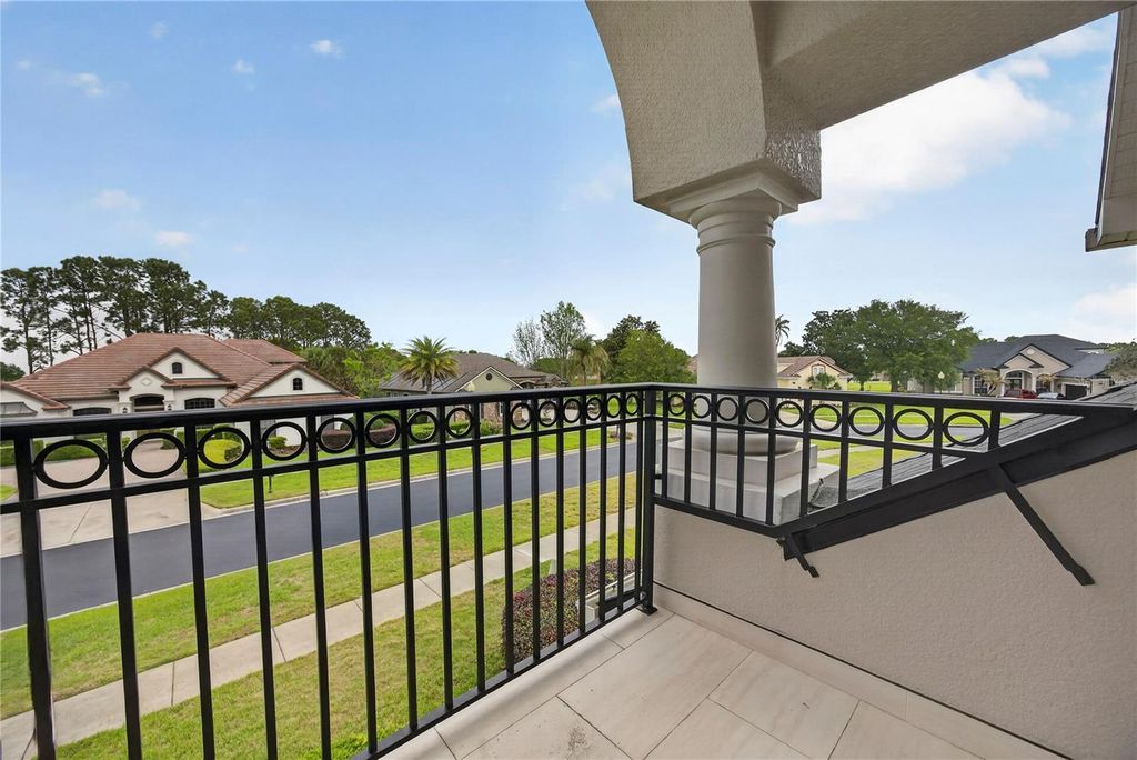 Welcome to this exceptional estate located in the highly sought-after Carrington community at Legends, where luxury, space, and thoughtful design come together to create the ultimate Florida lifestyle. Built in 2006 and offering 4,818 square feet of living space, this impressive residence features 5 bedrooms, 5 full bathrooms, and 1 half bath, along with an oversized 3-car garage, private pool, and spa. From the moment you enter, you are greeted by a grand two-story foyer, elegant finishes such as an open layout designed for both everyday living and entertaining. The formal living and dining rooms are enhanced with crown molding, tile flooring, and built-in speakers, creating a refined yet welcoming atmosphere. The spacious family room features an electric fireplace and seamlessly connects to the outdoor living area through two sets of double doors. The chef's kitchen is truly the heart of the home, showcasing floor-to-ceiling custom cabinetry measuring 9'6", a generous 7' x 8' quartz island, and a farmhouse sink. Designed for both style and functionality, the kitchen also includes WiFi-enabled top of the line appliances, a walk-in custom pantry, and custom electrical features through out. The primary suite offers a luxurious private retreat with a tray ceiling, direct access to the pool area, and a beautifully designed walk-in closet with built-ins. The spa-inspired primary bathroom includes linen closets, a separate walk-in shower, a freestanding marble tub imported from Europe, quartz countertops, custom vanities, and a private water closet. Upstairs, spacious bedrooms feature carpeted flooring, recessed lighting, ceiling fans, and custom closets. A versatile loft area with hardwood flooring and a kitchenette provides additional living flexibility, while the upstairs family room is the perfect space for a media room, office, or playroom, complete with a custom-designed ceiling with crown molding. Step outside to your own private resort-style oasis, featuring a screened-in pool enclosure, expansive deck, heated spa, and an outdoor cooking area with grill, cooktop, and refrigerator "”perfect for entertaining or relaxing. Additional highlights include a newer roof, three updated A/C units, marble window sills, custom chandeliers, crown molding, recessed lighting, laundry room with cabinetry and farm sink, and a 3-car garage with ceiling-height storage. This extraordinary home offers the perfect blend of luxury, comfort, and functionality in one of the area's most desirable communities.