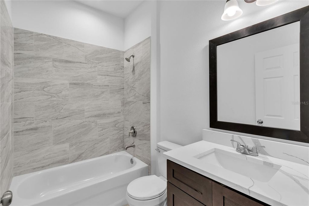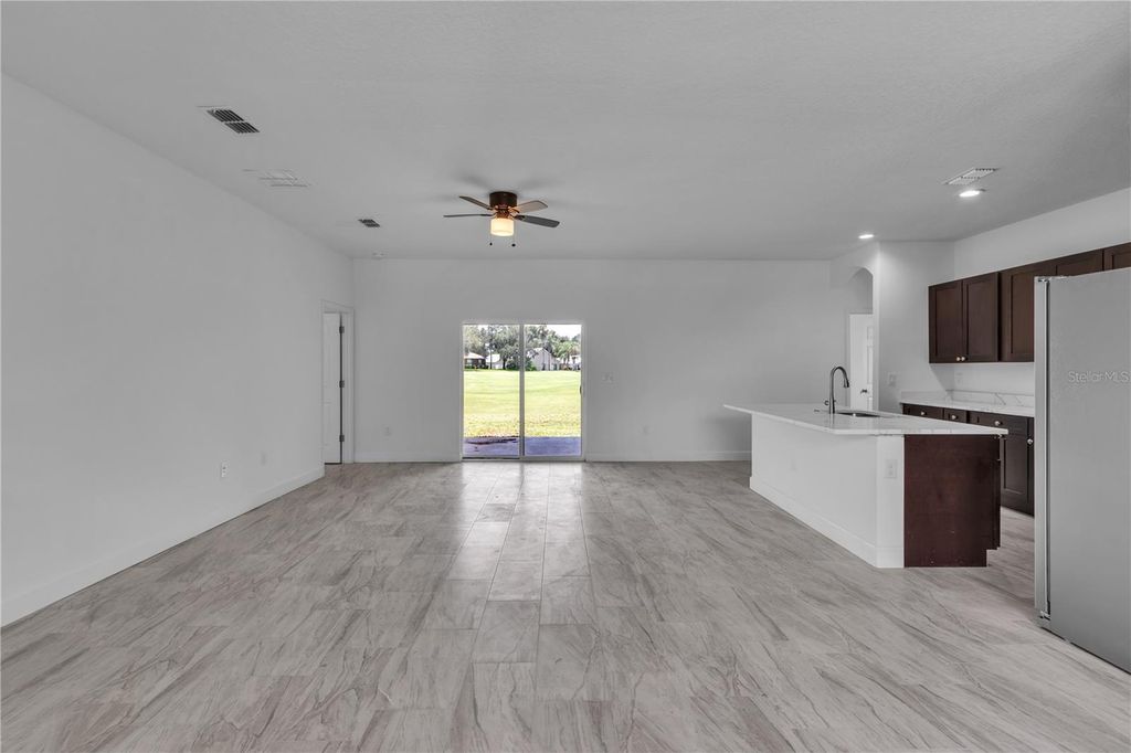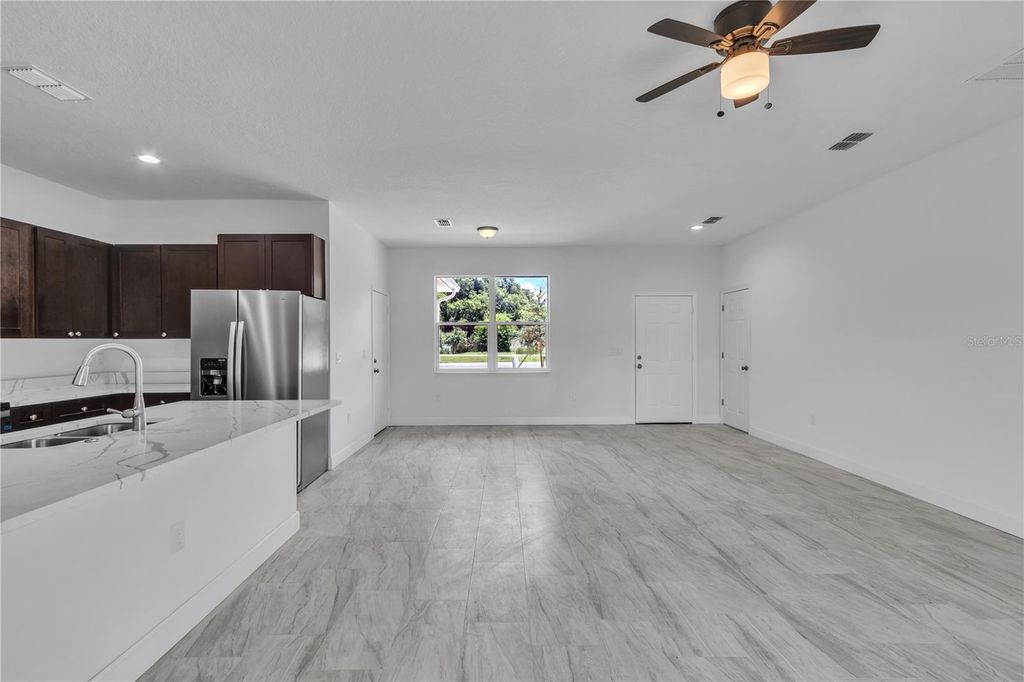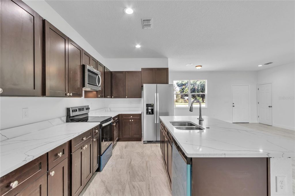 Discover your new home in the Village Green community, nestled in the picturesque city of Clermont. This stunning four-bedroom, two-and-a-half-bathroom home, just completed in July 2024, offers exquisite views of the Green Valley Country Club's golf course. With a spacious split floor plan, the primary suite features a luxurious bathroom and two expansive walk-in closets. The additional three bedrooms are generously sized, presenting the perfect space for a growing family or a home office with ample room for guests. The kitchen showcases elegant quartz countertops, premium Whirlpool stainless steel appliances, and a layout that's perfect for hosting. This open concept home boasts soaring volume ceilings and elegantly tiled floors throughout every room, including the bathrooms. Furthermore, this area is on the rise, with new stores, restaurants, and retail centers continuously being added, offering endless growth and opportunity.