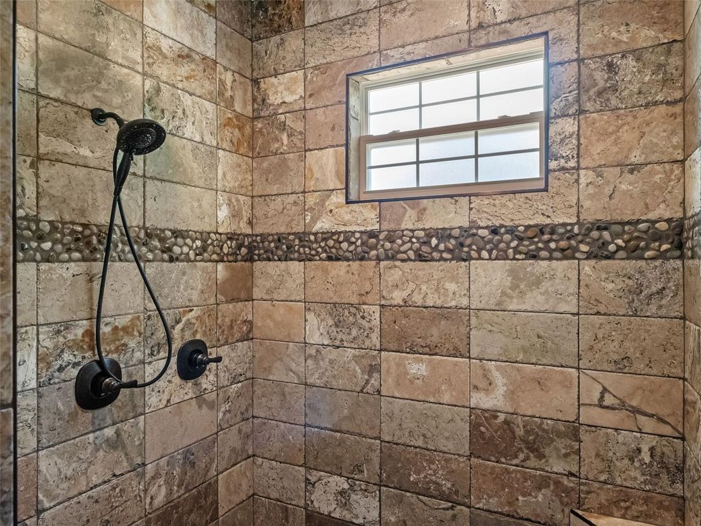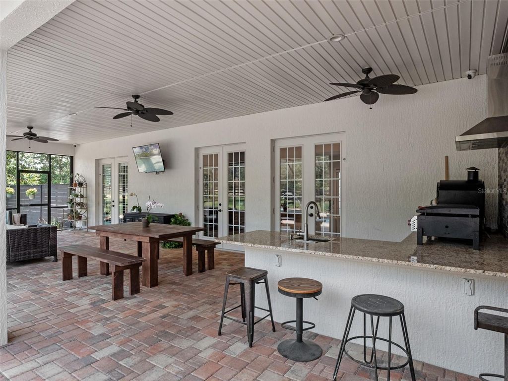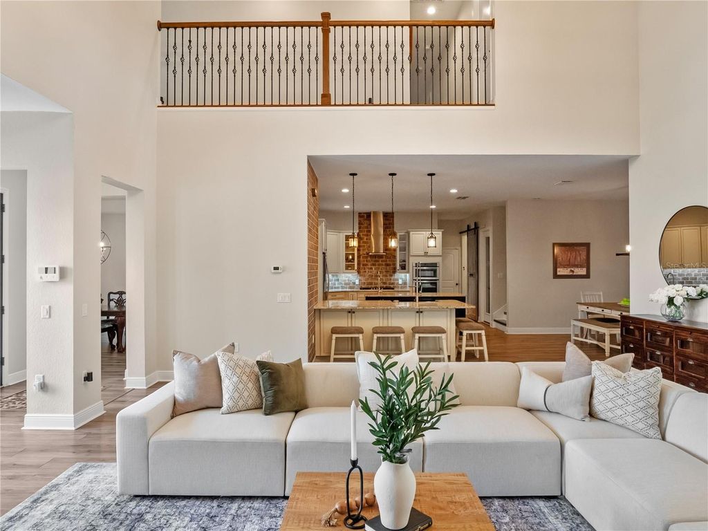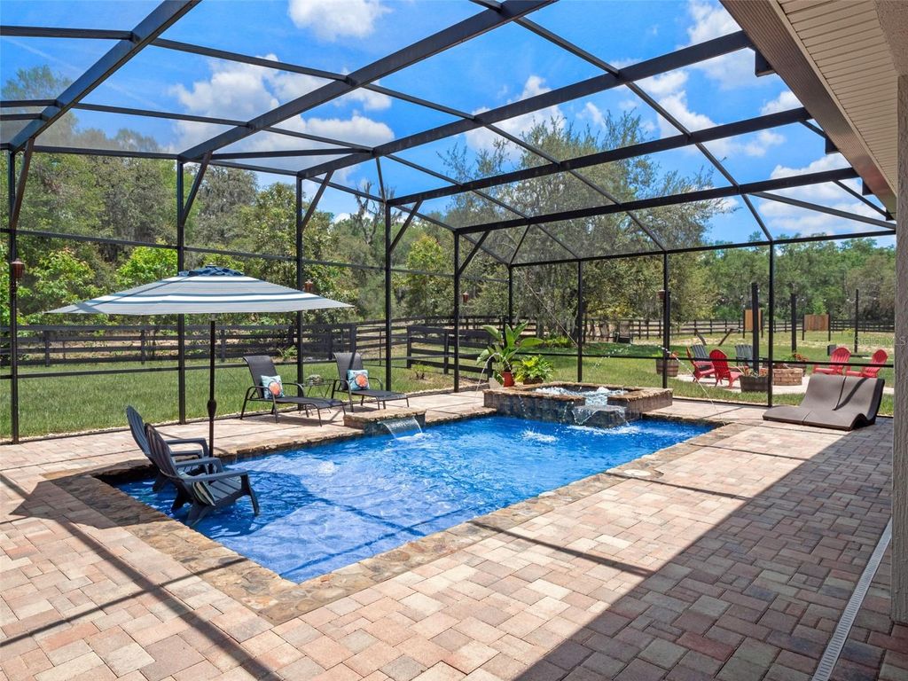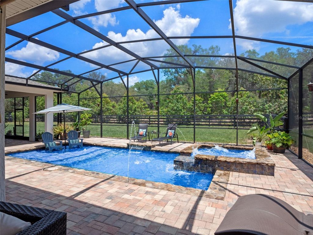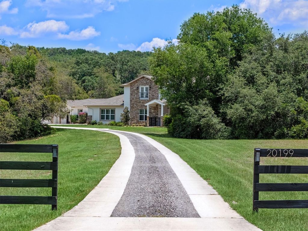 Welcome to Your Dream Estate in the Scenic Sugarloaf Mountain Area! This exceptional multi-generational custom-built estate is nestled on 5.27 acres of beautifully landscaped property framed by majestic oak trees. Freshly painted and packed with luxury features, this home is designed for comfort, entertainment, and long-term living. The main residence boasts four spacious bedrooms, five full bathrooms, one half bath, and a three-car garage. At the heart of the home is a chef's dream kitchen featuring custom wood cabinetry, a built-in oven and microwave, gas cooktop, massive island, and high-end stainless steel appliances. The soaring 20-foot ceilings in the living room are complemented by exposed wood beams, a retractable chandelier, stone accent wall, and a cozy electric fireplace"”all creating a warm and elegant atmosphere. The primary suite opens directly to the pool lanai and includes a spa-like en-suite with dual vanities, a luxurious rain shower, and dual walk-in closets. The custom laundry room is equally impressive with extensive cabinetry, a farmhouse sink, second dishwasher, and premium washer and dryer. Step outside to your own private resort-style oasis featuring a custom saltwater pool with spa, covered lanai, and a fully equipped outdoor kitchen with a grill, pizza oven, sink, and bar seating. A full bathroom is conveniently located on the pool deck. For entertainment and relaxation, enjoy two axe-throwing stations, a regulation horseshoe pit, and a wood-burning fire pit area surrounded by custom pavers and ambient lighting. The in-law guesthouse offers incredible versatility with two additional bedrooms, two and a half bathrooms, laundry, two large bonus rooms, and a two-car garage. Its beautifully designed kitchen includes a gas range, farmhouse sink, and abundant cabinetry. Ideal for extended family or long-term guests. Additional upgrades include: Solar panels (owned), Plantation shutters, Luxury finishes throughout This is the perfect estate for multi-generational living or those who simply want room to spread out in style and comfort. Don't miss this rare opportunity! Ask your Realtor for the Feature List, Floor Plan, 360° Virtual Tour, and Video Tour today.