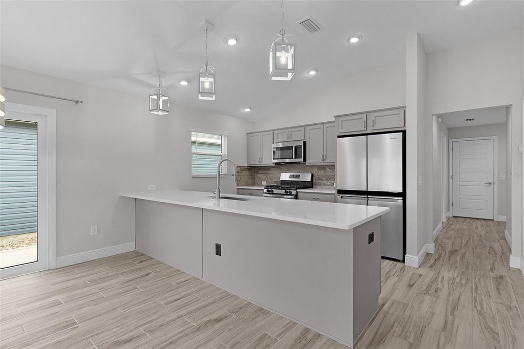 PRICE IMPROVED! WATER VIEW "¢ PRIVATE BACKYARD "¢ MOTIVATED SELLER Welcome home to Dingman Way, where comfort, style, and Florida living come together beautifully. This move-in-ready 3-bedroom, 2-bath home is nestled in a peaceful, well-maintained community and features a serene water view with a private, low-maintenance backyard"”perfect for relaxing and enjoying the Florida lifestyle. Step through the screened entry and into a bright, open floor plan filled with natural light from oversized windows that frame the stunning water view. New custom interior paint and all-tile flooring throughout give the home a fresh, modern feel with no carpet to maintain. The spacious living and dining areas flow seamlessly into the kitchen, making it ideal for everyday living and entertaining. The kitchen shines with quartz countertops, modern appliances, ample cabinetry, and a convenient breakfast bar for casual meals or morning coffee. The primary suite is a true retreat, offering dual walk-in closets and a private ensuite bath with a Roman-style walk-in shower. Two additional bedrooms and a full guest bath provide comfortable space for family or visitors. You'll also appreciate the indoor laundry room with wash tub, perfectly sized for convenience. Outdoor living is a highlight with the screened lanai featuring retractable shades, ideal for enjoying breezes, sunsets, or quiet mornings. The private, low-maintenance backyard means more time enjoying life and less time on upkeep. The garage is upgraded with a finished floor and split A/C unit for year-round comfort. Enjoy resort-style community amenities and an unbeatable location just a golf cart ride to Eastport, Sawgrass and Brownwood Town Squares, championship golf, recreation centers, shopping, dining, and major highways"”offering easy access to all that Central Florida has to offer. Property Highlights: "¢ Water view with private backyard "¢ No carpet + new custom interior paint "¢ Quartz countertops & modern kitchen "¢ Screened lanai with retractable shades "¢ Finished garage with split A/C unit "¢ Resort-style amenities included This is the perfect opportunity to own a beautifully maintained, move-in-ready home at an improved price. Schedule your showing today and experience what makes Dingman Way so special!