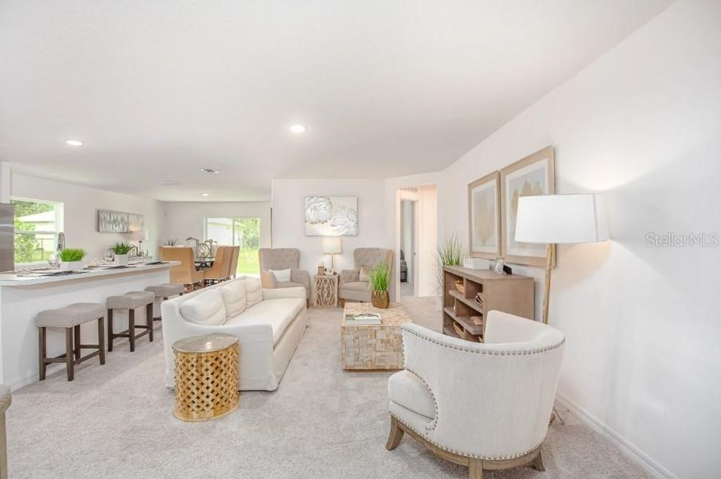 MODEL home offering a sale/leaseback opportunity. Discover The Maple, a move-in ready model home in Marion Oaks, a deed-restricted community with no HOA, located in Florida's "Horse Country." This vibrant area offers rolling hills, green pastures, and the Ocala National Forest right in your backyard. Enjoy the historic downtown with dining and nightlife, along with golf, tennis, and some of the state's best natural attractions. This thoughtfully designed residence blends functionality, comfort, and style. It features a stone-accent exterior, upgraded cabinets, a full line of appliances including an ENERGY STAR side-by-side refrigerator, crown molding, landscaping, and architectural shingles. Luxury EVP flooring flows throughout the entire home for a clean and sleek finish. The foyer opens to two secondary bedrooms"”one with a walk-in closet"”accompanied by a full bath, creating an ideal setup for guests or household members. At the heart of the home, the open-concept living, dining, and kitchen area invites connection and effortless entertaining. The kitchen features granite countertops, a large center island, and a spacious pantry, while a nearby flex room offers endless versatility for a dining area, playroom, fitness space, or home office. Privately situated at the rear, the owner's suite provides a true retreat, complete with a tray ceiling, spacious walk-in closet, and a luxurious bath with dual sinks, granite countertops, and an oversized ceramic tile walk-in shower. An additional secondary bedroom at the back of the home adds even more flexibility. Everyday convenience is enhanced by a walk-through laundry/mud room directly off the three-car garage, which includes a washer and dryer. Step outside to the screened lanai, perfect for outdoor relaxation or entertaining. Smart home features, including a Ring Video Doorbell, Smart Thermostat, Keyless Entry Smart Door Lock, and Deako switches, provide modern convenience and security. Backed by a full builder warranty, The Maple delivers the perfect combination of comfort, efficiency, and modern design"”a luxury home ready for you to move in and enjoy today. Note: temporary sales office will convert to 3 car garage