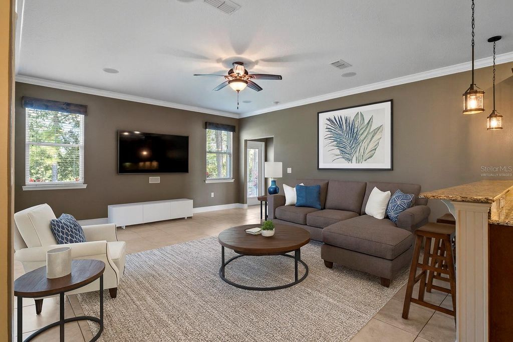 One or more photo(s) has been virtually staged. Discover Florida living at its finest! This beautifully maintained 4-bedroom + office, 3-bath home is perfectly situated on a sprawling 1.69-acre corner lot in the gated community of Blue Spring Reserve. From the moment you step inside, you'll appreciate the 9-foot ceilings, elegant crown molding, and open-concept design that fills the home with natural light and a welcoming feel. The spacious kitchen opens to the living and dining areas, creating the perfect flow for entertaining family and friends. The primary suite offers a peaceful retreat featuring dual vanities, a soaking tub, and a walk-in shower, while the additional bedrooms and office provide flexibility for guests, work, or hobbies. Step outside to the screened-in patio overlooking the fenced backyard, offering a tranquil setting for morning coffee or weekend gatherings. With 1.69 acres of land, there's ample space to add a pool, garden, or play area. The 3-car garage provides plenty of room for vehicles, storage, or even a workshop. Blue Spring Reserve is known for its serene, nature-filled atmosphere with easy access to Clermont, Winter Garden, shopping, dining, and major highways, offering the perfect balance of privacy, space, and convenience a true gem in Central Florida living!