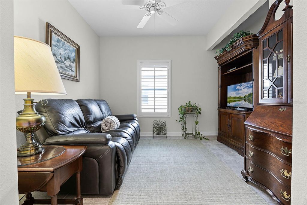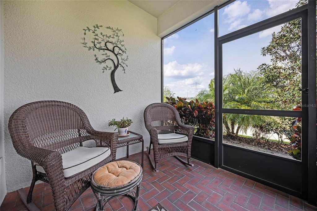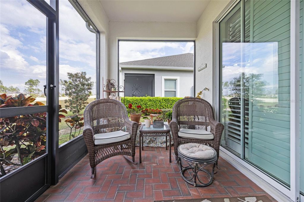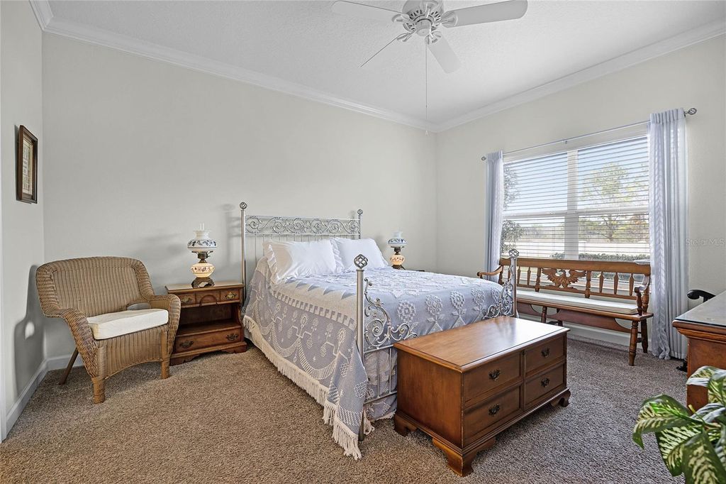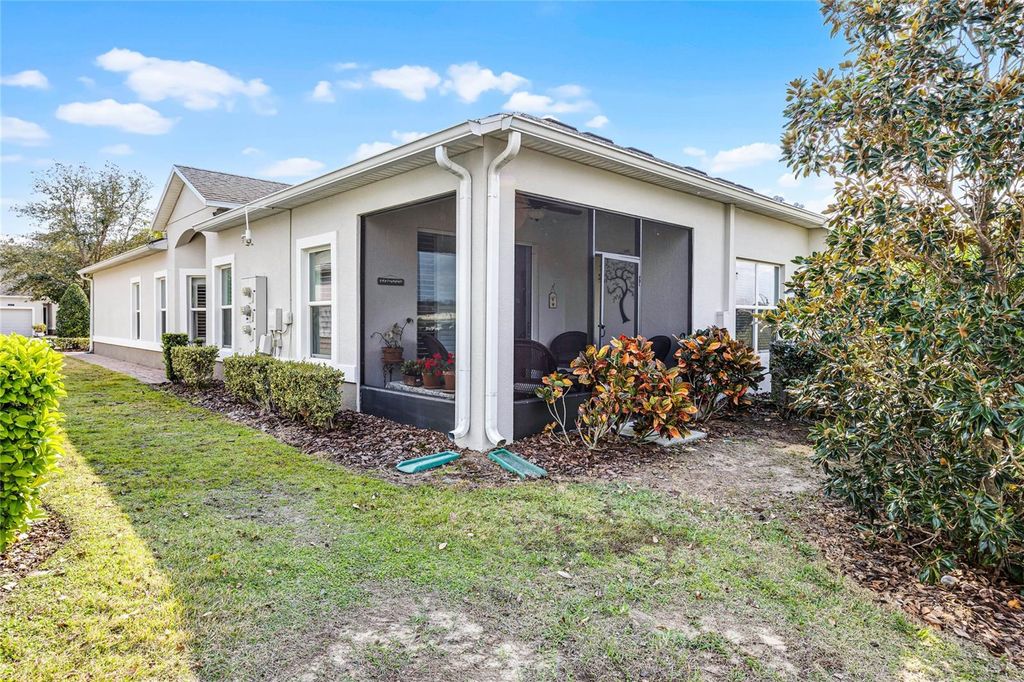 Heritage Hills is a sought after 55 plus community in beautiful Clermont! This popular St. Marten villa is a 2 bedroom with 2 full baths plus a flex room with a one car garage! Loads of upgrades in this villa! Plantation shutters on all the windows including the sliding glass door to the lanai. There is crown molding, ceramic tile in the main living area and carpet in the 2 bedrooms. The screened lanai is a perfect place to relax and enjoy the outdoors with no rear neighbors! Lots of privacy! The split bedroom plan is perfect for guests! The washer and dryer stay! The kitchen has tons of cabinets and granite countertops with a breakfast bar with pendant lighting. The windows in the family room and dining room bring lots of natural light inside! Furnishings optional. Heritage Hills amenities include a heated pool and spa, pickle ball, tennis, basketball, bocce ball, shuffleboard, clubhouse with planned activities, lots of clubs to join, fitness center, art and crafts room, billiard room, card room and ballroom for holding events. Exterior is painted every 5-6 years! The roof is replaced at year 15 and the reclaimed irrigation water is included in the HOA fee. There is a 5 mile walking trail around the community. Call today for a private showing!