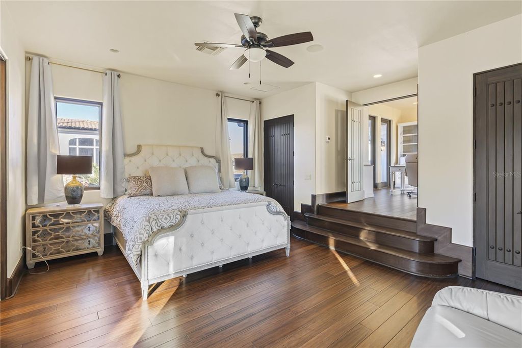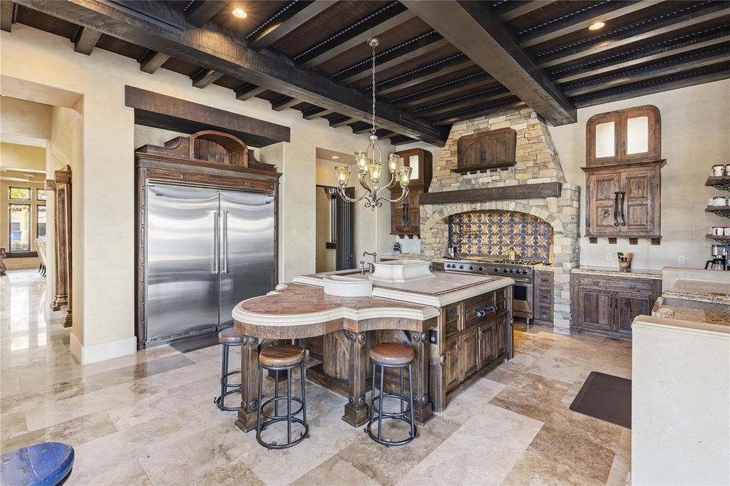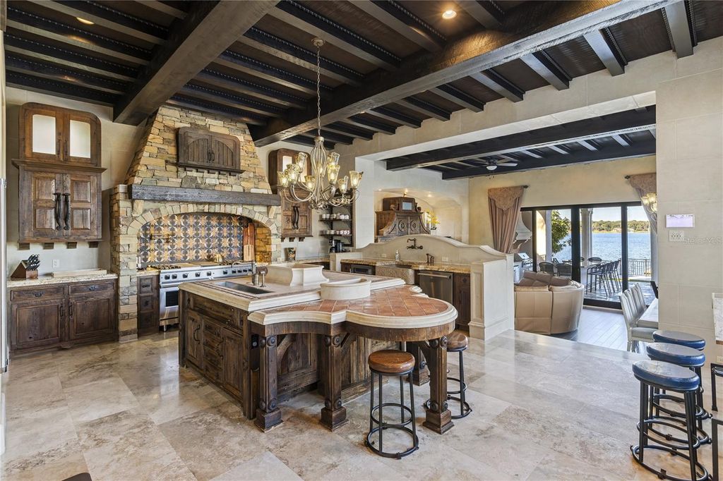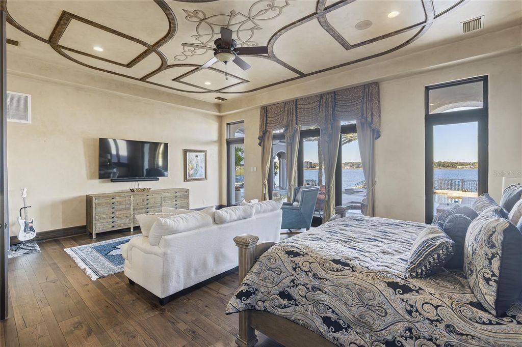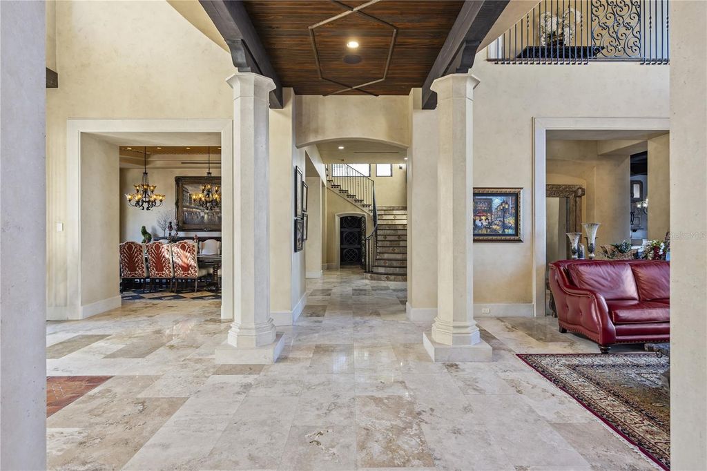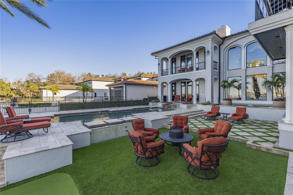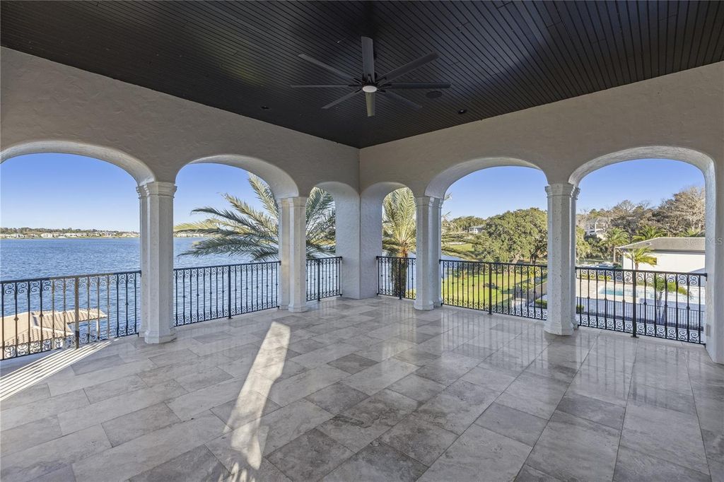 "Montebenichi" is a one-of-a-kind, palatial waterfront estate located on Lake Siena within the exclusive, guard-gated Bella Collina community. This custom-built, Tuscan-inspired masterpiece offers 6 bedrooms, 9 bathrooms, and direct frontage on Lake Siena, spanning approximately 10,600 square feet with breathtaking lake views and exceptional craftsmanship throughout. A private gated entrance leads to a grand central courtyard with four garages, setting the tone for the elegance found inside. The estate features five balconies and multiple covered patios overlooking the resort-style pool and spa with LED water features and panoramic lake views. The main living area showcases a gas fireplace, polished and sealed travertine floors, dramatic second-story ceilings, and expansive windows framing the pool, patio, and lake. A stone-enclosed wine room accommodates approximately 600 bottles. The gourmet kitchen is equipped with a new Viking appliance package, oversized island, granite countertops, and designer lighting. A Crestron whole-home automation system controls music, lighting, and temperature throughout the residence. The upper level offers a private movie theater, a golf simulator room, and access to a covered patio with sweeping lake views. A stand-alone guest or in-law suite above the garage includes a private entrance, full kitchen, bath, and laundry. Additional highlights include two laundry rooms, a covered outdoor kitchen ideal for entertaining, and extensive high-end finishes throughout. The first-floor primary suite is a luxurious retreat featuring custom finishes, a spa-style stone bath, and an expansive walk-in closet. Four additional en-suite bedrooms are located on the second level. This award-winning home, featured in the 2006 Parade of Homes - Street of Dreams, is located within Bella Collina, offering over 1,900 acres of rolling hills, a Nick Faldo-designed championship golf course, tennis facilities, fitness center, resort-style pool, world-class spa, and a 75,000-square-foot clubhouse.