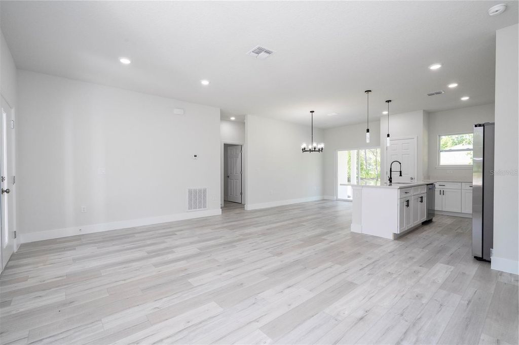 BRAND-NEW CONSTRUCTION, MOVE-IN READY! Discover this stunning and spacious 3-bedroom, 2-bath home with a 2-car garage, thoughtfully designed for comfort and modern living. Step onto the inviting covered front porch and through the elegant double entry doors into a bright and open floor plan. The living area is at the front, while the kitchen and dining spaces flow seamlessly toward the back, creating the perfect space for entertaining. This home boasts luxury vinyl plank flooring, quartz countertops, stainless steel appliances, 42" cabinets with crown molding, and a large kitchen sink. The spacious island with a breakfast bar and built-in pantry add both style and functionality. A separate indoor laundry room. The primary suite is a bright and airy retreat, featuring two windows for natural light, a generous walk-in closet, and an ensuite bathroom. The primary bath is designed with dual sinks, a tiled shower, and a water closet. The second and third bedrooms are situated on the opposite side of the home, with a stylish guest bathroom between them, complete with a quartz countertop and tiled tub surround. Through the sliding glass doors, step onto the expansive covered lanai, spanning over half the width of the home, and enjoy outdoor relaxation. Enjoy morning coffee on the front porch and sunsets from your lanai in the evening. Located near the Withlacoochee Trail, Withlacoochee River, golf courses, and Gulf Coast boat ramps, this home offers the perfect blend of tranquility and adventure. Schedule your showing today, you won't want to miss this one!