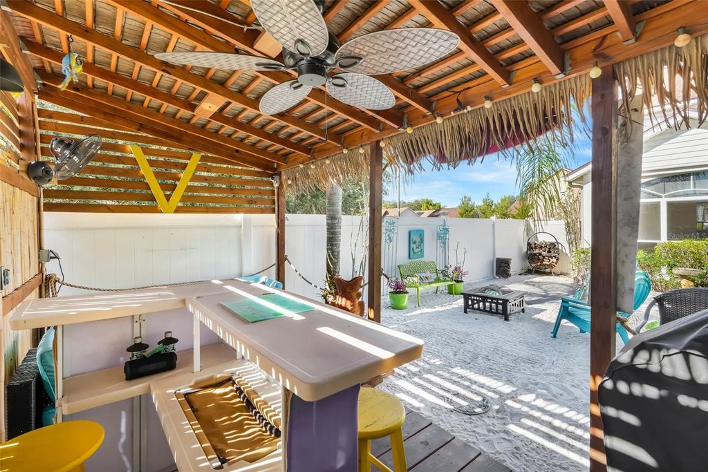 This home has been lovingly cared for by the same owner for 27 years, and you can truly feel it the moment you step inside. There's a warmth here that only comes from years of memories, laughter, and life well lived. The layout flows beautifully, with open living spaces that feel inviting and comfortable. The kitchen connects to the main living area, making it easy to gather. Upstairs, the primary suite and additional bedroom provide a peaceful retreat, creating a quiet and private space to unwind at the end of the day. Step outside and you'll find a true hidden gem, a backyard made for truly enjoying life, with tropical landscaping, a charming tiki bar, and the kind of space that invites you to slow down and stay awhile. Where memories are made, weekend barbecues are shared, laughter fills the air, and quiet evenings unfold under the stars. With hurricane shutters already in place and a detached two-car garage, the home blends charm, function, and peace of mind. Located minutes from Disney, shopping, and dining. This is more than a house, it's a home that has been deeply loved, carefully cared for, and thoughtfully enjoyed for nearly three decades, ready to welcome its new owners who will create memories of their own.