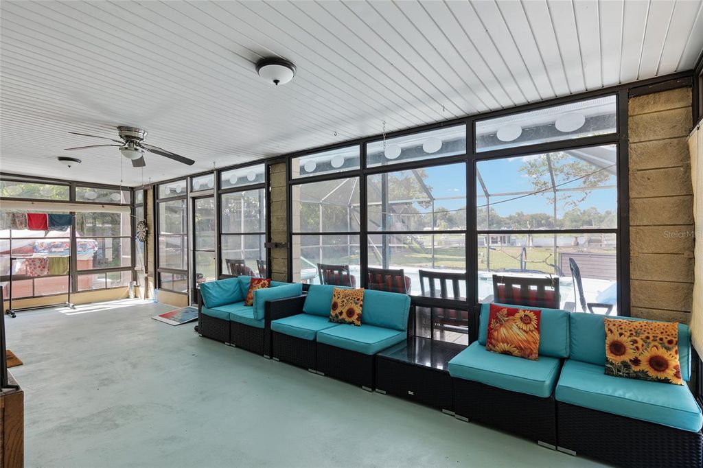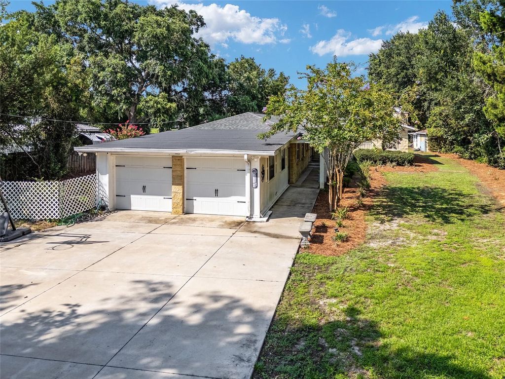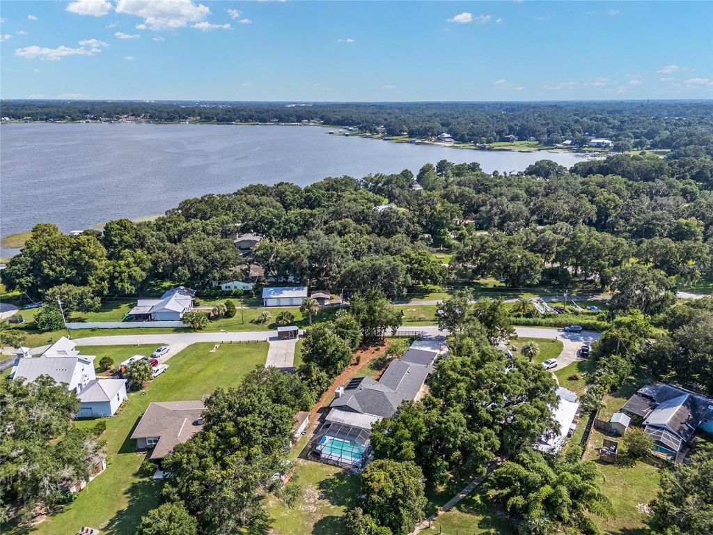 Gorgeous lake front 4 bedroom 2 bathroom property with caged inground swimming pool, lanai, dock, boat house sitting on approx 0.6 acre land. This stunning and unique home is fenced on all sides with a rolling gate at the front, 2 car garage and space for 4 extra vehicles on concrete driveway. Alongside the direct lake access there is a new dock (built 2025) with a seating area with ramp access offering you a place to eat and enjoy the beautiful scenery and wildlife surrounding you. Convenient 30amp electric hook up extension for RV/ lights and any other electrical needs you may have. Landscaped yard adorned with crocus, jasmine and Japanese plum trees. The interior offers a stunning large living room, perfect for family occasions with a unique stone woodburning fireplace and rare pecky cypress mantelpiece. New vinyl flooring throughout the main interior of the house, new bathtub fixture in master bathroom and new blinds throughout giving a beautiful light to the interior and large windows offer stunning views of the lake. In addition to this the pool has solar heated power (2021), new compressor on the air conditioning unit (2024) and new water softener (2023) in place.
