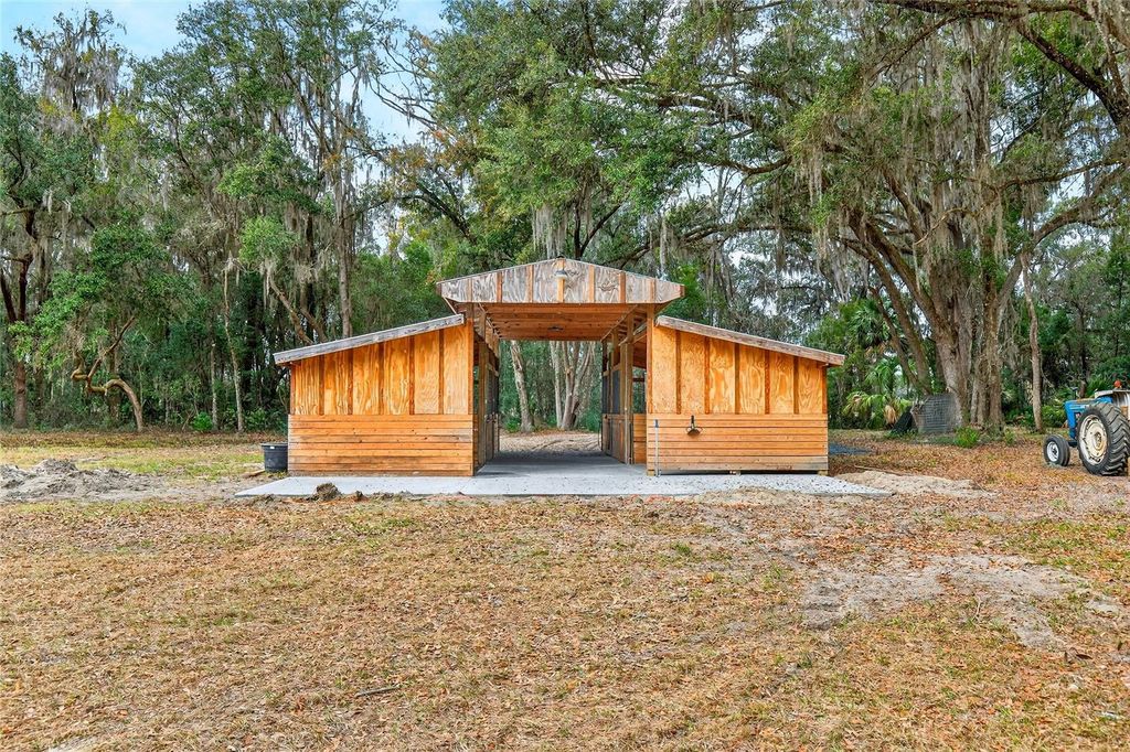 One or more photo(s) has been virtually staged. This a remarkable opportunity to own a 20-acre perimeter-fenced farm zoned A-1 and not in a flood zone that offers a blend of comfort, functionality, and endless potential. This unique property is ideal for equestrian enthusiasts, hobby farmers, or anyone looking to embrace a rural lifestyle. As you enter the property, you'll be greeted by the expansive, beautifully maintained 20 acres surrounded by crop fields, majestic oaks, fully fenced to ensure security for both livestock and a sense of privacy. The pasture provide ample grazing space, making it suitable for horses, cattle, or even a small orchard of trees or garden beds for those with a green thumb. At the heart of this farm is a meticulously designed four-stall barn with concrete center isle, complete with a tack room and wash rack, making it a dream come true for horse lovers. The spacious stalls are constructed with care, ensuring the comfort and safety of your animals. The tack room is perfect for storing equipment and supplies, and the wash rack is an added convenience for maintaining your equine companions as well as a 125 x 75 sand arena. The centerpiece of the property is the impressive 50 x 70 metal building. The Barn-dominium, ready for your creative touches to transform it into a functional living space. With an expansive 14-foot RV door with 50 amp and two additional 10-foot commercial doors for your equipment, this structure boasts versatility and convenience, whether you're looking to drive in large vehicles or use the space for storage or workshops. The Barn-dominium is already framed out to accommodate a 50 x 30 , 2200 square feet, 3-bedroom, 2-bath layout with spacious kitchen, oversized living and dining areas with loads of natural light, providing an excellent opportunity for a custom-designed living area where comfort and practicality converge. Infrastructure has been taken care of for you as well with the Well and Septic being installed in 2022. Imagine the potential of this one of a kind in Marion County Florida. Interior of home will completed in 90 days. Interior pictures included are conceptual design based upon the plans to be completed.