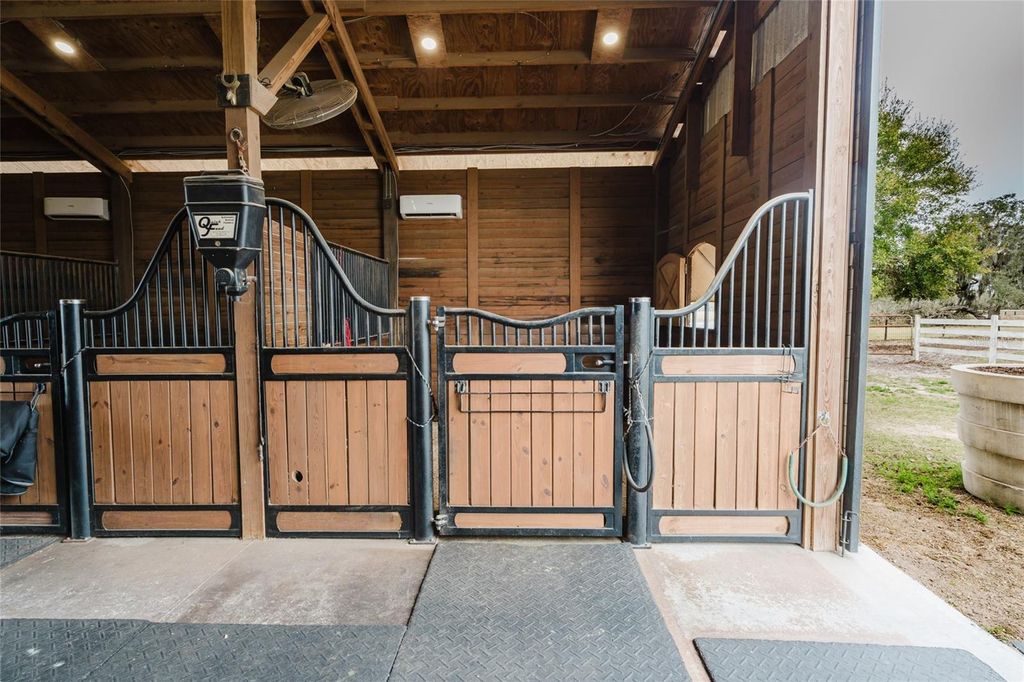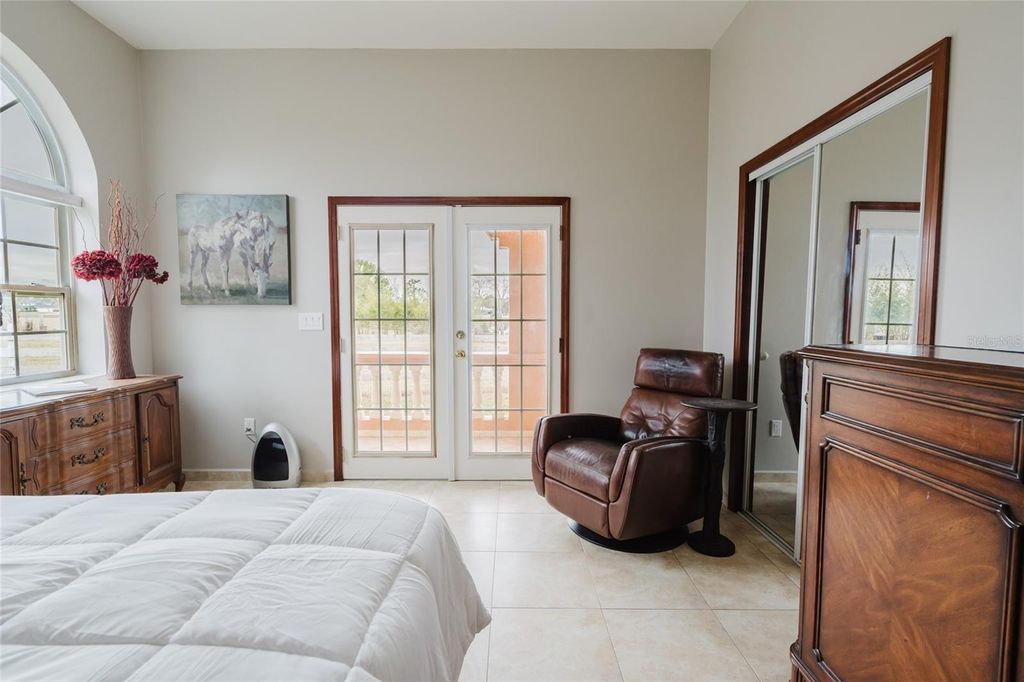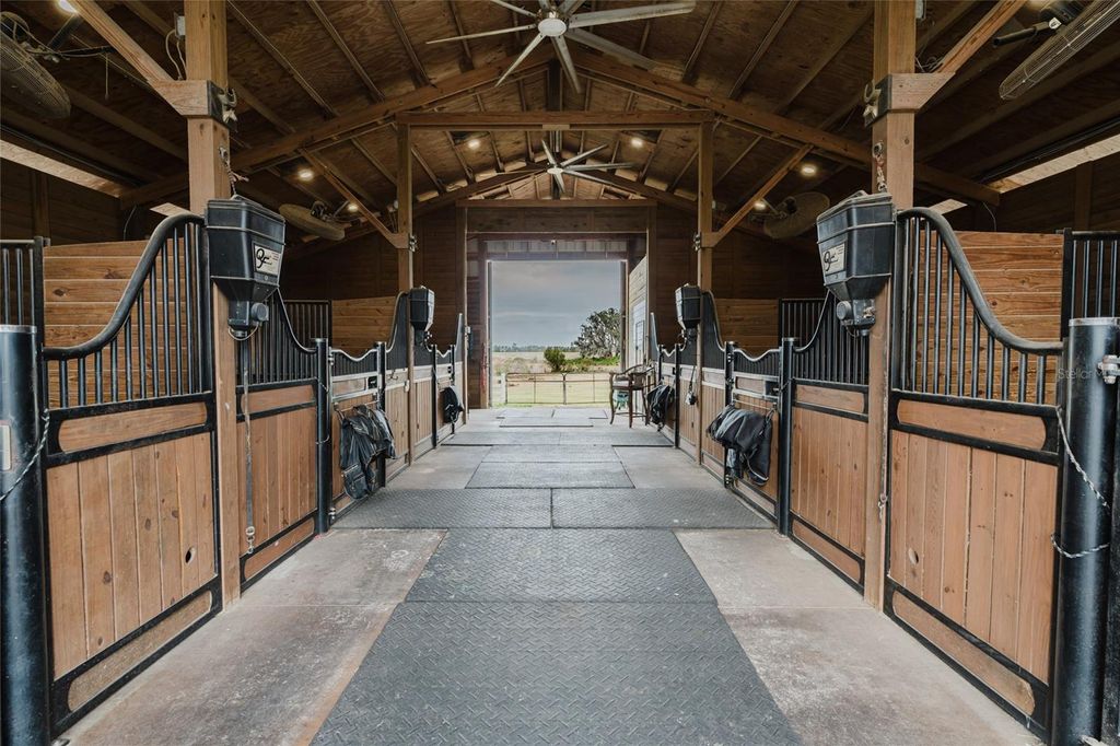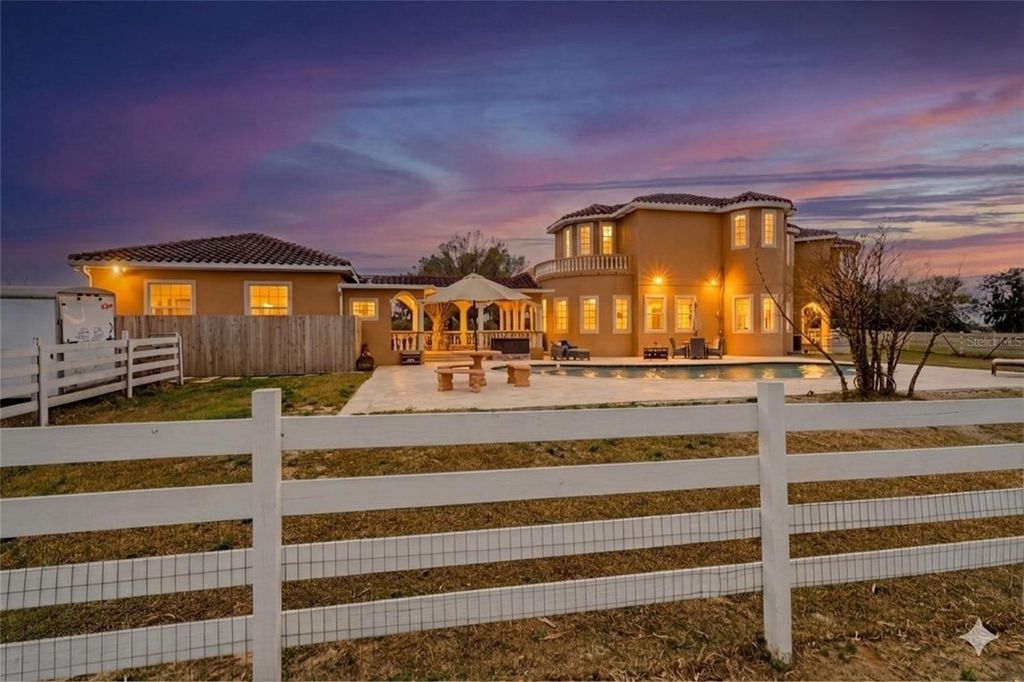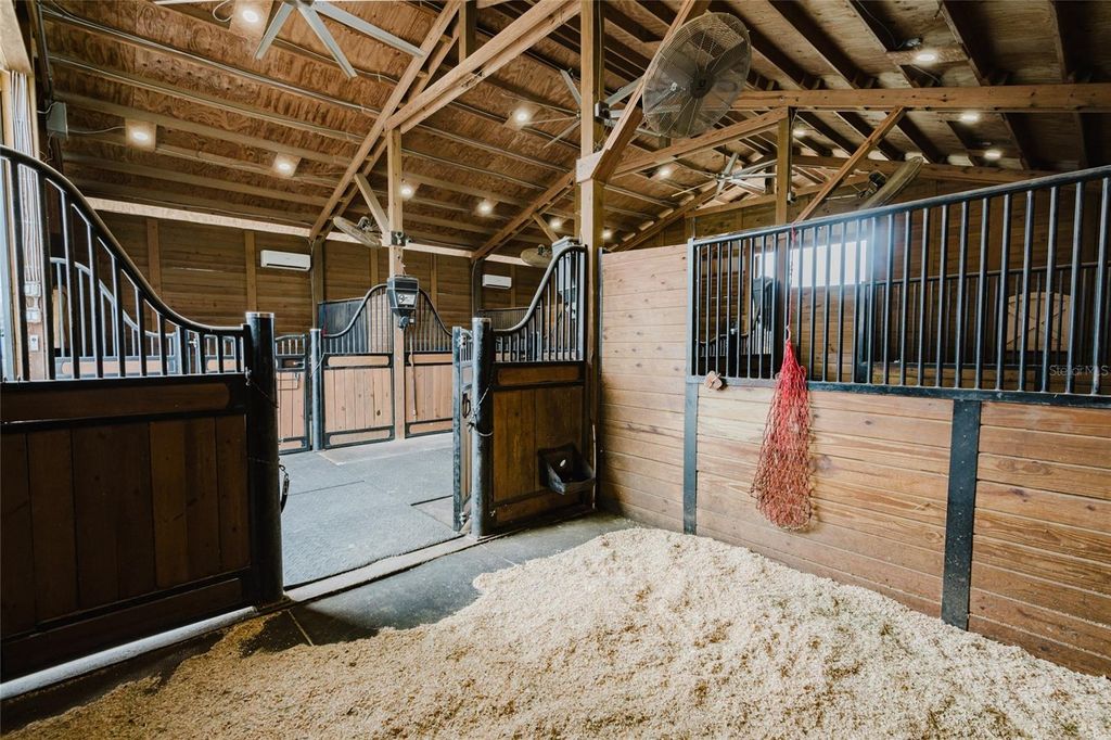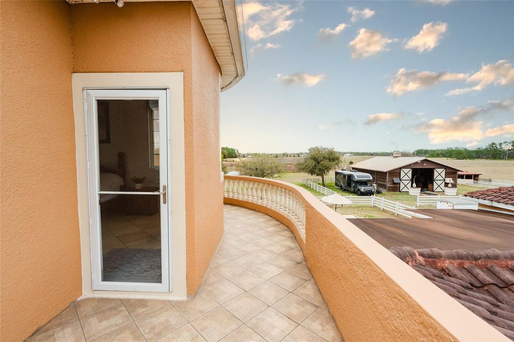 Set on five beautifully maintained acres in Groveland, this exceptional equestrian facility and private residence offers the perfect blend of luxury living and thoughtfully designed horse amenities. Ideally located just 45 minutes from Ocala and directly across from the private Grass Roots Airport, the property offers convenient access to hangars for rent or purchase and available runway usage. The residence features four bedrooms and five full bathrooms, designed to capture sweeping views of the surrounding property. The expansive primary suite includes a wraparound balcony with incredible 180° views across the pastures and beyond, creating a peaceful private retreat. Each upstairs bedroom features its own en suite bathroom, while the downstairs suite offers a walk out covered balcony overlooking the pasture and pond, perfect for guests or multigenerational living. The wide open kitchen serves as the heart of the home and is designed for both everyday living and entertaining, featuring granite countertops, a 36" Kenmore gas range with commercial grade hood, a professional size Kenmore refrigerator/freezer, and a large pantry. The residence also offers two laundry areas, including a full laundry room with built in shelving and hanging space, along with a separate laundry area ideal for handling horse related laundry. Modern comfort continues throughout the home with surround sound and recently updated HVAC systems. Outdoor living is equally impressive. The backyard features a pebble tech pool with sun shelf, travertine decking, and a sunken spa beneath the covered lanai, complemented by a full summer kitchen with bar seating and a built in cocktail table gathering area. From the pool deck, enjoy tranquil views of the pastures, barn, and pond, creating the perfect setting for relaxing or entertaining. The main barn and equestrian amenities are thoughtfully designed for both horse comfort and daily functionality. The barn includes automatic feeders, automatic waterers, and a fly spray system, along with five stalls equipped with air conditioning. Large ceiling fans in the center aisle and directional fans in the stall corners provide excellent airflow. The barn also features a climate controlled tack room, a dedicated grooming stall, and oversized 12 foot barn doors on both ends, allowing trucks and trailers to easily drive through. In addition to the main barn, the property features three additional barns providing six more stalls, along with a large climate controlled storage room ideal for storing hay, grain, or equipment. The property itself is fully fenced with no climb fencing and gated for security, with additional cross fenced four board fencing. Convenient walk through openings are placed at each gate so you can easily move throughout the property without needing to open horse gates. A comprehensive security camera system surrounds the property from the front entrance to the back pasture, allowing you to monitor the property remotely from anywhere. This unique offering combines a luxury residence, a fully equipped equestrian facility, and exceptional privacy, all within convenient reach of Ocala's world renowned horse venues, making it an outstanding opportunity for riders, trainers, and horse enthusiasts seeking both lifestyle and functionality.