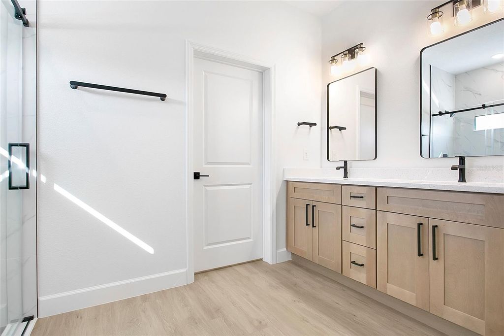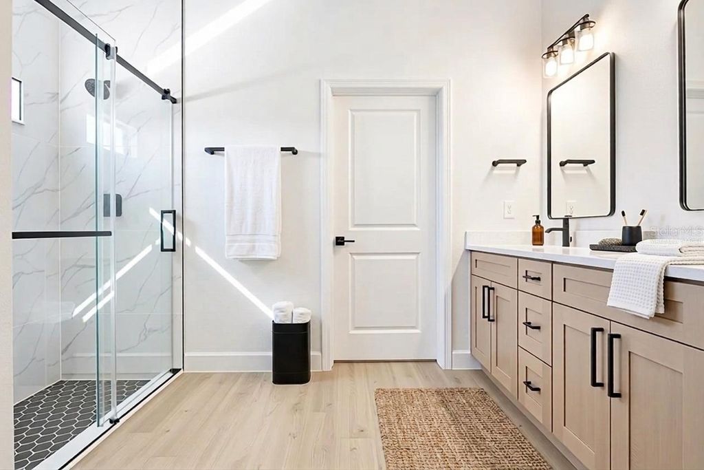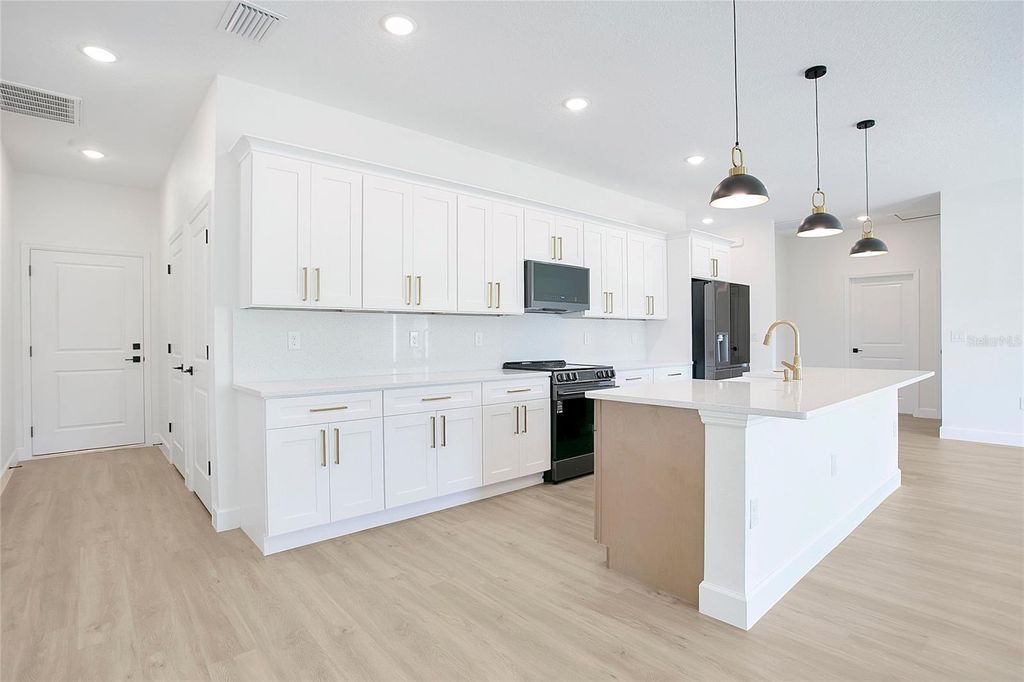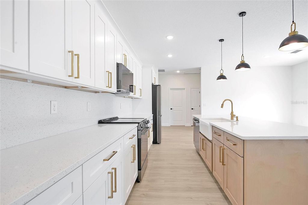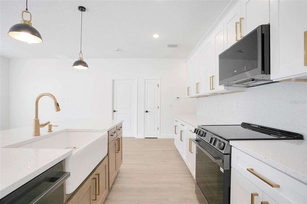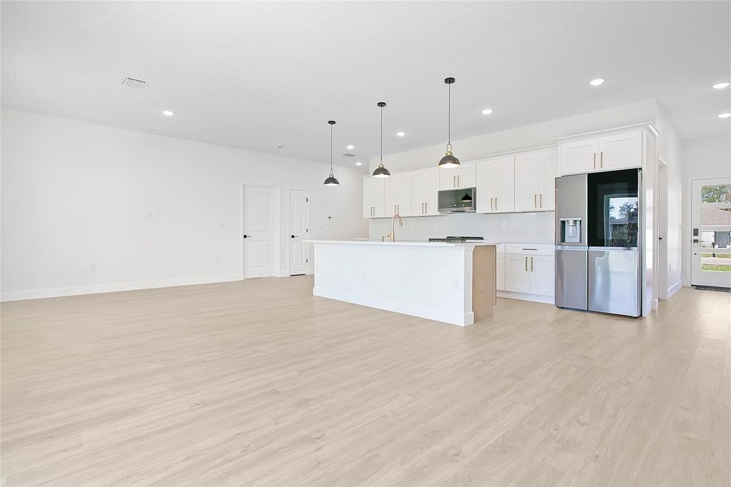 One or more photo(s) has been virtually staged. This beautifully designed brand-new 4 bedroom, 3 bathroom , 2 car garage home with a thoughtful layout and high-quality finishes is designed for both comfort and functionality. Designed and finished with intentional upgrades, the residence blends functionality, style, and everyday comfort in a refined modern elegant farmhouse aesthetic. The open-concept layout seamlessly connects the kitchen, dining, and family areas, creating a bright and inviting space ideal for both daily living and entertaining. The heart of the home is the well-appointed kitchen, featuring soft-close shaker cabinets, a striking 9-foot wood shaker island, quartz countertops, an apron-front sink, stainless steel appliances, and an 18-inch full backsplash. Brushed gold hardware and complementary pendant lighting over the island enhance the cohesive design. It's perfect for cooking and gathering with family and friends. Additional interior highlights include durable 20-MIL luxury vinyl plank flooring with exceptional scratch resistance, 5¼-inch baseboards, 9'4" ceilings that create a spacious feel, window treatments, and foam board insulation for improved energy efficiency throughout the home. The primary suite features a spacious walk-in closet and a beautifully finished bathroom with a double-sink vanity, dual vanity lighting, dual mirrors, floor-to-ceiling porcelain tile, and a tempered-glass sliding shower door with built-in niches. Secondary bathrooms continue the same elevated design elements. The landscaping was carefully planned with a mix of plant colors and seasonal bloom cycles to provide year-round visual interest and curb appeal. Conveniently located with quick access to Interstate 75 and Maricamp Road, the property is near everyday essentials, including supermarkets, restaurants, hospitals, as well as outdoor recreation. A new Publix is currently under construction in the Marion Oaks. Schedule your private tour today to experience it in person!