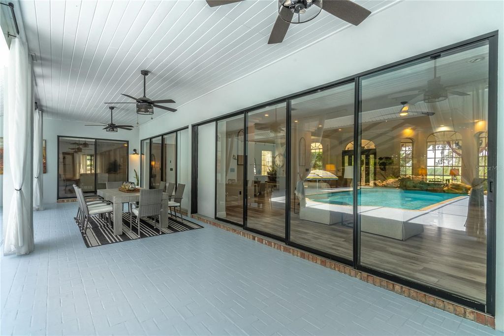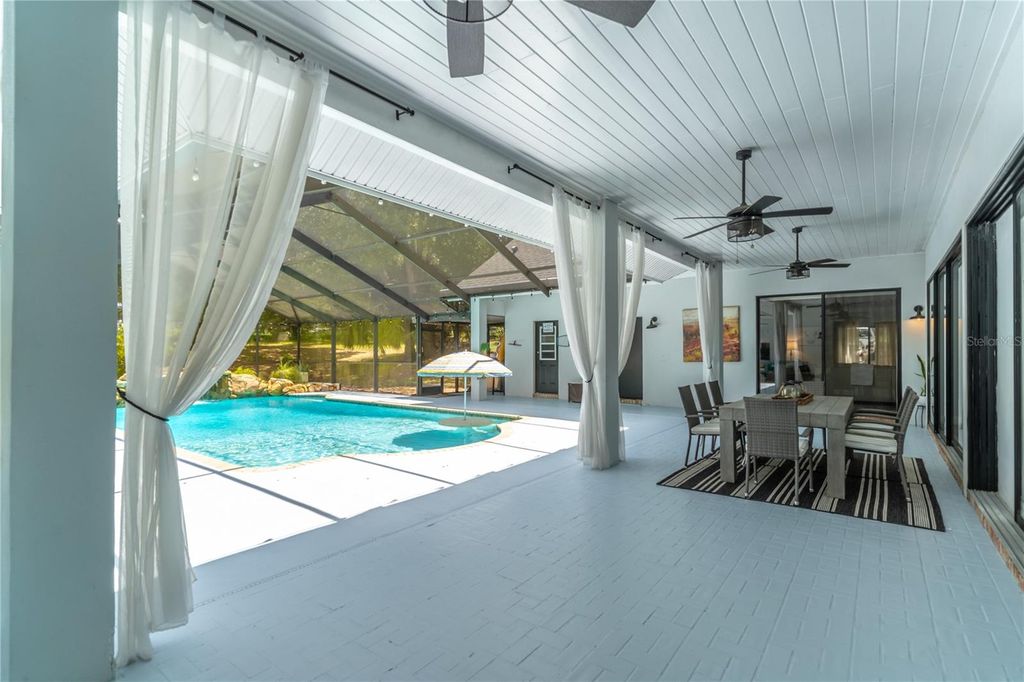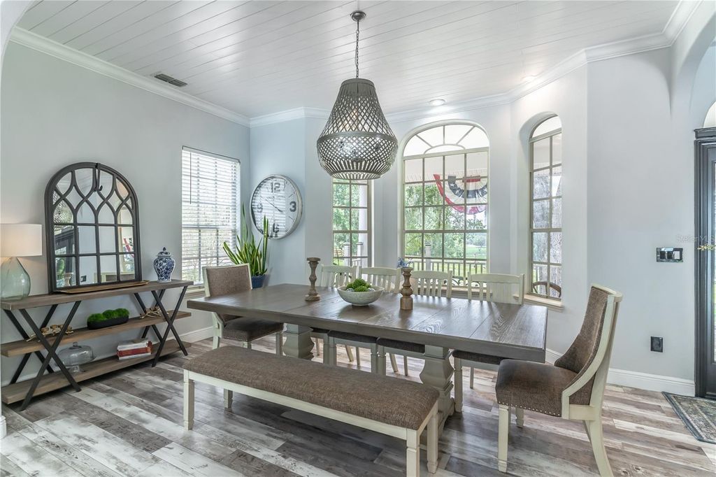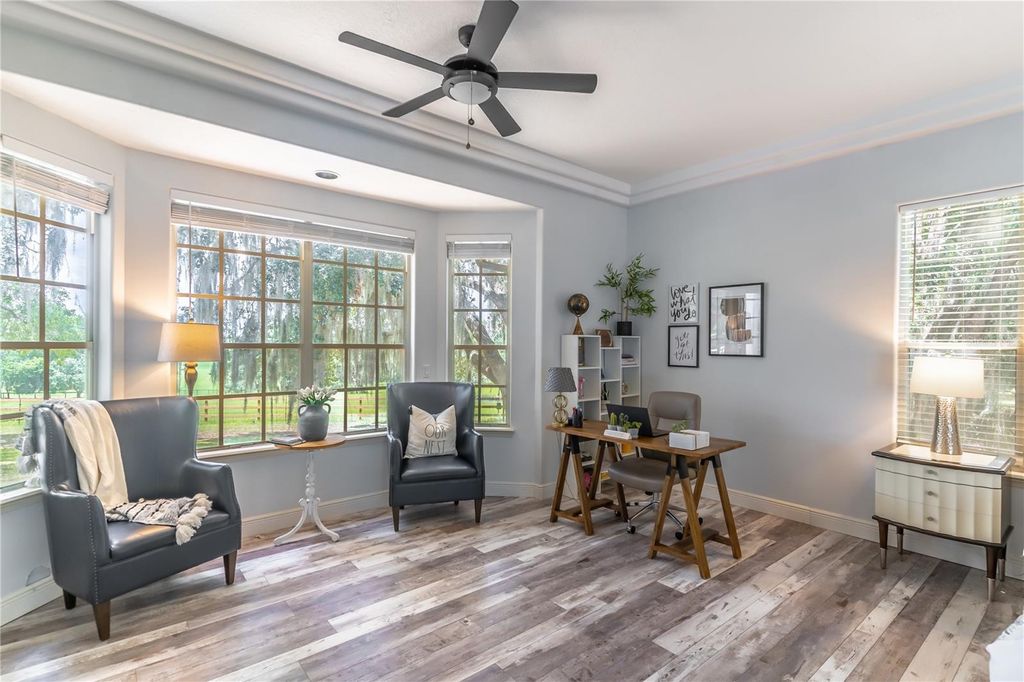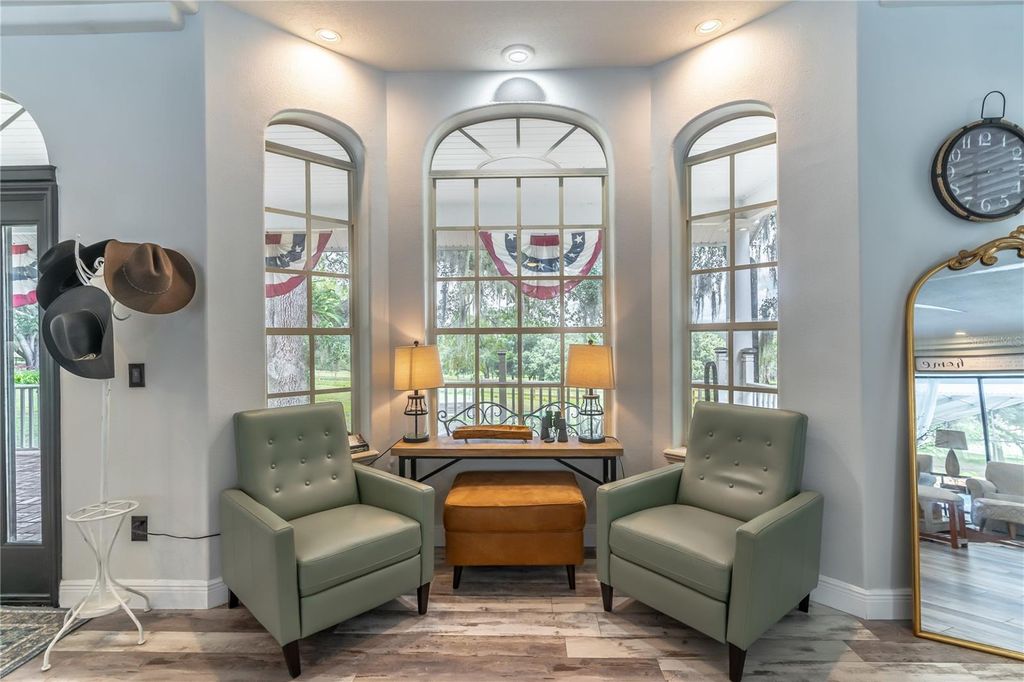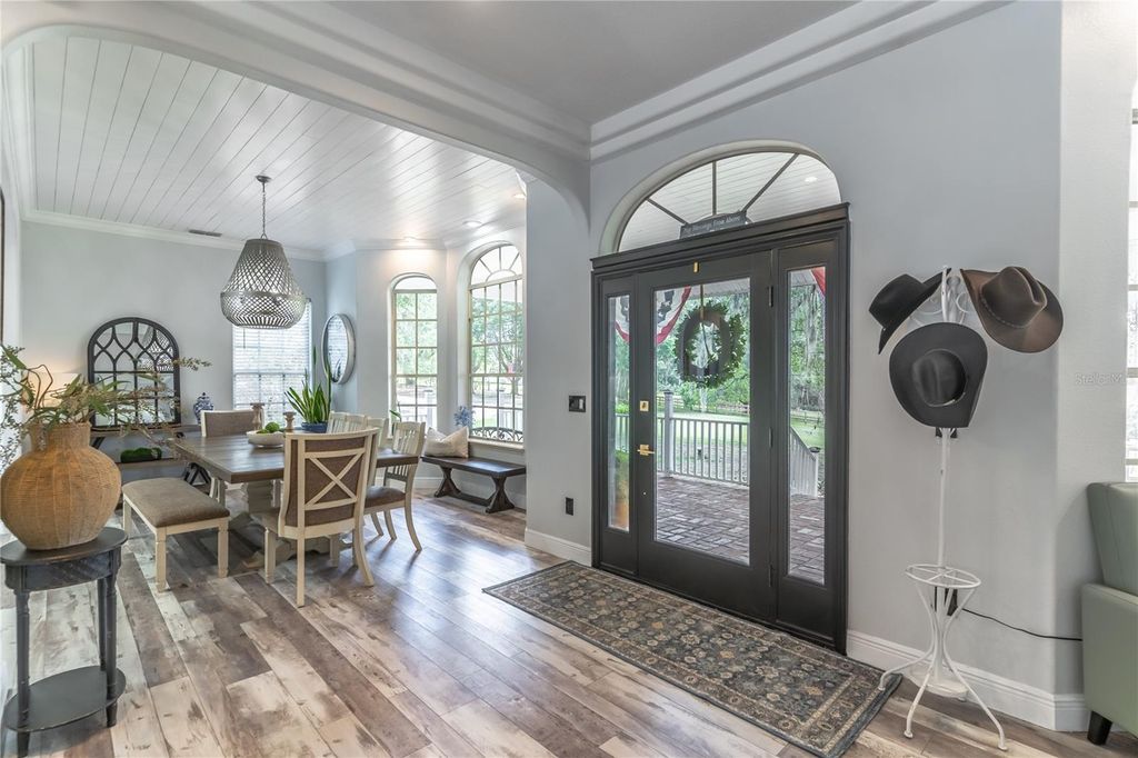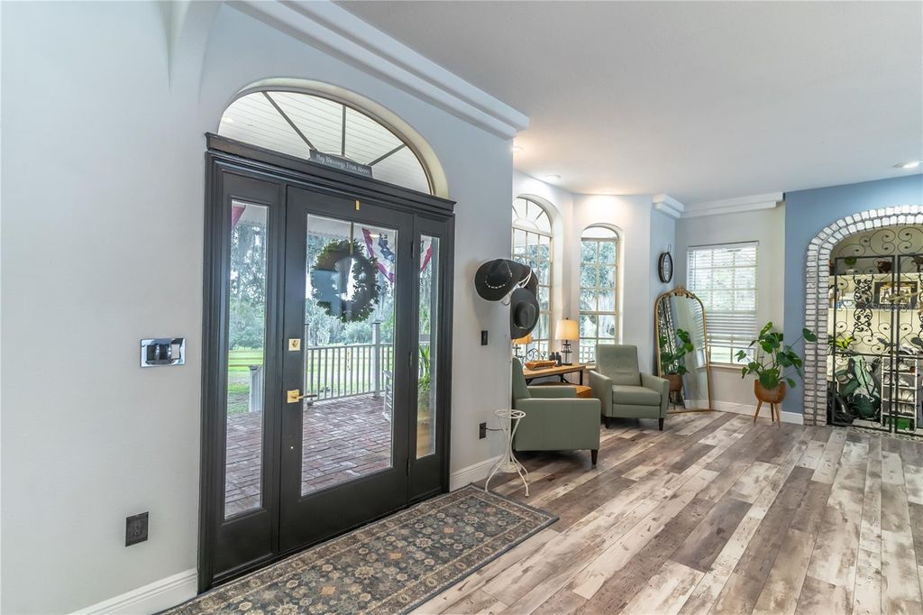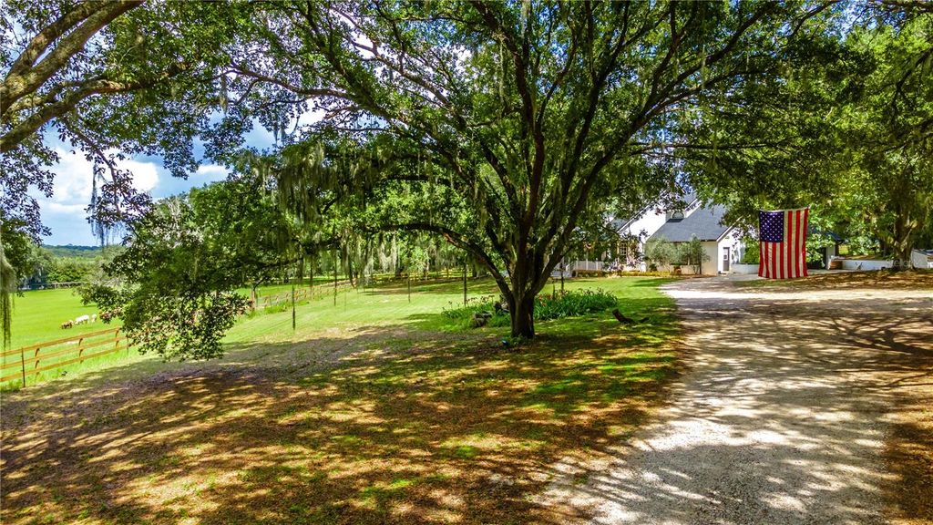PRICED BELOW APPRAISAL of $1,328000! An estate home quietly set off a private drive for added privacy on 11.27 acres near Umatilla, FL. Featuring five bedrooms, five ensuite bathrooms, plus two half baths, this home welcomes you to tranquility among mature oak trees, pastures, and an expansive front porch where you can relax and enjoy the swing. As you walk in, you are greeted by a beautifully updated home with 3,879 sq ft of living space and over 7,300 sq ft under roof. This home was extensively renovated in 2021 with a new roof, PEX plumbing, and premium flooring throughout. The kitchen and all five ensuite bathrooms are modern and thoughtfully designed. The primary suite offers true luxury, featuring built-in closets and a cozy sitting area. The ensuite bathroom is elegant, with double sinks, lighted mirrors, a walk-in shower with multiple shower heads, a private water closet, and a custom walk-in closet. The chef's kitchen features a six-burner propane stove with a pot filler, a dedicated coffee bar, farmhouse sink, stainless steel appliances, and beautiful Calacatta quartz countertops with a large island where guests can gather. This open-concept home flows seamlessly into the living room, complete with a fully functional wood-burning fireplace, double sliding glass doors, and views of the pool and lanai area. Outside, you'll find a 9-foot-deep saltwater pool with a rock water feature. Want to watch a movie? Step into the family room, slightly tucked away, which also includes an alcove ideal for an office space. The oversized laundry room features newly installed cabinetry and outdoor access. Property highlights include a new 720 sq ft pole barn, irrigated garden, mature fruit trees, and pens for chickens, sheep, and pigs. The robust infrastructure includes a 180-foot-deep well, a reverse osmosis drinking water system, and three HVAC zones. Two units were replaced in 2021, and the 4-ton unit is professionally serviced annually. Dedicated propane lines (installed in 2021) service the kitchen stove, clothes dryer, and outdoor grilling area (leased tank). The 2023 pool enhancements include a new high-efficiency variable-speed pump and complete repainting. On-site pool solar heater panels (minor repair needed) provide energy-efficient heating. The high-capacity 14-inch well system includes a 2 HP submersible pump and an 85-gallon bladder tank for consistent pressure. With no HOA or rental restrictions, this estate is ideal as a private sanctuary, hobby farm, or high-end short-term rental. Located at the "Gateway to the Ocala National Forest," it is minutes from trails and springs and just 30 minutes from Mount Dora. It is also close to the Harris Chain of Lakes, known for competitive bass fishing and accessible via public ramps. Seller is a licensed Florida real estate sales associate.