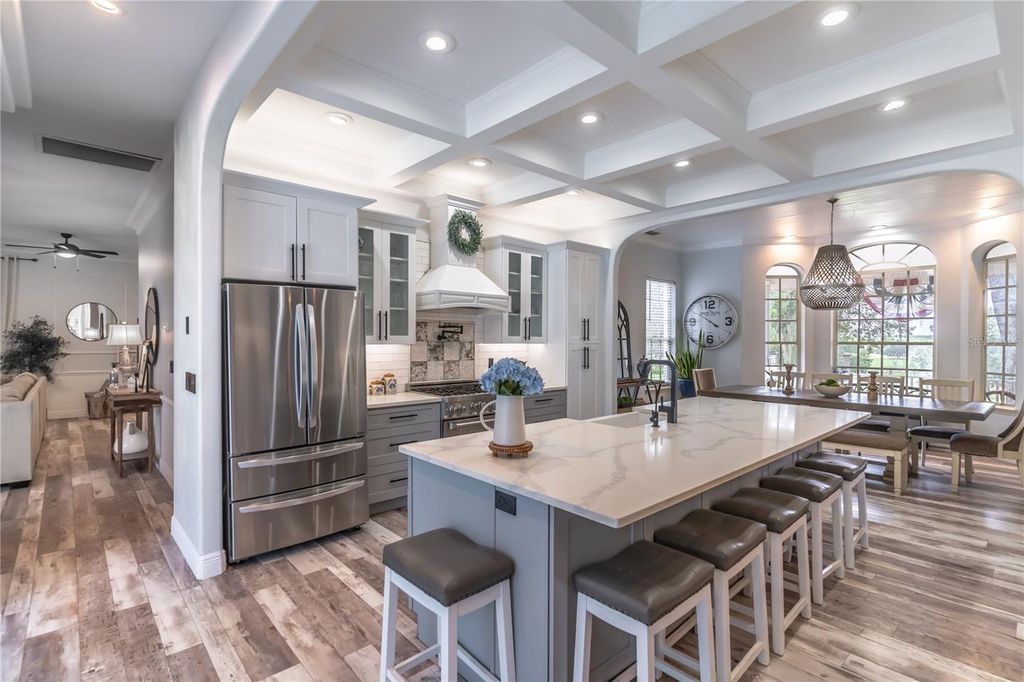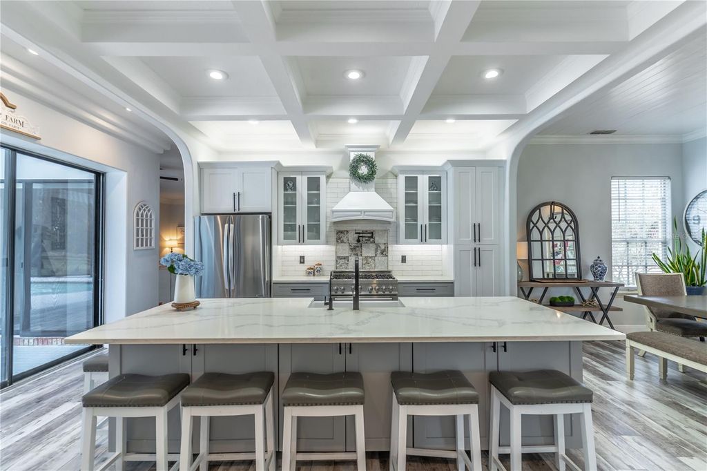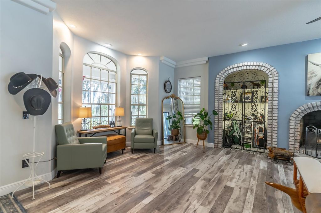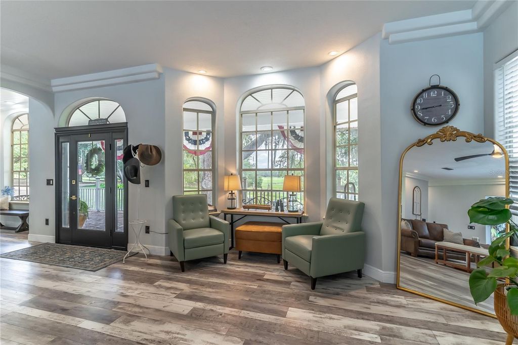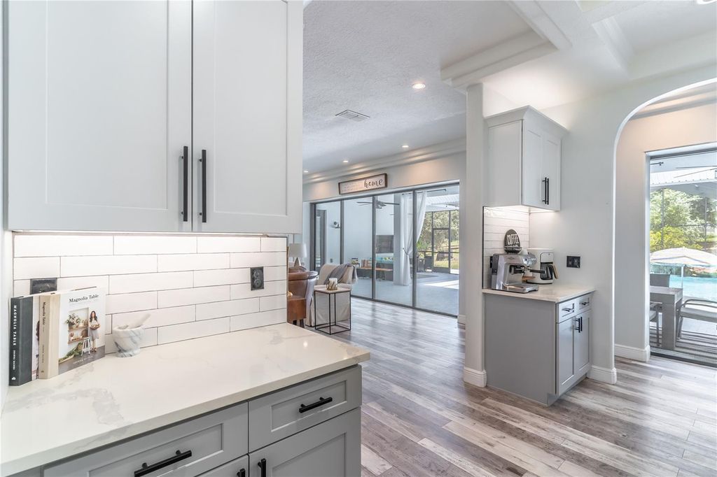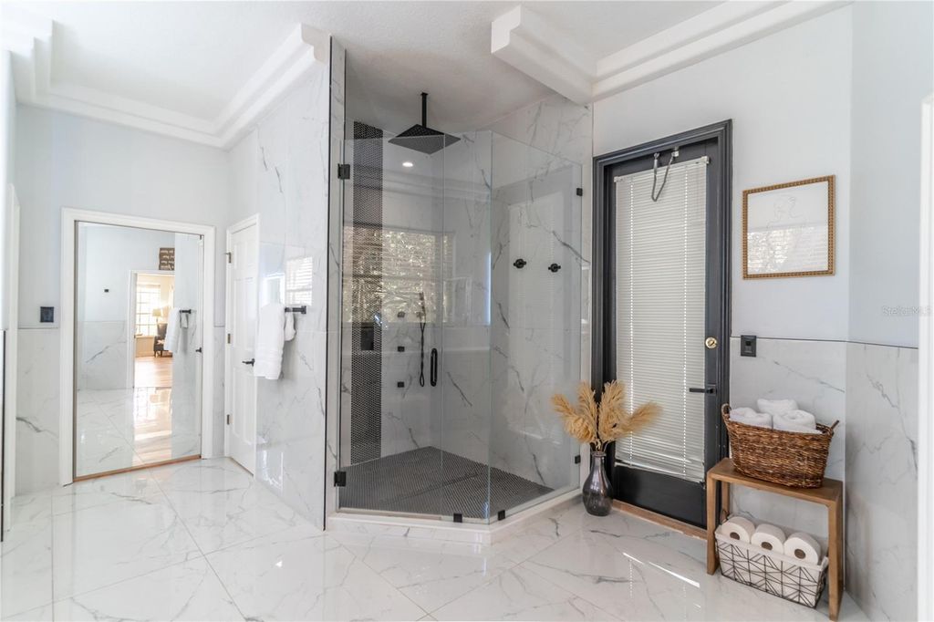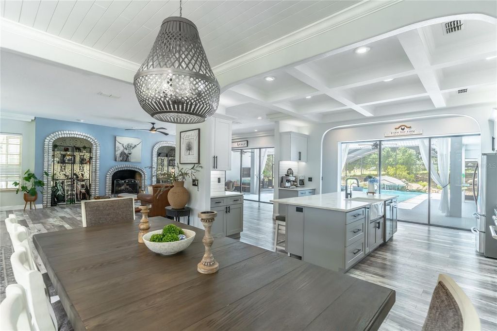 PRICED BELOW APPRAISAL of $1,328000! An estate home quietly set off a private drive for added privacy on 11.27 acres near Umatilla, FL. Featuring five bedrooms, five ensuite bathrooms, plus two half baths, this home welcomes you to tranquility among mature oak trees, pastures, and an expansive front porch where you can relax and enjoy the swing. As you walk in, you are greeted by a beautifully updated home with 3,879 sq ft of living space and over 7,300 sq ft under roof. This home was extensively renovated in 2021 with a new roof, PEX plumbing, and premium flooring throughout. The kitchen and all five ensuite bathrooms are modern and thoughtfully designed. The primary suite offers true luxury, featuring built-in closets and a cozy sitting area. The ensuite bathroom is elegant, with double sinks, lighted mirrors, a walk-in shower with multiple shower heads, a private water closet, and a custom walk-in closet. The chef's kitchen features a six-burner propane stove with a pot filler, a dedicated coffee bar, farmhouse sink, stainless steel appliances, and beautiful Calacatta quartz countertops with a large island where guests can gather. This open-concept home flows seamlessly into the living room, complete with a fully functional wood-burning fireplace, double sliding glass doors, and views of the pool and lanai area. Outside, you'll find a 9-foot-deep saltwater pool with a rock water feature. Want to watch a movie? Step into the family room, slightly tucked away, which also includes an alcove ideal for an office space. The oversized laundry room features newly installed cabinetry and outdoor access. Property highlights include a new 720 sq ft pole barn, irrigated garden, mature fruit trees, and pens for chickens, sheep, and pigs. The robust infrastructure includes a 180-foot-deep well, a reverse osmosis drinking water system, and three HVAC zones. Two units were replaced in 2021, and the 4-ton unit is professionally serviced annually. Dedicated propane lines (installed in 2021) service the kitchen stove, clothes dryer, and outdoor grilling area (leased tank). The 2023 pool enhancements include a new high-efficiency variable-speed pump and complete repainting. On-site pool solar heater panels (minor repair needed) provide energy-efficient heating. The high-capacity 14-inch well system includes a 2 HP submersible pump and an 85-gallon bladder tank for consistent pressure. With no HOA or rental restrictions, this estate is ideal as a private sanctuary, hobby farm, or high-end short-term rental. Located at the "Gateway to the Ocala National Forest," it is minutes from trails and springs and just 30 minutes from Mount Dora. It is also close to the Harris Chain of Lakes, known for competitive bass fishing and accessible via public ramps. Seller is a licensed Florida real estate sales associate.