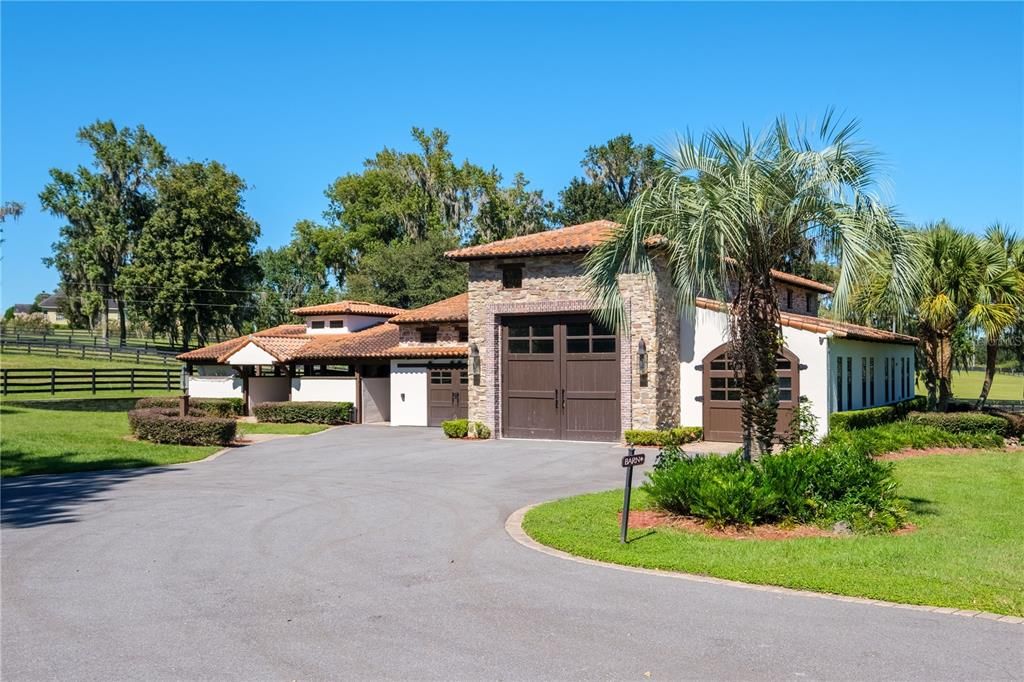 Minutes to WEC in the most desirable area of NW Ocala on Hwy 225A. This 11+ acre Tuscan inspired estate is one of the most beautiful farms in the county. From its stunning gated entrance, lighted tree lined driveway, impeccable landscaping, rolling hills, pond, and more will leave you in awe. From the moment you enter the drive you'll be greeted by stunning Live Oaks surrounding the 2 bedroom 2 bathroom cottage with an ivy walled courtyard. Cottage is very upscale with plenty of living space, gourmet kitchen, laundry room, and beautiful bathrooms. The multi terraced courtyard features pavers throughout, amazing landscaping & lighting, perfect for relaxing under the oaks or entertaining your friends. At the end of the tree lined drive you'll come to a hilltop paradise. There is a beautiful pond with fire pit at the base of a spa like pool setting equipped with a pool house perfect for entertaining with amazing hilltop views. On the other side of the pond is a lavish Carriage house. Attached is a stunning 4 stall barn with brick pavers, custom euro stall fronts, and tongue & groove ceiling. The large carriage doors open to a fully finished space that could be perfect for living space, game room, an art studio, or a garage that would leave your friends speechless. There are 3 bedrooms and 3.5 bathrooms, plus an office, and living spaces. This farm is a must see.