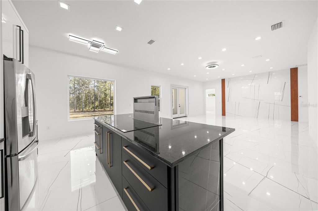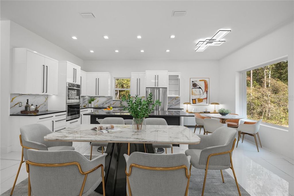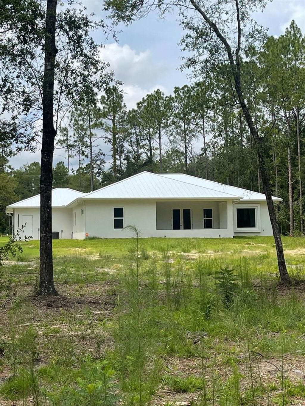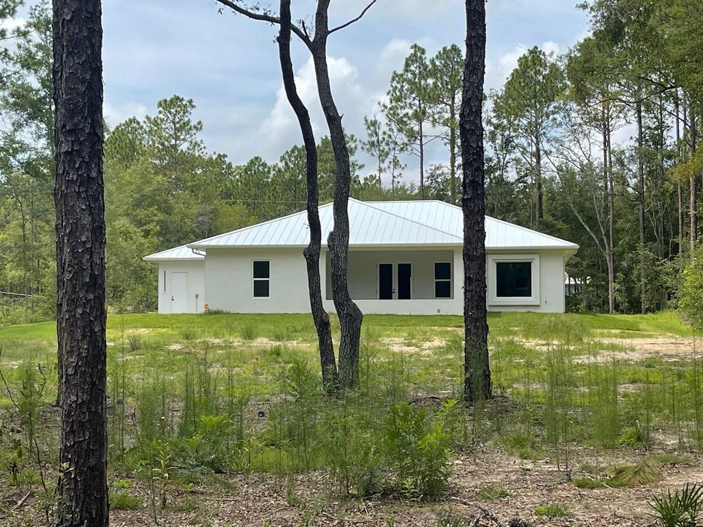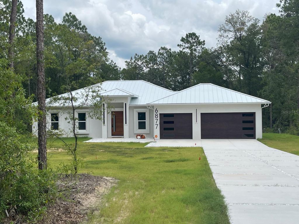 One or more photo(s) has been virtually staged. PRICE REPOSITIONING - ICF -INSULATED CONCRETE FORMS- HOME that offers improved energy efficiency, thermal insulation, hurricane resistant, acoustic insulation with impressive strength and reliability. This is a New Spec Home for the growing Ocala area. Located in one of the most tranquil subdivision of Marion County, Rolling Hills, 15 minutes from the WEC, near the main National Parks/Springs of Central Florida, in a 1.54 acres lot. Built with 150 ft set back from the main road, this 2,284 sq ft interior living area + 880 sq ft of insulated garage home with standing seam metal roof, has 4 bedrooms, 3 bathrooms, an open concept kitchen / dining-room / living-room / entertainment area, large laundry/mud/utility room with added tub/sink, 3 vehicles garage, plenty of closet space. Very high ceiling of almost 11' tall and 4'x4' polished Sahara Spanish tile throughout the entire house with all interior doors of 8' of solid wood and low energy windows, custom designed kitchen with 112" x 46" granite island and countertops, stainless steel farmhouse apron front kitchen sink, GE series appliances, double oven, double door refrigerator, wine cooler, induction cooktop, downdraft ventilation system, Samsung Washer/Dryer. Interior Lighting: 28 pieces recessed lighting LED 6"x6" square 6500K on dimmers throughout. Exterior Lighting: pencil LED lights on exterior columns and front and back of garage + LED ceiling light and Spot lights/Sensors on all 5 corners of the house. The beautiful designed driveway leads you to the 4'x8' solid mahogany front door. For the exterior around the house: hydro-seeding system to grow lawn from seeds, greatly beneficial. Irrigation system is in place.6" Seamless Gutters with full Leaf Guards throughout; includes underground drain lines. Electrical exterior connection for generator (Stub Out) in place.