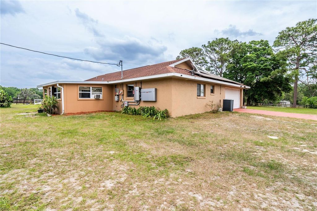 Welcome to your private haven, within a FOUR-MINUTE drive from The World Equestrian Center. This stunning 6.6+ acre flag lot masterfully combines privacy and convenience, enveloped by mature trees and fully fenced for your peace of mind. Step inside this beautifully appointed three-bedroom, two-bathroom home, built in 1991, featuring an inviting open floor plan that flows seamlessly. Host formal dinners in the airy and open dining room, unwind in the air-conditioned back porch (formerly a fourth bedroom), and enjoy the oversized workshop and RV garage with hookups for all your vehicles and projects. A 3 stall pole barn and A unique air-conditioned shed offers additional storage or a comfortable workspace. With a recently updated shingle roof, just 8-9 years old, this home ensures both luxury and protection. Nestled in Flood Zone X, this property is a safe haven and an exceptional opportunity for discerning buyers. Don't miss your chance to claim this exquisite haven as your forever home! *Solar panels to be paid off at closing by Seller*