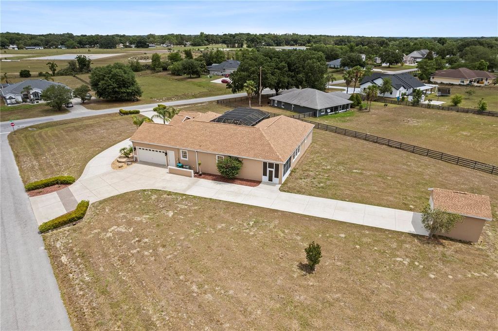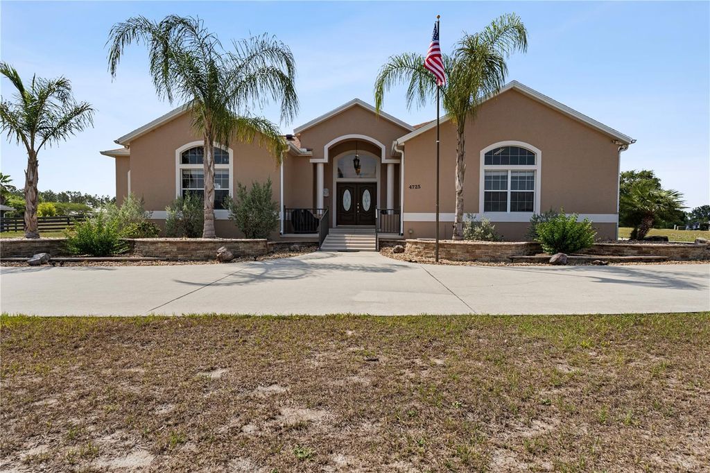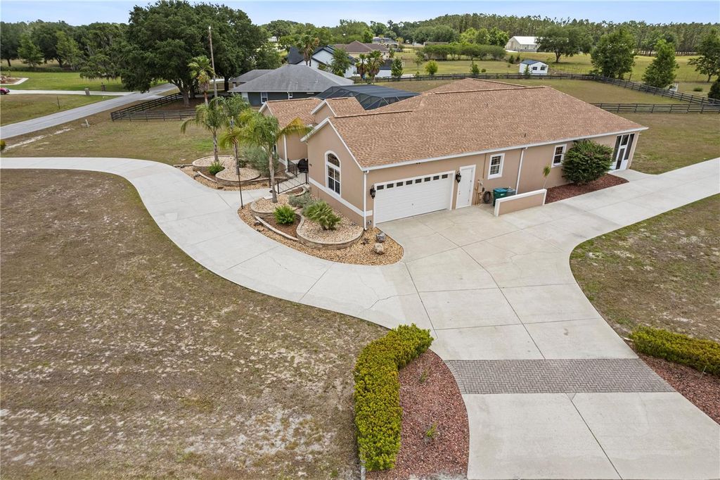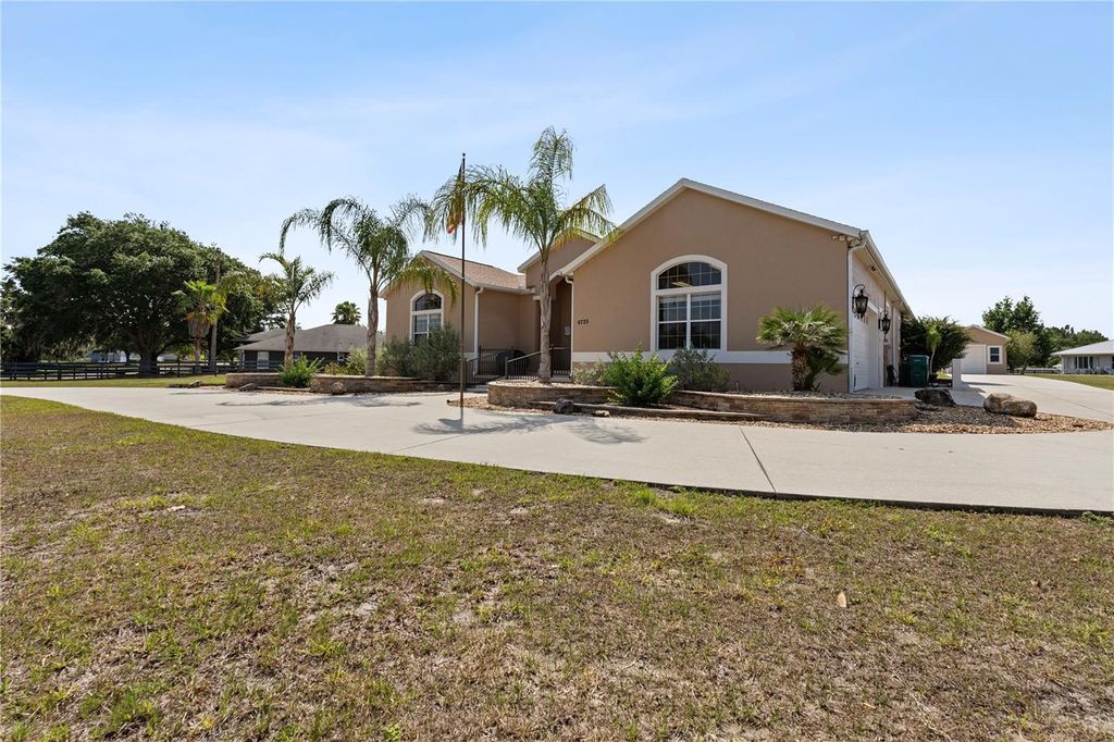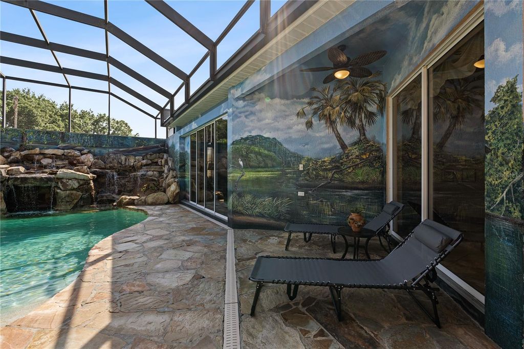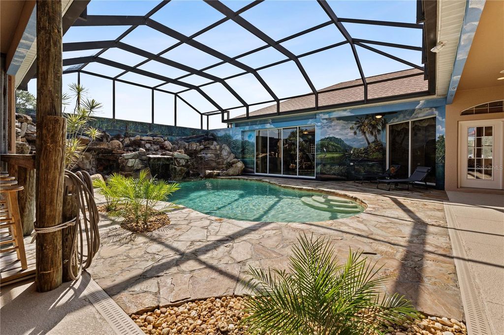 Looking for the Extraordinary? This Custom Built home makes a dramatic impression. As soon as you enter, the impeccable design of this home will have you in awe. Step in to your tropical oasis! The pool, rock waterfalls, cave/spa and tropical mural will immediately have you relaxed. The elegant Chef's kitchen is made of the highest quality finishes including solid wood cabinets, solid surface countertops and elegant lighting. The living room offers a cozy place to unwind and includes tray ceilings and brand new carpet. Beautiful ceramic tile throughout the remainder of the home. The primary bedroom is a luxurious retreat, featuring tray ceilings, an amazingly spacious walk-in closet with built-in shelves and drawers, providing ultimate storage and organization. The ensuite bath feels like a personal spa, complete with a stunning jacuzzi tub with 21 jets, along with a double walk-in shower. Surround sound through-out the home, including the courtyard! The inside the home offers a gorgeous view of the pool and outdoor resort area through a wall of sliding glass pocket doors. The third bedroom/full bath has it's own private entrance from the courtyard. Perfect for a guest or in-law suite. New Roof, hot water heater and exterior paint in 2024! Extensive list of features and updates available. One acre corner lot with 14x14 detached block workshop/garage. Located in the highly desired neighborhood of Fox Hollow, minutes from The Villages! Welcome to living in comfort and style - this home is a 'must see'! Call today for your personal tour.