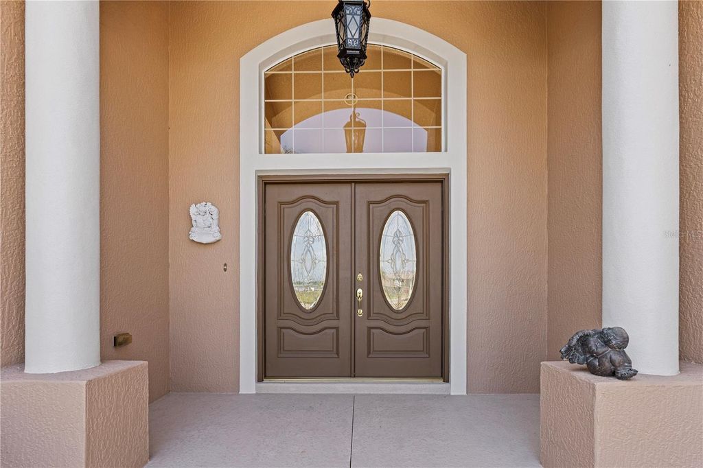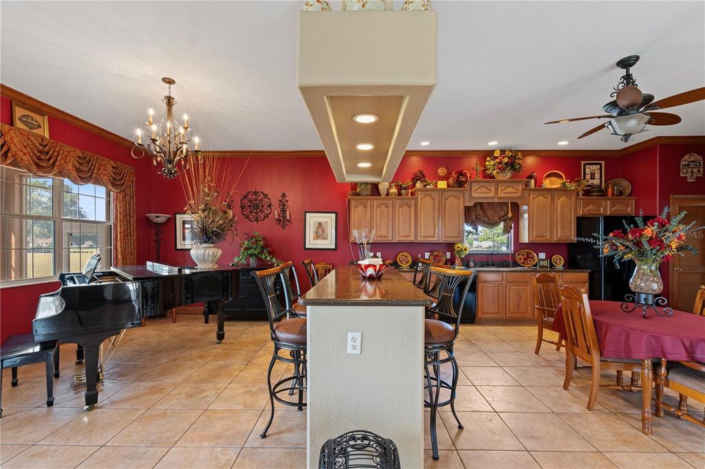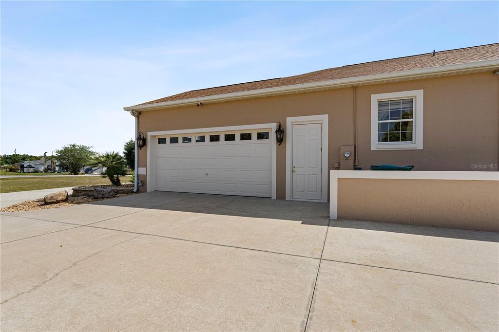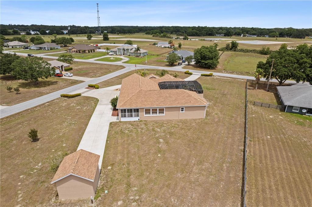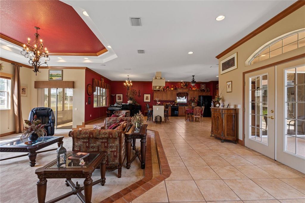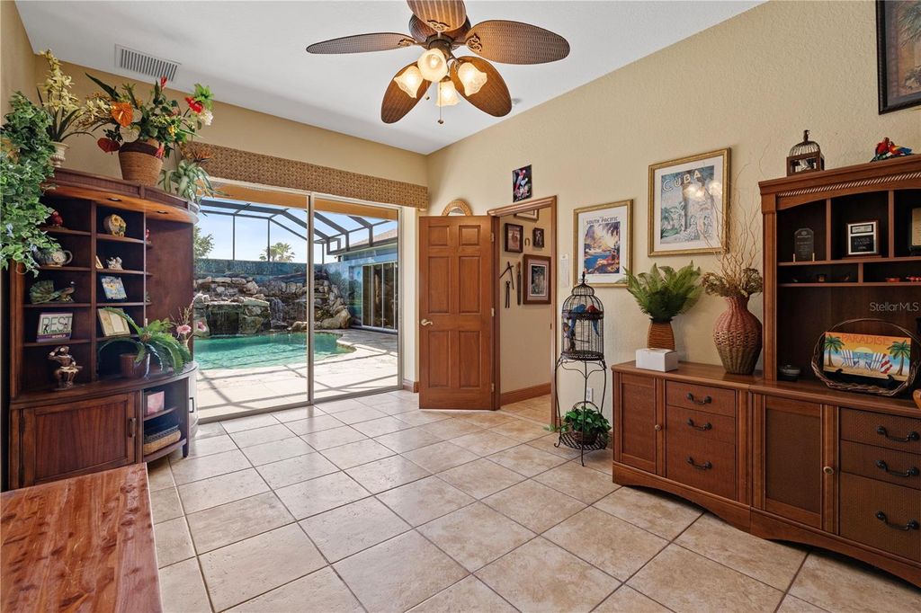 Looking for the Extraordinary? This Custom Built home makes a dramatic impression. As soon as you enter, the impeccable design of this home will have you in awe. Step in to your tropical oasis! The pool, rock waterfalls, cave/spa and tropical mural will immediately have you relaxed. The elegant Chef's kitchen is made of the highest quality finishes including solid wood cabinets, solid surface countertops and elegant lighting. The living room offers a cozy place to unwind and includes tray ceilings and brand new carpet. Beautiful ceramic tile throughout the remainder of the home. The primary bedroom is a luxurious retreat, featuring tray ceilings, an amazingly spacious walk-in closet with built-in shelves and drawers, providing ultimate storage and organization. The ensuite bath feels like a personal spa, complete with a stunning jacuzzi tub with 21 jets, along with a double walk-in shower. Surround sound through-out the home, including the courtyard! The inside the home offers a gorgeous view of the pool and outdoor resort area through a wall of sliding glass pocket doors. The third bedroom/full bath has it's own private entrance from the courtyard. Perfect for a guest or in-law suite. New Roof, hot water heater and exterior paint in 2024! Extensive list of features and updates available. One acre corner lot with 14x14 detached block workshop/garage. Located in the highly desired neighborhood of Fox Hollow, minutes from The Villages! Welcome to living in comfort and style - this home is a 'must see'! Call today for your personal tour.