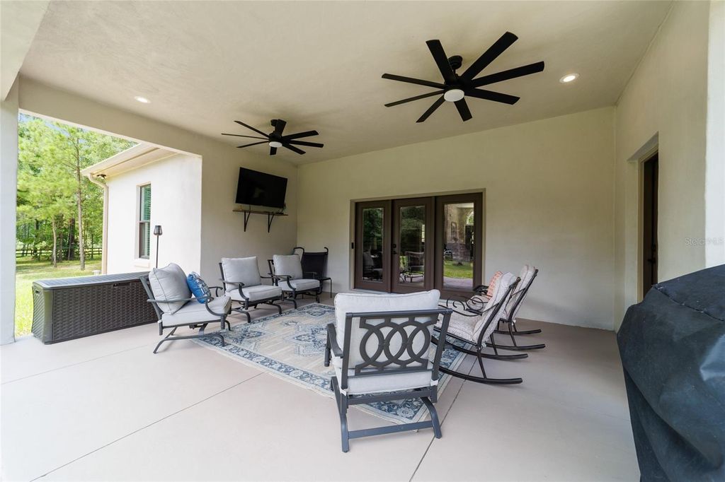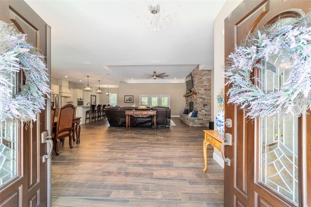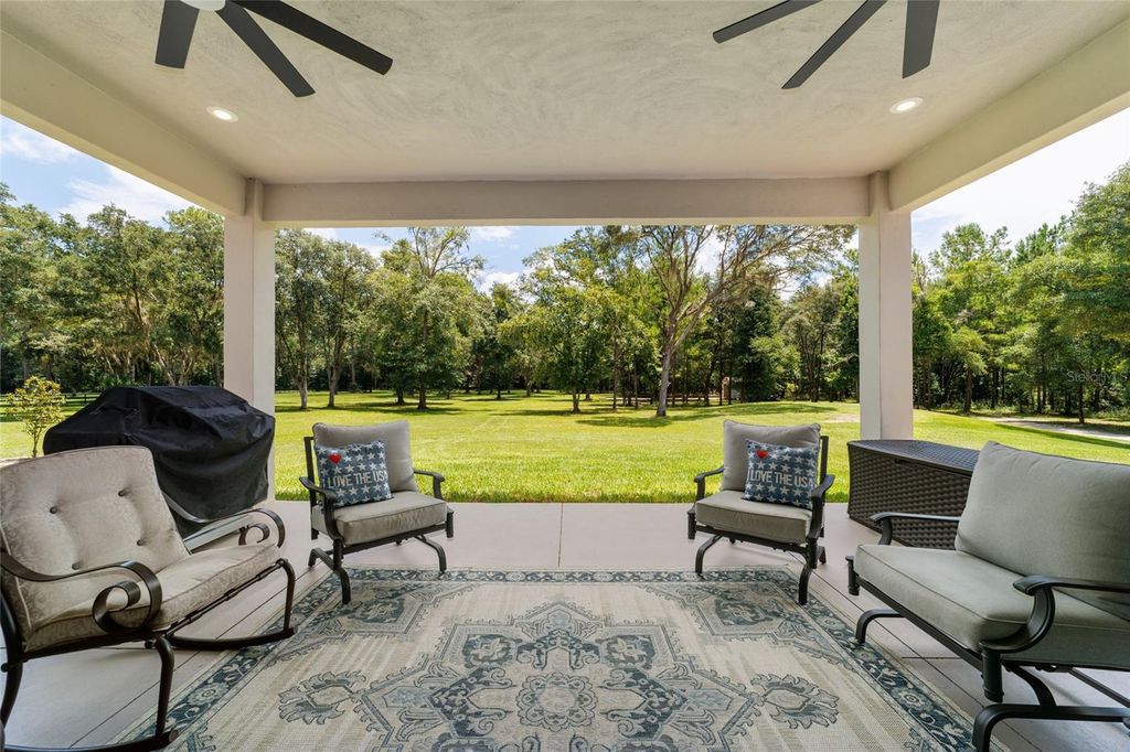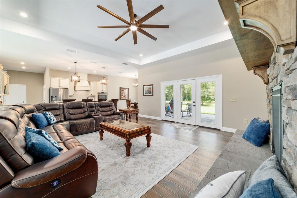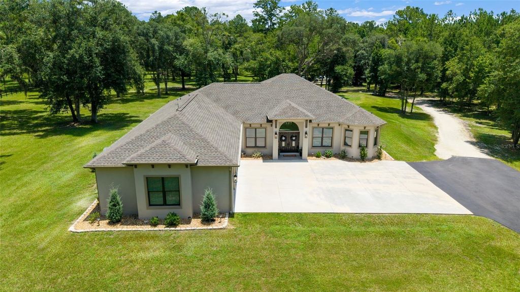 Welcome to this beautifully designed 2022 custom home, nestled on 7.33 private acres in The Village at Hidden Lakes, a gated equestrian community where deer and turkey often wander through the yard and peaceful mornings start with nature right outside your window. This is one of the largest lots in the neighborhood, offering the perfect combination of tranquility, privacy, and potential for your dream farm or country retreat. As you arrive, an automatic iron gate opens to a winding asphalt driveway, leading you beneath scattered oaks and past lush, green grass to the front entrance. The home is thoughtfully set back on the property, framed by mature trees and beautifully landscaped with river stone accents. Whether you plan to bring horses or simply want room to breathe, this property delivers the lifestyle you've been dreaming of. Step inside and you'll immediately appreciate the open, inviting floor plan designed for both comfortable living and effortless entertaining. With 2,597 square feet of living space, this home feels bright and airy, thanks to expansive Pella windows that fill the home with natural light. The living room features wood-look tile throughout, and a stunning floor-to-ceiling stacked stone gas fireplace with a remote thermostat, elevated hearth, and custom mantle"”perfect for cozy evenings at home. The main living space also includes a dedicated area for your dining room table, allowing for seamless gatherings and family meals. The chef's kitchen is a standout, complete with soft-close custom cabinetry, granite countertops, a gas cooktop, stainless steel appliances, and a coffee station with extra cabinetry and counter space. An oversized kitchen bar is perfect for casual breakfasts, while a separate dining nook overlooks the backyard, creating the perfect spot for morning coffee with a view. A private office with French doors is located just inside the home near the main living area, offering a quiet space to work from home without sacrificing convenience or flow. The split floor plan provides privacy for family and guests. The master suite is tucked away on one side of the home, featuring double closets and a spa-style bath with dual vanities, a deep modern soaking tub, and a walk-in tiled shower. On the opposite side, two guest bedrooms share a beautifully finished bath. An additional half bath and a well-appointed laundry room with cabinet and counter space are conveniently located near the 1,006 sq ft 3-car insulated garage, complete with insulated doors for comfort and efficiency. All interior doors are 36" wide, making the home handicap accessible, and 10' ceilings with 11' tray accents add a sense of space and light throughout. French doors lead from the living room to the covered back porch, where you'll find a ceiling fan and TV hookup"”the perfect place to unwind in the evenings while watching the local wildlife. From here, step into the expansive backyard where you can easily add barns or pastures to create your own horse farm, or simply enjoy the serene, park-like setting with scattered oaks and lush grass. A storage shed is included for yard equipment, and a list of select furniture is available for purchase with the home. Conveniently located just 20 miles to I-75, 19 miles to the World Equestrian Center, 9 miles to HITS, 7 miles to Williston, 26 miles to Gainesville, and 20 miles to Ocala, this is the perfect blend of luxury living, rural charm, and modern comfort.