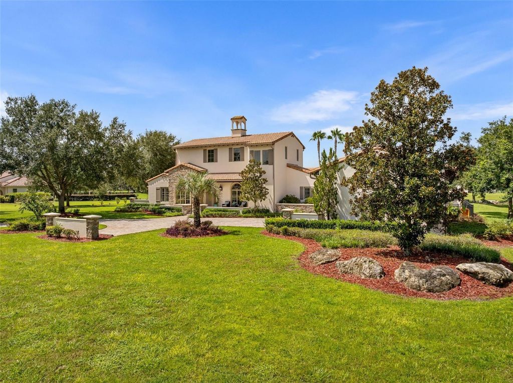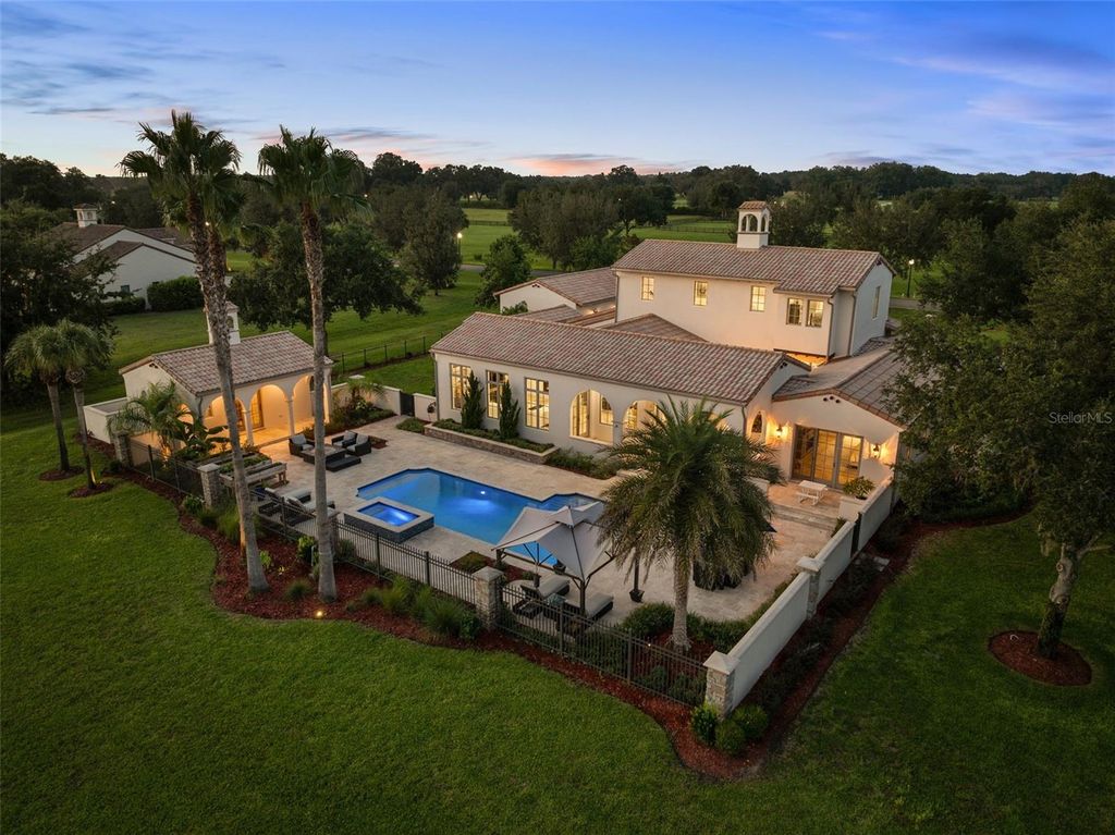Welcome to this stunning custom-built estate in the exclusive gated community of Bel-Lago, meaning "beautiful lake" in Italian. Bel-Lago is a premier lakefront and equestrian enclave in the heart of Ocala's horse country. Surrounded by over 8,000+ acres of protected state preservation and offering a private internal trail system, this community is the ultimate blend of luxury, nature, and privacy. Originally built as the developer's personal residence, this Modern Mediterranean masterpiece is strategically positioned for maximal lakefront views from nearly every room, with unique details and elevated finishes not found in other homes throughout the community. Spanning over 4,000+ sqft of thoughtfully designed living space, with an additional detached guest casita, this home is a true original. This residence features a total of 4 bedrooms, a private dining room or den, 3.5 bathrooms, and a 3-car garage. The 500+ sqft detached guest casita offers a 1 bedroom/1 bathroom suite with kitchenette, currently enjoyed as a home theater for relaxing movie nights. Showcasing a seamless blend of timeless craftsmanship and modern design, architectural highlights include an arched impact-rated glass front door, Travertine and white oak hardwood flooring, soaring ceilings with coffered and tray detailing, custom archways, and rustic wooden beams. Imagine hosting friends and family with your whole-home surround-sound system, private internal courtyard with fountain, and brand-new (2025) full-scale outdoor kitchen with refrigerator, reverse osmosis ice maker, dishwasher, and high-end gas grill. Enjoy a refreshing swim in the remodeled heated saltwater pool and spa as you revel in spectacular year-round sunsets. Situated on 1.40 meticulously landscaped acres dotted with Live Oaks and fruit-bearing citrus trees, this property offers expansive views of the fully-stocked lake, frequented by a wide array of waterfowl and even majestic Bald Eagles - an idyllic natural bird sanctuary in your own backyard. And for equestrian enthusiasts, a rare opportunity awaits: the 3.85-acre equine parcel directly across the street is also available for purchase. It includes a custom 2-stall shed row block barn, built in 2022 (MLS #OM698306). Please inquire for full package pricing and details. Here in this Mediterranean-inspired haven, where thoughtful design meets breathtaking natural beauty, you'll discover the best of both worlds. Schedule your private tour today and experience the magic for yourself.