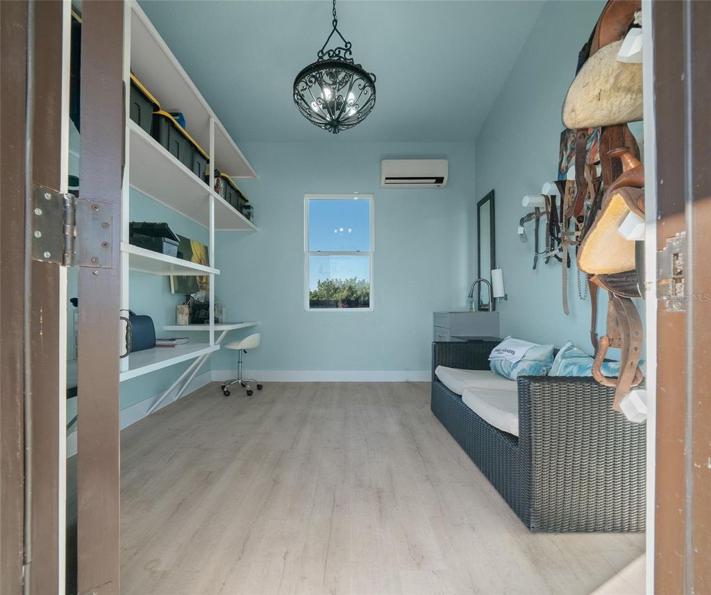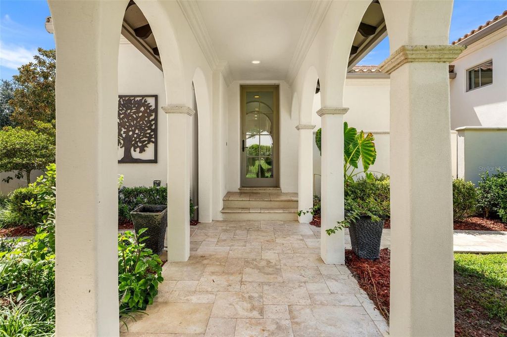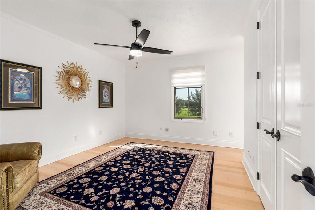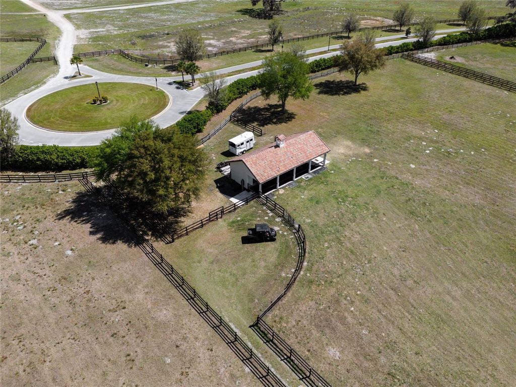 Welcome to a one-of-a-kind equestrian estate in Bel-Lago, the exclusive gated community whose name translates to "beautiful lake" in Italian. Nestled in the heart of Ocala's horse country, Bel-Lago is a premier enclave offering lakefront and equestrian properties. Here, a rare opportunity awaits: a lakefront estate paired with a buildable equestrian lot, complete with a custom 2-stall block barn built in 2022. Bring your horses, and enjoy the stunning lakefront views. Originally crafted as the developer's own residence, this Modern Mediterranean masterpiece was designed to capture sweeping lake views from nearly every room. Every inch of its 4,000+ sqft is marked by distinctive details and elevated finishes, even including a 500+ sqft detached guest casita. The main home offers 4 bedrooms, 3.5 bathrooms, a private dining room or den, and a 3-car garage. The garage features custom shelving and a Culligan water system with charcoal filters. The casita provides a 1-bedroom, 1-bathroom suite with kitchenette, currently enjoyed as a home theater. Step inside to discover timeless craftsmanship paired with modern luxury: an arched impact-rated glass front door, soaring ceilings with coffered and tray detailing, Travertine and white oak floors, rustic beams, and graceful archways - all accentuated by a modern white, black, and gold color palette. Entertain with ease with a whole-home surround-sound system, a private courtyard with fountain, and a brand-new (2025) outdoor kitchen fully equipped with refrigerator, reverse osmosis ice maker, dishwasher, and high-end gas grill. Outdoors, enjoy a heated saltwater pool and spa as the sun sets across the lake. Set on 1.40 acres of manicured grounds shaded by Live Oaks and citrus trees, the property overlooks a fully stocked lake that attracts waterfowl and even Bald Eagles - your own private bird sanctuary. On your spacious equine lot, you'll find a buildable homesite, creosote 3-board fenced paddock, and an impressive 2-stall barn. Designed with durability and functionality in mind, the barn features inset rubber pavers, metal barn boards, sealed LED lighting, and a Hardie board ceiling. Each 12x12 stall includes custom steel doors, Nelson automatic waterers, and sloped flooring for a no-shaving and easy-drain environment. Behind an arched wooden door, an A/C tack room and office with custom shelving awaits, along with an A/C feed room with half bath. A wash rack and fly spray system complete the setup. With a blend of elegance, functionality, and exclusivity, this estate offers the very best of both worlds - waterfront serenity and equestrian excellence - in one of Ocala's most coveted communities.
