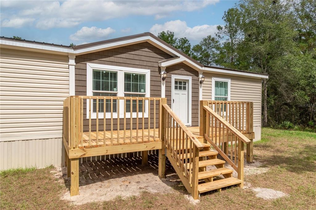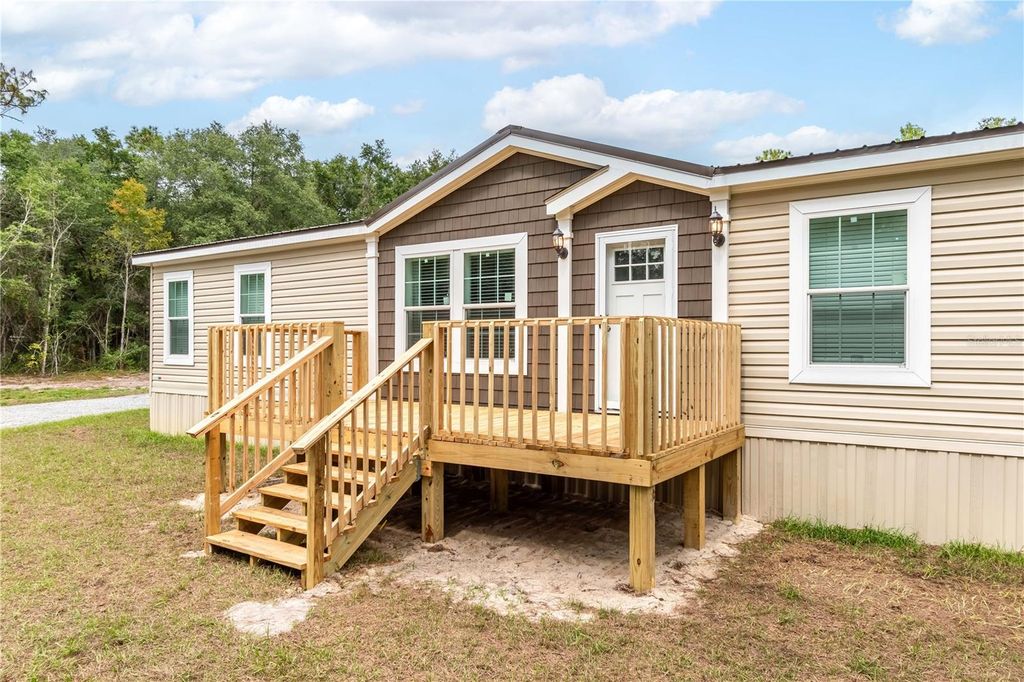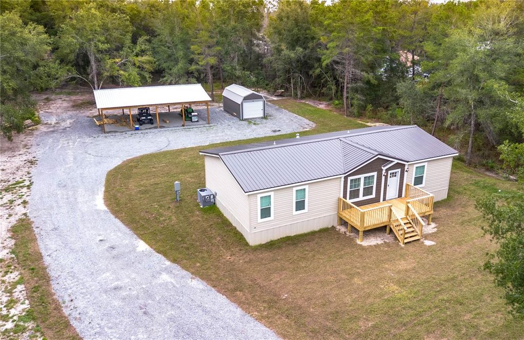 Freshly completed and never occupied, this pristine 2024 manufactured home is ready for its first owner! Fenced and gated on over 3 acres in the peaceful Island Lake Acres community, the property is offered fully furnished with brand-new furnishings throughout, perfect for a seamless move-in or immediate rental opportunity. The 3-bedroom, 2-bath split-bedroom layout offers 1,404 square feet of thoughtfully designed living space. Inside, you'll find a bright open floor plan that features luxury vinyl flooring, lots of natural light, and modern finishes that combine comfort and style. The kitchen includes an eating nook and comes equipped with stainless steel appliances, a large center island with breakfast bar, and ample cabinet and counter space. A separate laundry area with washer and dryer is also included. Step outside to enjoy expansive outdoor living spaces, including a generous 10 x 32' rear deck ideal for entertaining, grilling, or simply enjoying the quiet country setting, and an 8 x 18' front deck perfect for making a first impression. The property's layout is ideal for those seeking room to breathe, create, or expand. A pole barn with water and power service is in place, including multiple electrical outlets, ideal for workshop use, vehicle or equipment storage, or future hobby farming. An additional storage shed also offers water and electrical hookups, making it highly adaptable for a range of uses. Utilities are fully connected, with a private well, septic system, electricity, and high-speed internet access available, and the zoning allows for flexibility with no HOA or deed restrictions to limit your plans. Located within walking distance of Island Lake and Pegram Lake, this property is an ideal option for those looking to spend time on the water. Lake Ocklawaha is also a short drive away, opening up larger options for fishing, boating, and exploration. This home offers a rare mix of modern convenience and rural privacy perfect for full-time living, a seasonal retreat, or even a fully equipped weekend getaway. With ample space, upgraded features, and all the essentials already in place, this is Florida country living at its most comfortable and convenient!