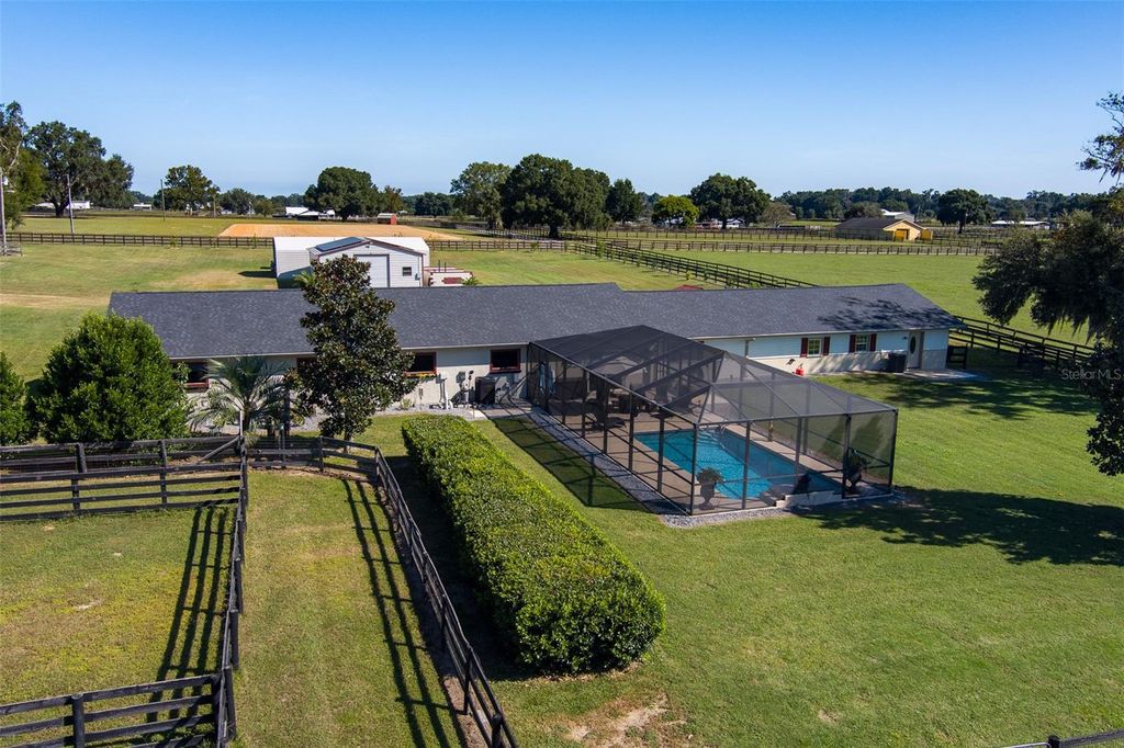 Welcome to Fox Squirrel Farm, a beautifully maintained 10-acre property located in the Cardinal Hill Complex in North Ocala. Just 20 minutes from the World Equestrian Center, this fully fenced farm offers a peaceful, private setting shaded by majestic oak trees and accented with fruit trees and lush green paddocks. The property features a 7-stall concrete block barn, thoughtfully connected to the main residence and equipped with individual stall fans, hot water, and a full-house generator that powers both the home and barn. The charming 2-bedroom, 1-bathroom home boasts parquet and tile flooring, and opens to a screened outdoor lounge area through sliding glass doors. Perfect for relaxation or training, the backyard features a 5-foot deep endless lap pool with heating and cooling capabilities. You'll also find a workshop with attached wash racks, an equipment pole barn, and a 1-car garage. Solar power adds to the efficiency and sustainability of this well-appointed farm, making it a rare opportunity for equestrian enthusiasts seeking both convenience and tranquility in the heart of Marion County.