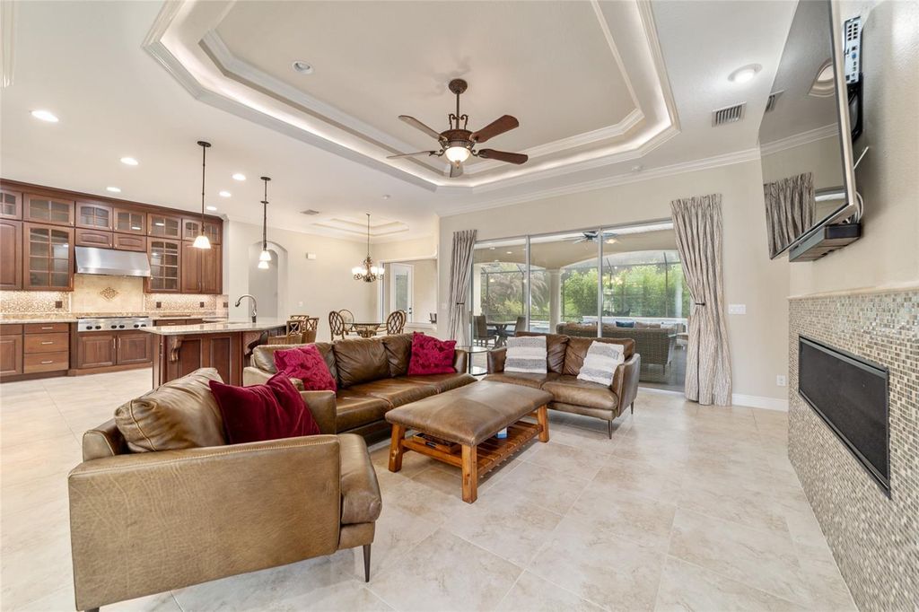 This stunning 4-bedroom, 3-bath pool home in Bellechase offers over 2,900 square feet of beautifully designed living space and was built in 2017 with modern comfort in mind. The thoughtful split floorplan provides both privacy and flow, making it ideal for everyday living and entertaining.The heart of the home is the chef's kitchen, featuring custom wood cabinetry, granite counters, nice appliances, gas range and an oversized island with seating that opens to the spacious living area. Elegant tray ceilings, crown molding and abundant natural light add to the home's inviting feel. The owner's suite includes a luxurious bath with dual vanities, soaking tub, and walk-in shower, while additional bedrooms and baths are well-appointed for family or guests. Step outside to your private oasis with a screened-in pool and spa with water features, set against a lush backdrop of mature landscaping for added privacy. Additional highlights include a great space for a home office, large walk in pantry and laundry room, fenced backyard, a whole-house generator, an oversized two car garage and a professionally landscaped yard with great curb appeal. Move-in ready and meticulously maintained, this home blends elegance and functionality in the sought-after location in The Willows of Bellechase and ready to showcase your personal touch.
