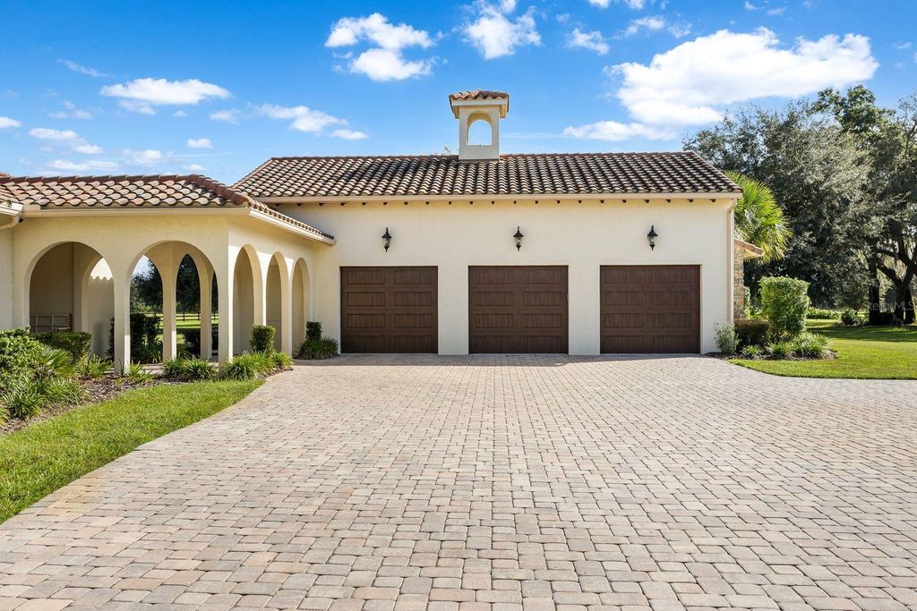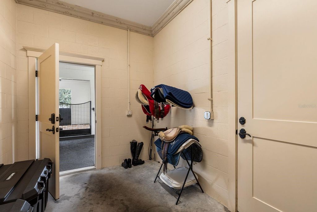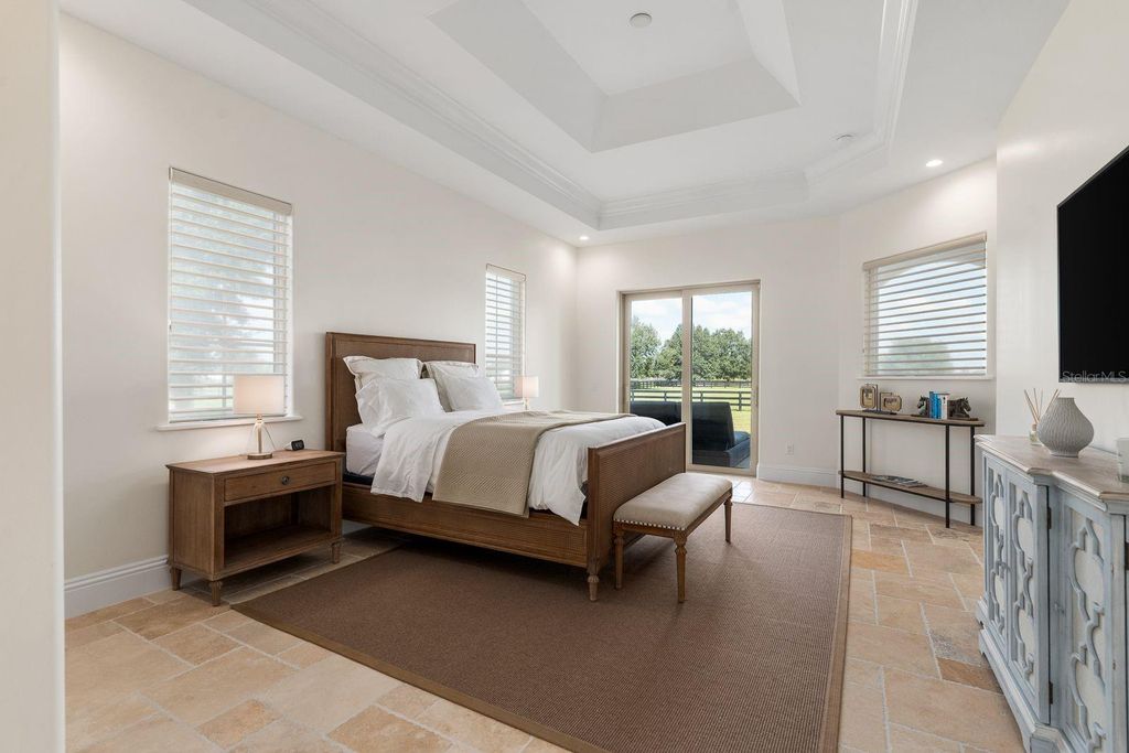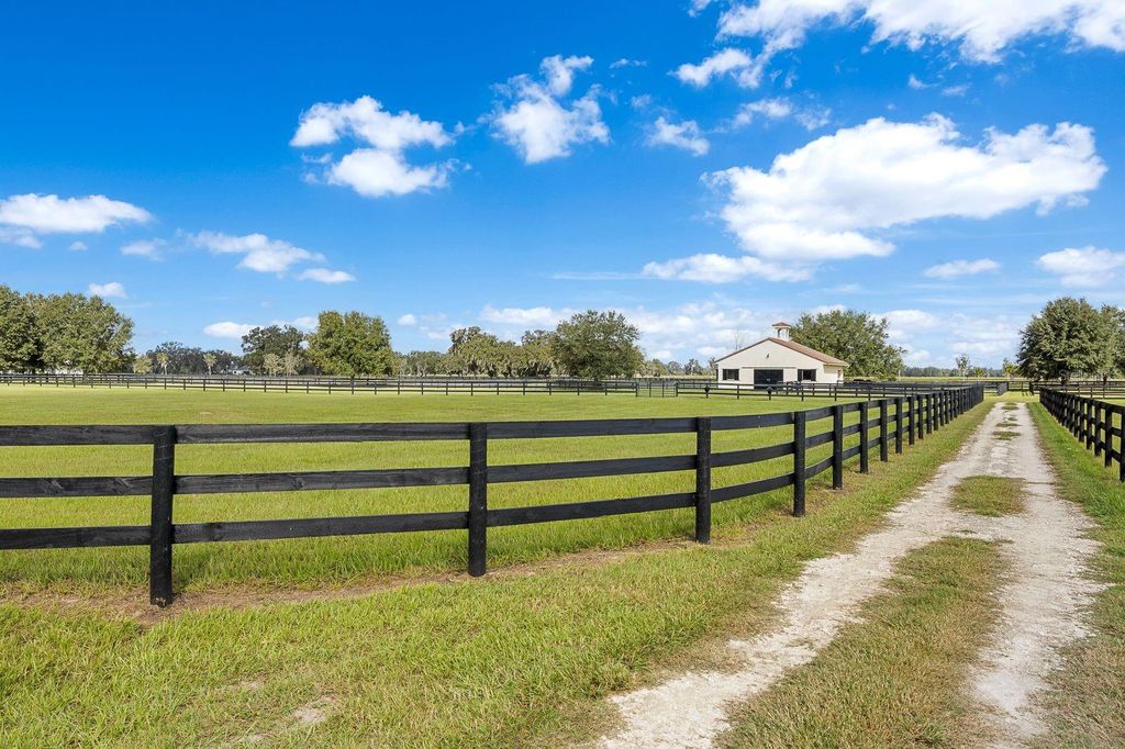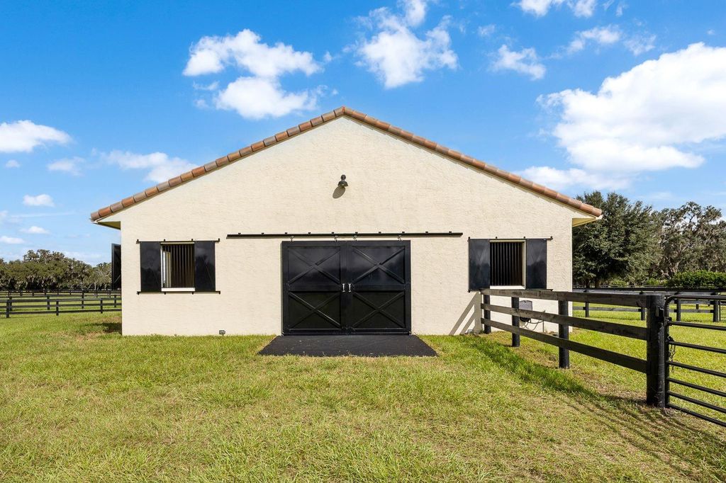 Set within the gated lakefront and equestrian enclave of Bel-Lago, this 6.32-acre equine estate embodies contemporary luxury at its finest. Completed in 2020, the custom-built residence showcases exceptional craftsmanship and materials throughout, and offered turn-key with the latest furnishings from Arhaus and Restoration Hardware. Soaring ceilings with tray detailing, travertine and hardwood flooring, and custom Dixie Workshop cabinetry throughout set a tone of refined sophistication. In the kitchen, natural light dances across the Taj Mahal quartzite countertops, and stainless-steel Viking appliances provide stylish performance. This property features 3 bedrooms + den, and 3.5 bathrooms. Each spacious bedroom is complemented with spa-inspired ensuite bathrooms, with your third guest suite offering an additional exterior private entryway, perfect for guests, multi-generational living, or farm staff. Beyond the walls, sweeping views of grand oaks and open paddocks unfold from the lanai, leading your eye to the heart of the property - a striking European style 3-stall block barn with Dutch stall doors, Equitan + SoftStall flooring, Pyranha fly spray system, spacious feed/tack rooms, stall cameras, and all the details that define a true equestrian haven. A newly laid 120'x200' arena and lush fenced pastures make training and turnout effortless. Additional features include a whole-property (including barn) generator, and a comprehensive security system covering both the home and barn stalls for added peace of mind. From your backyard, enjoy direct access to Bel-Lago's multi-use trail system - over 7 miles upon community completion - surrounded by 8,000+ acres of protected preservation. It's a setting that offers peace and privacy, yet remains just minutes from Ocala's major show venues, including the World Equestrian Center, HITS, and the Florida Horse Park. Sleek, serene, and meticulously maintained, this residence stands among Bel-Lago's most refined - where modern design meets the timeless beauty of horse country.