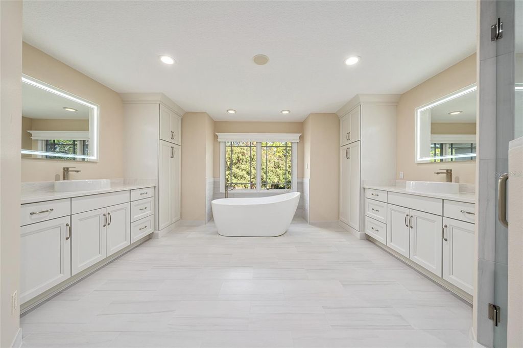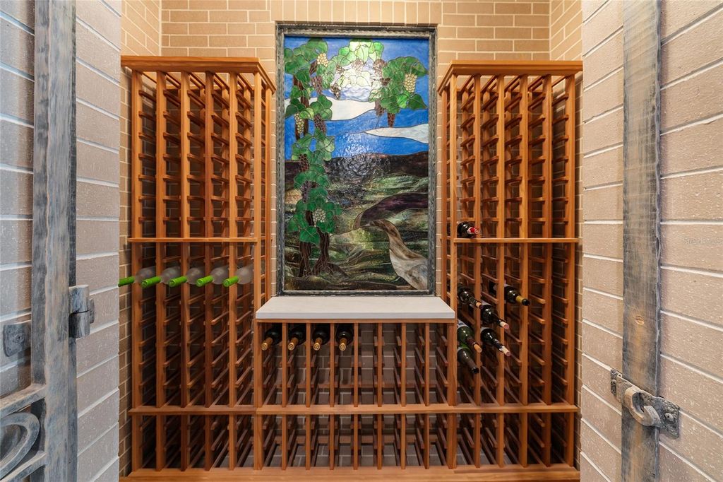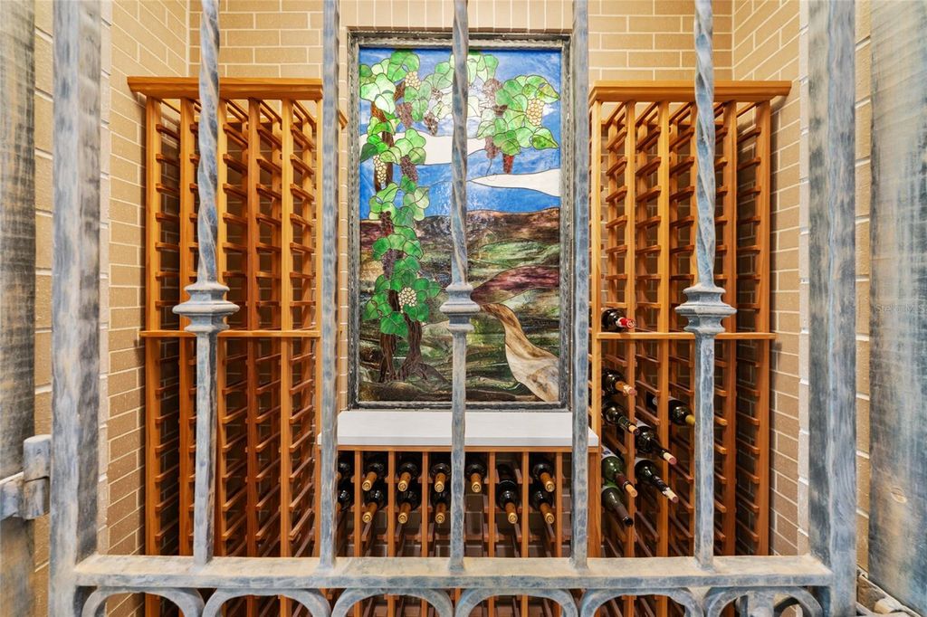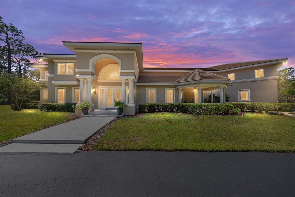 Exceptional custom estate offering nearly six acres of refined luxury, timeless craftsmanship and unrivaled privacy. Set in Pine Ridge Estates, this one-owner residence blends quality construction, acreage and design flexibility. Designed for those who appreciate space and refinement with five bedrooms, and five-and-a-half-bath residence spans more than 6,000 square feet with a versatile layout ideal for entertaining and multi-generational living. Entering through the custom double gate, a long winding circular drive takes you past mature pine trees, live oaks and blooming azaleas, creating a majestic arrival experience. The approach leads to soaring hand-forged cement decorative columns and window trim, imported Italian porcelain pavers, and double glass custom etched entry doors that introduce interiors defined by quality and artistry. Inside, 20-foot ceilings sweep through the front entry, living room and kitchen, with the remaining rooms enhanced with 10-foot ceilings on the first floor. Decorative hand-forged columns adorn the foyer, dining room and living room. A beautiful custom stained-glass piece is featured within the 246-bottle capacity wine pantry and is visible through the custom iron forged gate of the entrance to the wine pantry. Three fireplaces create a warm, inviting ambiance, while custom wood cabinetry and intricate finishes enhance each room's character. The chef's kitchen serves as the centerpiece of the home with dual islands, granite countertops, dining nook overlooking the pool, a Summitville thin-brick feature wall, a Thor gas range featuring a disappearing Viking vent, GE double ovens, a Viking warming drawer and Sub-Zero refrigerator/freezer, along with a small refrigerator for entertaining. Custom built-in food storage solutions include a custom storage pantry with swing-out shelving and drawers, and a butler pantry with a wine refrigerator. Two staircases, a dramatic custom spiral staircase in the entry and a secondary staircase off the kitchen, provides convenient access to the upper level. The floor plan includes two full primary suites, one on each level. The upstairs suite features a Juliette balcony with French doors, a spacious dressing room with a three-way mirror, and a spacious en suite with large shower and soaking tub. A mezzanine-style open hallway overlooking the dramatic living space below. There is a home office space that provides privacy and ability to work from home. A spacious laundry room with washer/dryer, cabinetry, utility sink and additional freezer. The home also offers a downstairs flex room that can be used as a craft room, playroom or home gym. The screened lanai overlooks a sparkling pool with a cascading waterfall and an oversized spa equipped with jets. Integrated Sonos speakers create an immersive sound experience. A dedicated outside full pool-bath, and spacious lounging areas make the outdoor space ideal for gatherings large or small. A covered veranda on the front side provides additional outdoor living space for intimate dining or evening cocktails. Other features include an oversized 2-plus-car garage, a garden area with fire pit, Generac generator and a well irrigation system for lawn, bushes and flowerbeds. With direct access to Pine Ridge's equestrian trail system, residents will also have access to the community center, block barn, a dressage arena and main arena. One or more photos have been virtually staged.