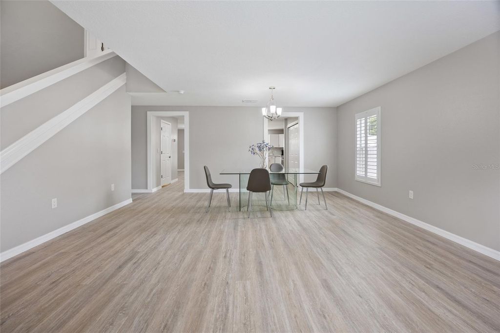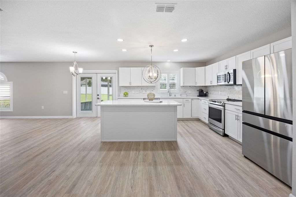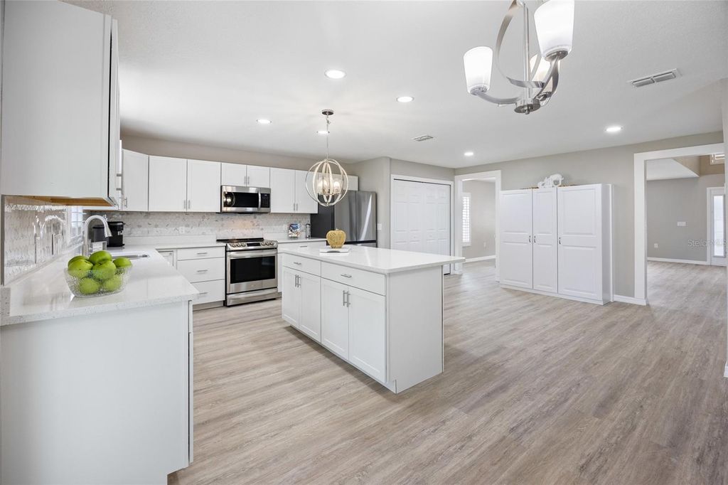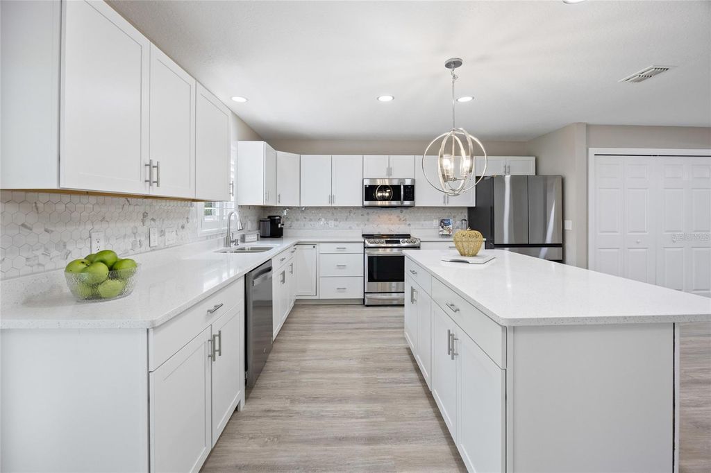 Beautifully updated 4-bedroom, 3.5-bath home located in the desirable gated community of Magnolia Pointe! Built in 2006, this 3,010 sq ft residence features a bright, open floor plan with luxury vinyl plank flooring throughout, plantation shutters on every window, and abundant natural light. The spacious kitchen is a showstopper"”complete with white shaker cabinets, quartz countertops, stainless steel appliances, and a large island perfect for entertaining. Upstairs, the impressive 17.5 x 20.5 primary suite offers a tray ceiling, spa-inspired ensuite bath with dual sinks, an oversized walk-in shower with built-in seating, and a massive walk-through closet. All bedrooms are located upstairs with a convenient half bath on the main level. Enjoy outdoor living in the screened patio overlooking the expansive vinyl privacy-fenced backyard. Additional features include a 2 car garage with epoxy flooring, two HVAC systems (one replaced in 2021), updated lighting, City of Ocala utilities with public water and sewer, and an HOA that maintains the gated entry and common areas. Conveniently located near schools, shopping, dining, and major highways. Move-in ready and meticulously maintained"”schedule your showing today!