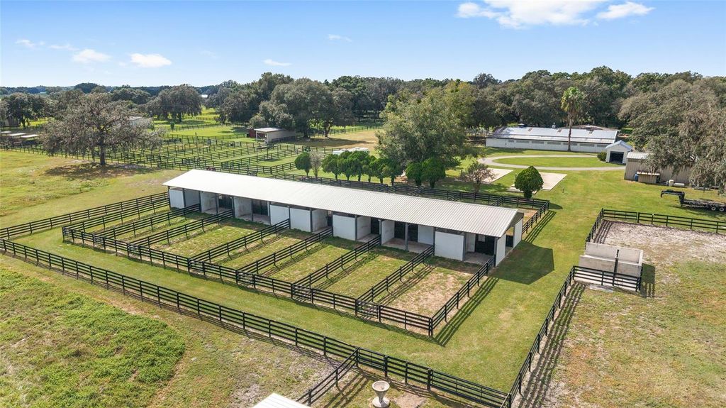 "˜Tis the Season for the Perfect Farm! If you've been searching for an absolutely stunning Training, Boarding, or Homestead Farm. THIS IS IT! As you enter through the gated entrance, you'll be greeted by 27.4 acres of prime pastureland dotted with majestic granddaddy oaks. The paved driveway winds its way to a charming three-bedroom, three-bath pool home, gracefully set among mature trees and beautifully irrigated landscaping with a circular drive. This well-maintained home features a New HVAC heat pump (2024), luxury vinyl plank flooring throughout (with porcelain tile in two bedrooms) and countless thoughtful upgrades. Step inside through the garage into the laundry/mudroom"”a perfect spot to leave those barn boots behind. Sliding barn doors lead into the gourmet kitchen, complete with granite countertops, a massive 6' x 8' center island with electric downdraft cooktop, double wall ovens, custom wood cabinetry, pantry, and pull-out drawers. Enjoy your morning coffee in the cozy breakfast nook with bay window or the dining room with a dedicated coffee station. The great room showcases a stone fireplace and Cypress wood beams, while the office/den features a large picture window overlooking the scenic grounds. The primary suite offers sliding doors to the pool, a spacious walk-in closet, and an en suite bath with dual solid-surface sinks, water closet, and a walk-in shower. The two guest bedrooms are generous in size; one features a pocket door connecting to a full bath with granite counters. The Florida room opens to the extended lanai and heated saltwater pool, with a third full bath conveniently located nearby. ADDITIONAL HOME HIGHLIGHTS INCLUDE: :Kinetico water treatment system with reverse osmosis :New pool pump (2025) :New HVAC heat pump (2024) :New Roof (2018.) :EQUINE FACILITIES. Equestrians will love the exceptional amenities this property provides. :Main Barn (16 stalls.) :Concrete block center-aisle design. :16 matted 12x12 stalls with automatic waterers, electric, fans, and fly spray system, Feed room, tack room, office, bathroom, washer/dryer, and hay storage. :Second Barn (14 stalls). Includes run-ins for added horse comfort. PROPERTY FEATURES: Total of 30 stalls, ,6 small paddocks ,8 large paddocks ,4 extra-large fields. :Lighted outdoor arena. :Exerciser-(horse walker.) :Covered 50-ft concrete block irrigated round pen. :4 RV hookups (20x50 concrete slabs, 30 & 50 amp, water & sewer.) :6 additional RV hookups (30 amp, water & sewer.) :5 septic systems with drain fields. :Majority of fencing has been replaced and repainted within last 3 years. :Three-bay steel building with roll-up doors and workshop area. :Well house and equipment shed. :Automatic waterers in all paddocks. This property truly offers everything you need for a successful equine operation, private retreat, or country estate "” all nestled under the timeless beauty of Florida's oak canopy. This is a must see!!
