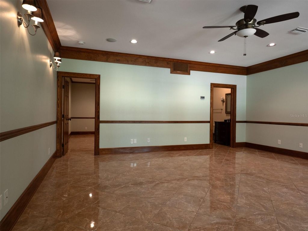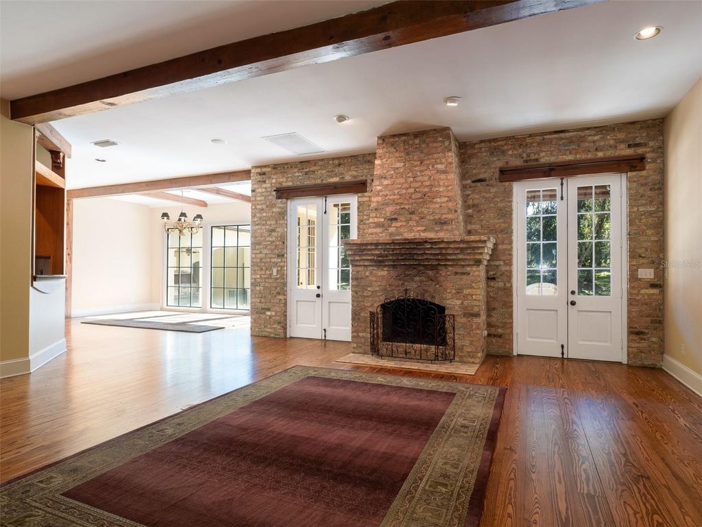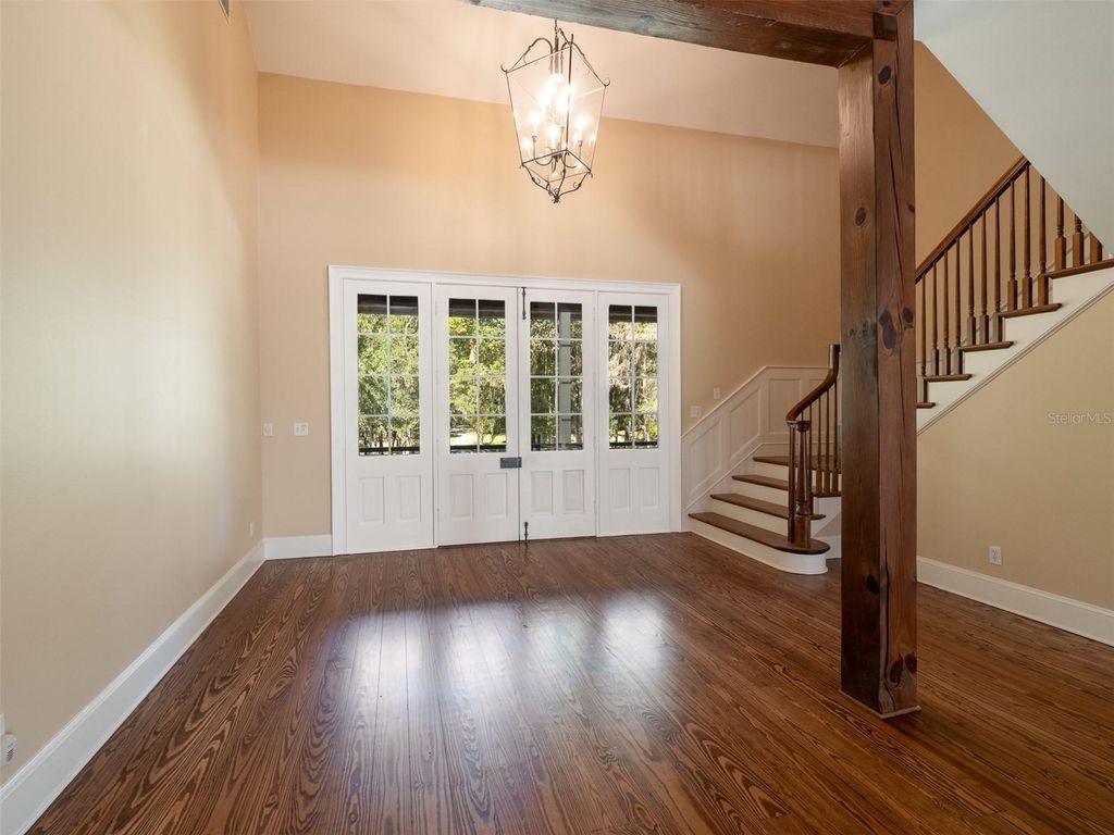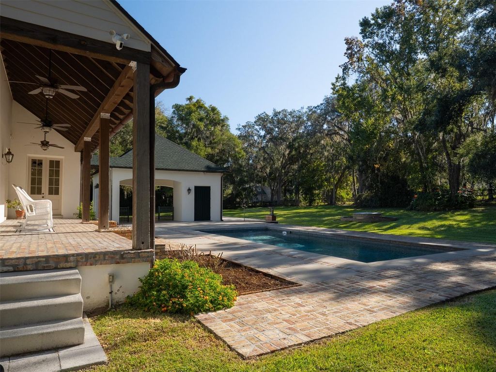 Nestled in the gated community of Polo Lane in Ocala, this remarkable 5+ acre estate offers a truly unique living experience. Upon entering, you cross a tranquil pond that sets the stage for the elegance that awaits. A striking brick fountain graces the front of the three-story home, while a porte-cochère at the rear provides access to an inviting in-ground pool framed by a beautiful brick patio. The covered back porch leads down to the pool area, perfect for outdoor entertaining, while the front balcony offers sweeping views of the pond and expansive property. Inside, soaring ceilings, crown molding, exposed wooden beams, and a brick fireplace create a warm yet grand atmosphere. The formal dining room features a wall of tall windows and French doors overlooking the backyard and pool. The home offers five en-suite bedrooms and six full bathrooms, with an additional flexible living area that can serve as a sixth bedroom, home office, or creative studio. The chef's kitchen impresses with solid wood cabinetry, stone countertops, top-of-the-line appliances, and a wine fridge, while gorgeous wood and porcelain tile flooring flow seamlessly with carpet in select areas. Stunning wooden doors throughout enhance the home's character, and the garage/workshop provides additional space for storage or projects. Combining elegance, functionality, and distinctive architectural charm, this estate is a rare gem offering the perfect blend of luxury and comfort.