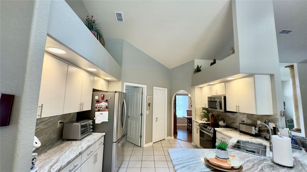 Welcome to this beautifully maintained and thoughtfully upgraded 3 bedroom 2 bathroom pool home where comfort, style, and functionality come together seamlessly. Step through the brand new double front doors into a bright and spacious living room enhanced by skylights and framed by two striking architectural pillars. To the left, you'll find a versatile office/flex room, perfect for work or relaxation. To the right, the home opens to a well appointed kitchen with a cozy breakfast nook, while the formal dining room wraps elegantly back toward the entryway for effortless flow when entertaining. The laundry room, located conveniently off the kitchen, offers added storage, a washer, and a new dryer (2022), and provides direct access to the two car garage. The updated kitchen features stainless steel appliances, including a new stove (2022), matching new granite countertops and backsplash (2022), and additional natural light from overhead skylights. Retreat to the spacious primary suite showcasing wood flooring, and enjoy a beautifully designed ensuite bathroom with tile flooring, dual sinks, a soaking tub, walk in shower, and private water closet. Two generously sized guest bedrooms feature newer laminate flooring that complements the home's cohesive design. The guest bath offers ample storage, abundant counter space, and a convenient step-down walk in shower. Step outside to your private backyard oasis featuring a large screened-in 12' x 27' kidney-shaped pool, a 29' x 9' covered lanai, and outdoor furniture that conveys with the sale. The backyard also includes a small storage shed and low maintenance artificial turf bordering the pool enclosure. The home offers exceptional value with numerous major upgrades that include New Roof 2021, New AC 2023, New Windows throughout the home 2021, Resurfaced Pool 2023, New Pool equipment 2023, New Solar Pool Heater 2023, New Water Heater 2024, New Exterior Paint and Light Fixtures 2025, and Brand New Drain Field November 2025 located in the front yard. Homes this well-maintained and upgraded don't last long, schedule your own private showing today!