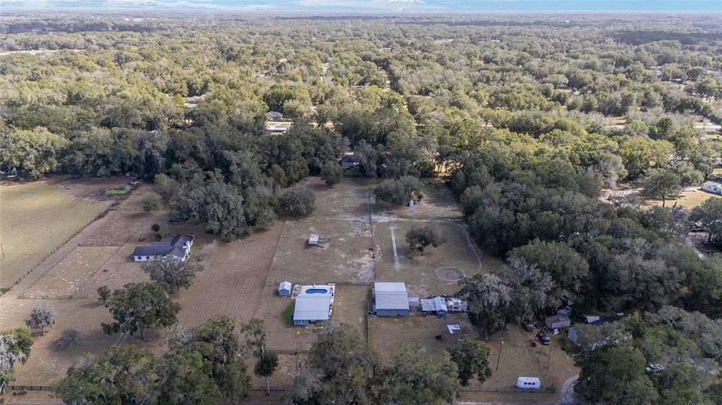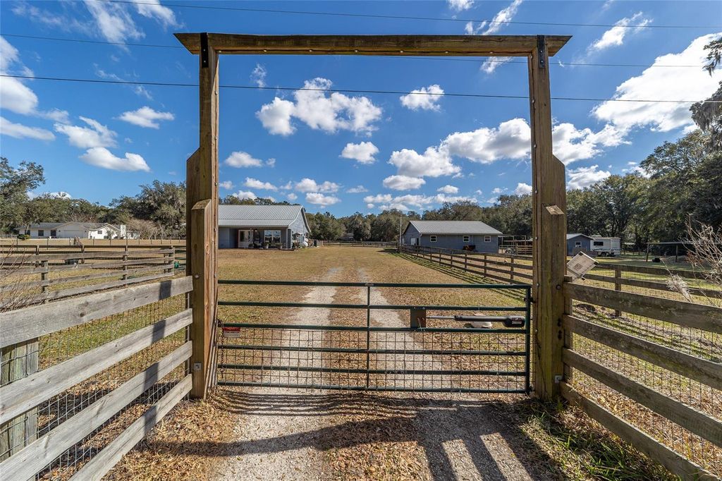 Charming 4.26 acre farm with a beautifully designed 2-bedroom, 2-bath residence welcomes you with a stunning great room featuring a 6" knotty pine tongue-and-groove ceiling, elegant built-ins, tile flooring, and a cozy gas fireplace. This home has a new pool. The custom kitchen is both stylish and practical, showcasing custom cabinetry, a spacious granite island, granite countertops, and a pantry with pull-out drawers"”ideal for everyday living and entertaining. Exterior highlights include cypress siding, a metal roof, and modern systems such as a water softener and chlorine well system. Property is fully fenced and cross-fenced acres, perfectly ready for any small horse training operation. The property includes a spacious workshop, detached garage/barn, featuring a 9' x 12' garage door with opener, three stalls. There is an additional building that could be use for an office and/or turn back to a 4 dog kennel room. This farm is located about 10 minutes from the Florida Horse park and also close to the villages and I-75.