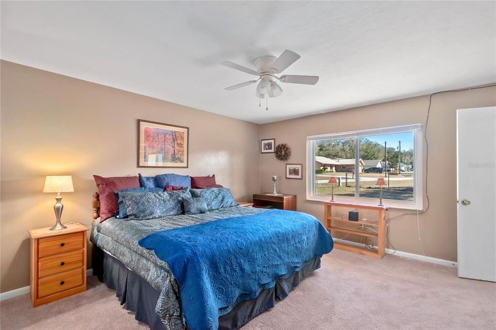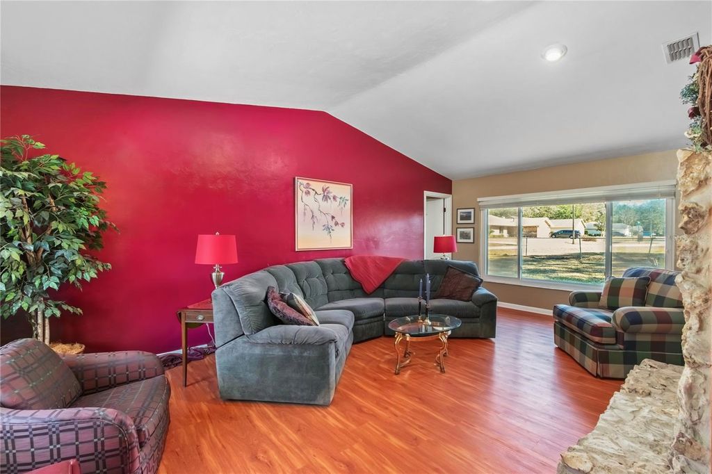 Resting on a spacious corner lot within the established Pine Oak Estate community, this charming ranch-style home is an inviting option with plenty to discover. Overlooking large yards and surrounded by mature landscaping, the 3-bedroom, 2-bath home offers just under 1,800 sqft of thoughtfully designed space. Vaulted ceilings and wood flooring run throughout the majority of the main spaces, creating a relaxed, airy atmosphere. Large windows provide abundant natural light throughout, while the split-bedroom floor plan ensures plenty of privacy when you're ready to unwind. The heart of the home is the expansive great room, where a striking wood-burning fireplace creates a warm and welcoming focal point, perfect for relaxing evenings or gathering with guests. The kitchen provides abundant counter and cabinet space, a breakfast bar, and easy access to the adjacent family room. The primary suite is comfortably sized and privately situated, featuring a built-in closet and an en-suite bath with dual sinks and a walk-in shower. Two additional bedrooms provide flexibility for guests, a home office, or creative space if desired. Outdoors, enjoy a fully fenced backyard with chain-link fencing, mature trees that offer natural shade, and a patio ideal for outdoor dining or quiet mornings with coffee. Located just down the road from Maplewood Elementary and convenient to a variety of shopping, dining, entertainment, and outdoor recreation options, this property is an amazing opportunity to enjoy comfortable living in a well-established Ocala neighborhood- all with NO HOA fees!