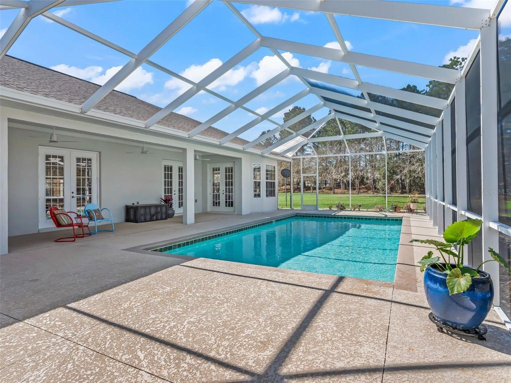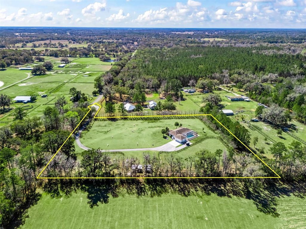 Fantastic 5+ acre horse property well located on a quiet country road just a stones throw away from the World Equestrian Center Ocala! The custom built home is concrete block construction with 4 beds, 4 bathrooms & a large screened-in pool & the property boasts a 2-stall barn, 2 grass paddocks, & grass jumping field. The property is accessed through a gated entrance & asphalt paved driveway which leads past the jumping field to the home & 2-car garage. The house interior has many high-end features such as 10' ceilings throughout, 8' tall interior doors, all tile & wood flooring, crown molding, & French doors. The living room boasts a double sided gas fireplace with French doors opening to the covered screen-in pool area. The kitchen has a large quartz island, stainless appliances & gas oven- cooktop. The primary bedroom has wood flooring, is over-sized with direct access to the pool, dual walk-in closets, & ensuite 5-piece bathroom. The 2nd bedroom also has a full en-suite bathroom & walk-in closet. There is also a Generac whole house gas generator with 500 gallon propane tank & well water softener system & the entire property is fenced & ready for you to move in!