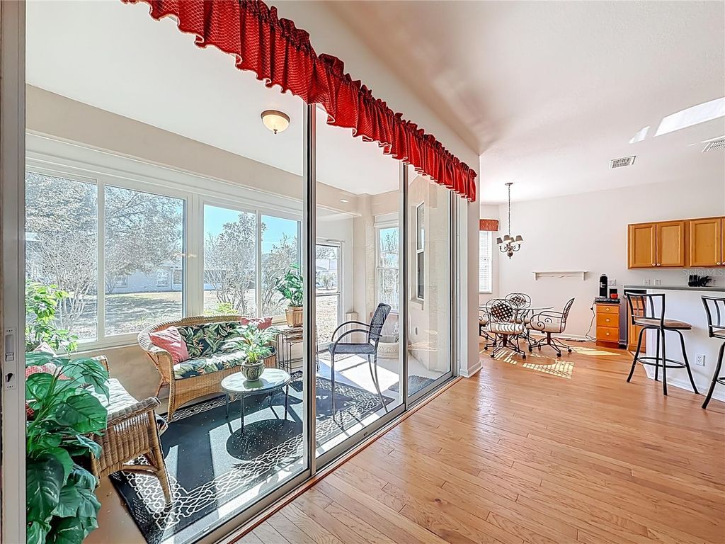 Furnished unit! Welcome to the highly sought-after Hanover Model located in the Providence neighborhood of On Top of the World, Ocala's premier gated 55+ golf community. Situated on a centrally located street, this well-maintained rental offers comfort, privacy, and an active lifestyle all in one. Step inside through the upgraded beveled glass entry door and immediately appreciate the beautiful hardwood flooring throughout "” with NO carpet for easy maintenance. This light and bright home features a desirable split-bedroom floor plan with 2 bedrooms, 2 bathrooms, and a versatile flex room that can be used as a home office, hobby space, or guest area, accessed through elegant French doors from the main living area. The open-concept great room boasts 9'4" ceilings, a spacious dining area, and seamless flow into the kitchen, which is equipped with newer appliances, wood cabinetry, Corian countertops, a breakfast bar, and a sunny eat-in nook surrounded by large windows. Triple sliding glass doors lead to the window enclosed lanai, where you can relax and enjoy peaceful green space views. The private primary suite is thoughtfully positioned at the rear of the home and features two walk-in closets and an en suite bath with dual sinks, a large step-in shower, comfort-height toilet, and linen closet. The guest bedroom and hall bath with tile surround tub are located at the front of the home, offering ideal separation for guests. Residents of On Top of the World enjoy 24/7 gated entrances and resort-style amenities including multiple pools (indoor and outdoor), state-of-the-art fitness centers, pickleball, tennis, bocce, shuffleboard, archery, billiards, woodworking shop, library, over 175 clubs, and more. This golf cart-friendly community also offers convenient access to three shopping centers and is just about 20 minutes to the World Equestrian Center, with an easy drive to Orlando entertainment, airports, and cruise ports "” making it an exceptional rental opportunity in SW Ocala.