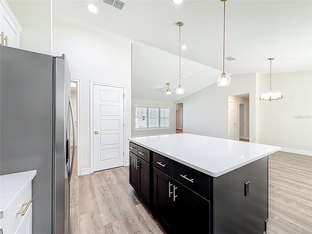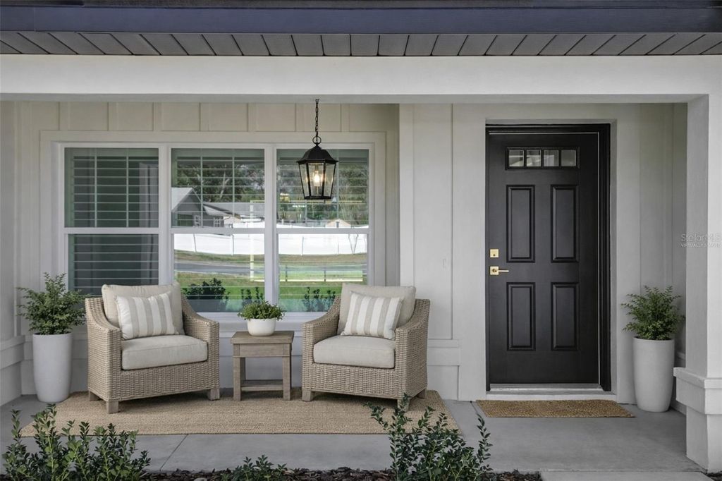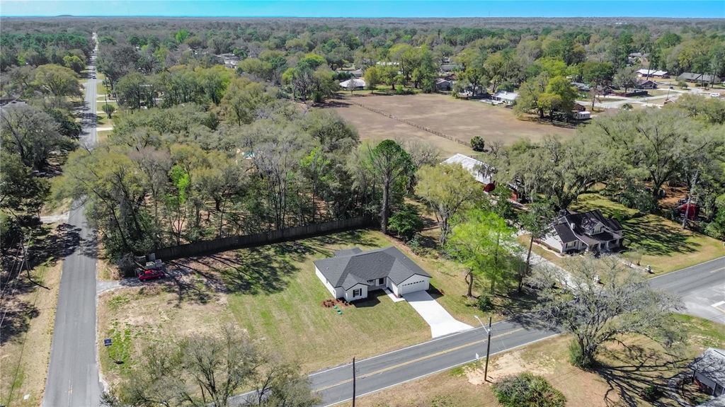 Welcome to this beautifully crafted move in ready new construction home, thoughtfully designed with quality, comfort, and elevated finishes throughout. Situated on historic Fort King Street, just five minutes to parks and shopping and only ten minutes to downtown, this home offers both convenience and timeless curb appeal. From the moment you arrive, the striking white exterior with black shutters, black front door, fascia, soffit, and shingles creates a clean modern farmhouse feel while maintaining classic proportions. Board and batten detailing across the front facade adds architectural interest, and the covered front porch with a tongue and groove ceiling invites you to slow down and enjoy the setting. Built with concrete block construction and energy efficient low E windows, this four bedroom, two bathroom home features a split floorplan that offers privacy and functionality. The primary suite is tucked away on one side of the home, while the guest bedrooms are thoughtfully positioned on the opposite side. Inside, luxury vinyl plank flooring flows throughout the living areas, complemented by granite countertops and soft close cabinetry that reflect the upgraded quality of this build. The living space feels open and light filled thanks to the triple windows in the living room and a triple sliding glass door in the dining area that seamlessly connects to the covered back patio, also finished with a tongue and groove ceiling. Whether entertaining or enjoying a quiet evening at home, the indoor and outdoor spaces are designed to work together effortlessly. A wainscoting feature wall in the living room adds warmth and character, complete with a dedicated outlet for a mounted television. The kitchen stands apart from typical builder grade homes, featuring stainless steel appliances, 36 inch upper cabinets for additional storage, and a striking two tone cabinet design with a darker accent island. Brushed brass lighting, hardware, and plumbing fixtures add a refined touch that carries through to the bathrooms. The primary suite offers a true retreat, highlighted by a tongue and groove tray ceiling, spacious walk in closet, and a beautifully tiled walk in shower with glass enclosure. Dual sinks, upgraded finishes, and an in wall safe add both luxury and peace of mind. Additional features include ceiling fans in every bedroom and the living room, plantation shutters and window casing throughout, an inside laundry room, and a two car garage with glass panel garage door and a ceiling mounted AC handler to maximize usable space. Full lot sod completes the exterior, providing a polished and move in ready presentation. This is not a standard spec home. It is a thoughtfully upgraded residence that blends craftsmanship, style, and everyday functionality in a prime Ocala location.