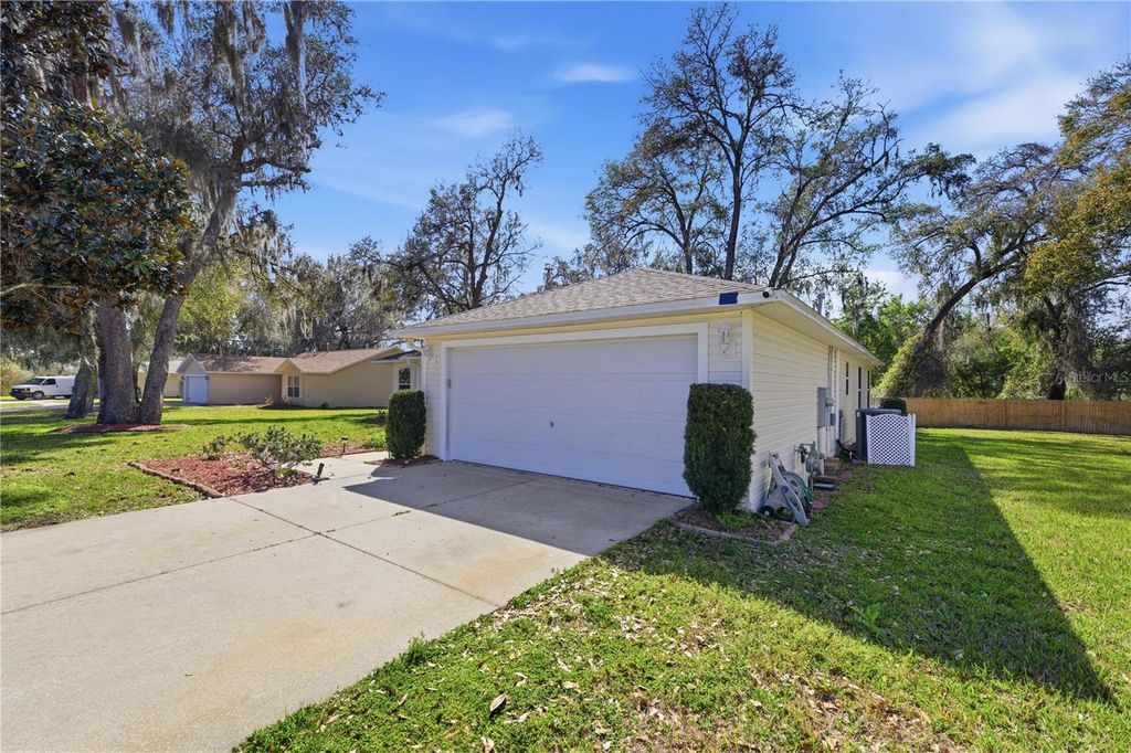 Well cared for and hard to find 4 bedroom, 2 bath home in a fantastic location! This move-in-ready property features a spacious living/family room with soaring vaulted ceilings and beautiful wood flooring throughout all living areas and bedrooms. The kitchen shines with stainless steel appliances, maple cabinets, and granite countertops, perfect for both everyday living and entertaining. Sliding glass doors with built-in blinds lead to a screened-in lanai overlooking the oversized, privacy-fenced backyard. The primary suite offers a large walk-in closet and an updated bathroom with granite countertops and a custom tiled walk-in shower. A desirable split floor plan places the three additional bedrooms and second bath on the opposite side of the home for added privacy. Additional highlights include a large laundry room with extra storage and a deep two-car garage with built-in storage. Situated on a quiet dead-end street with no through traffic in a great family neighborhood. Conveniently located near The Villages, plus close to shopping, dining, entertainment, schools, hospitals, and everyday amenities. Don't miss this move-in ready gem! Roof 2018 AC 2022 - Trane 3.5 ton 16 Seer with transferable warranty for $99