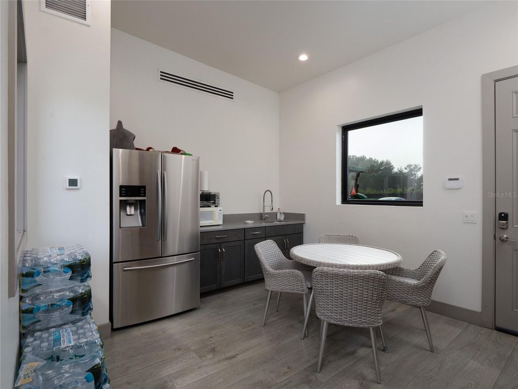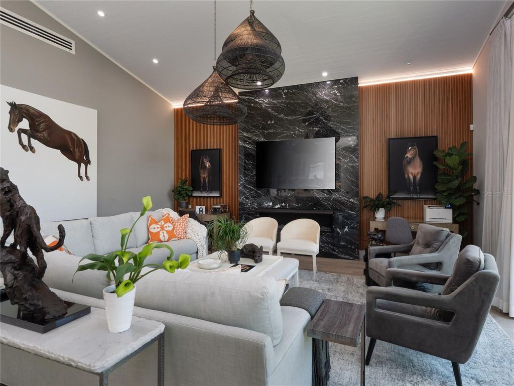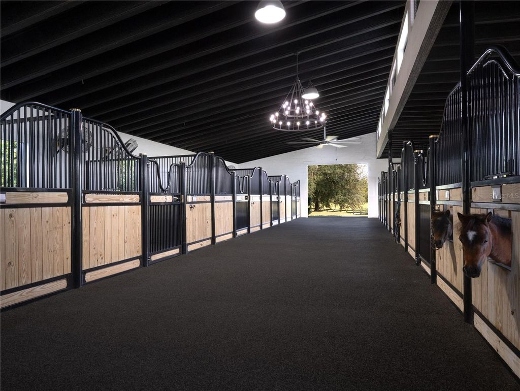 Tucked away on approximately 131 acres and just 10 minutes from HITS and 15 minutes from the World Equestrian Center, this private horse farm offers a refined equestrian setting with thoughtful design and timeless character. Fully fenced and framed by mature oak canopies, the property is enhanced by manicured landscaping, elegant palm trees, rolling green pastures, and a small pond, all introduced by a striking gated entrance that sets the tone upon arrival. The residence sits at the heart of the farm, flanked by barns on either side, creating a balanced and functional layout. A European-style barn includes 12 stalls, a tack room, and a wash bay, while the second barn serves as an equipment barn and features a feed room, dedicated office space, kitchenette, full bathroom, and laundry area, providing excellent support for daily farm operations. Surrounding paddocks are thoughtfully arranged and fully fenced, equipped with run-in sheds, offering comfort and convenience for horses throughout the property. Inside the home, the living room flows seamlessly into a wine and bar area, enhancing the home's natural flow and social spaces. The open kitchen offers updated appliances and abundant cabinetry, while the two-bedroom, two-bathroom layout includes walk-in closets and sliding glass doors in each room, allowing natural light to pour in and creating a seamless connection between the indoors and the surrounding landscape. A distinctive open back porch with a seating area provides the perfect vantage point to unwind and take in the peaceful farm views, making this property a rare opportunity to own a serene equestrian retreat.