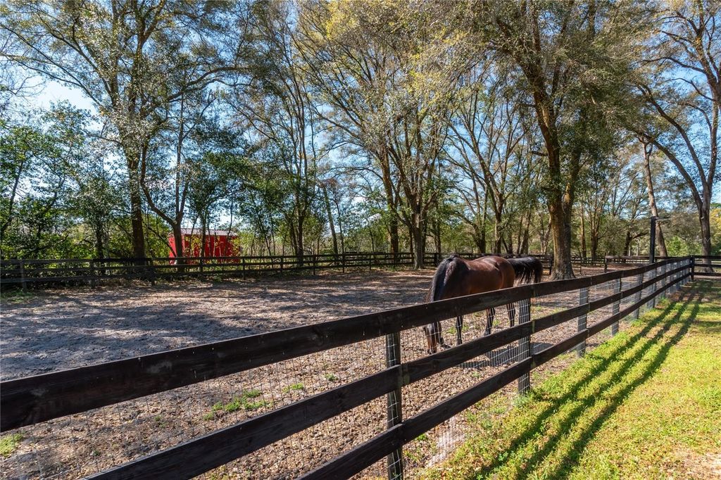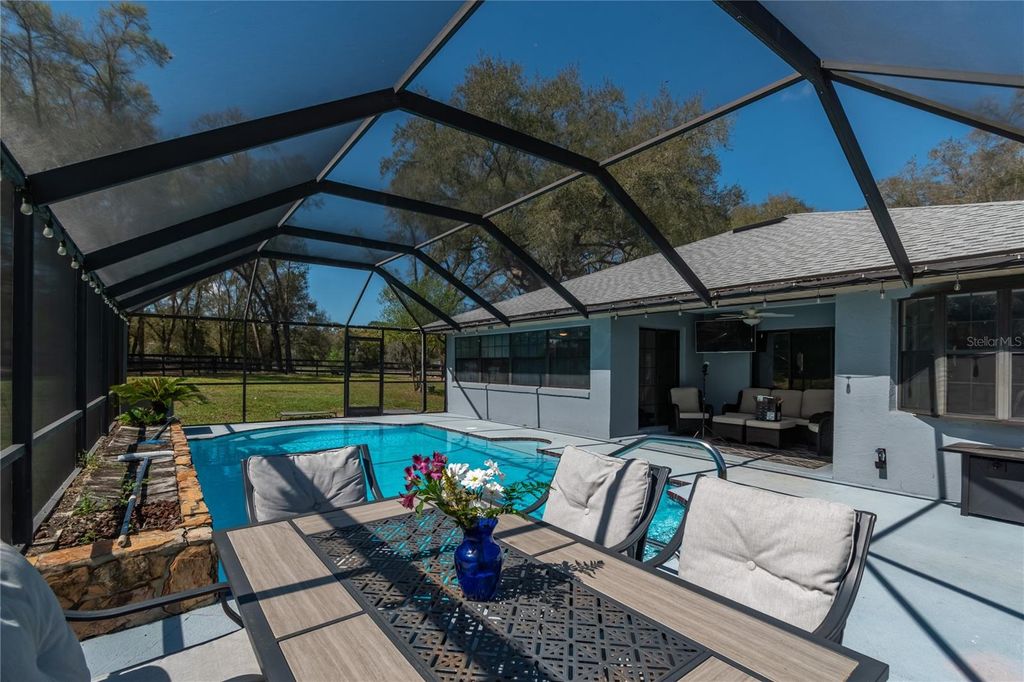 Nestled within the equestrian neighborhood of Meadow Wood Farms, this well-equipped mini-farm provides a comfortable lifestyle within Ocala's vibrant Horse Country. Fenced and gated on a large 3.70 acre lot, the farm is nicely private with plenty of shade from mature trees. The 3-bedroom, 2-bath pool home offers 1,875 square feet of living space with vaulted ceilings, good natural light, and ceramic tile and luxury vinyl flooring throughout. The main living area provides space for both living and dining, making it easy to accommodate everyday living or gatherings. The kitchen includes ample cabinet and counter space, a pass-through window to the living area, and a breakfast nook with a bay window. Both bathrooms have been tastefully updated with new vanities, mirrors, and fixtures. The primary suite features a large walk-in closet and a private bath with dual sinks and a walk-in shower. At the back of the home is a flex room overlooking the pool, which could work well as a second living area, office, or hobby space. Outside, the screen-enclosed pool area includes an in-ground pool, spacious pool deck, and a covered seating area with ceiling fans and a TV mount, with views of the surrounding farm. Additional features include a 2-car attached garage and a laundry room with utility sink and storage.Designed with horses in mind, the farm features a 3-stall block shed-row style barn, complete with tack room and wash rack. Three paddocks are in place with board fencing and no-climb, allowing for plenty of space for turnout and training. Located just a short drive from HITS and less than 10 minutes to WEC, this property is an ideal option to take advantage of Ocala's diverse and well-supported network of equine retailers, service providers, veterinary care, and show/competition venues. If you've been searching for a manageable farm with plenty of flexibility, look no further!