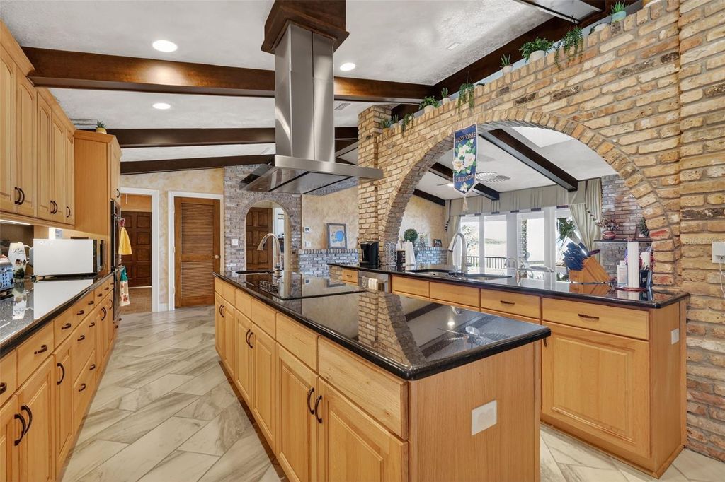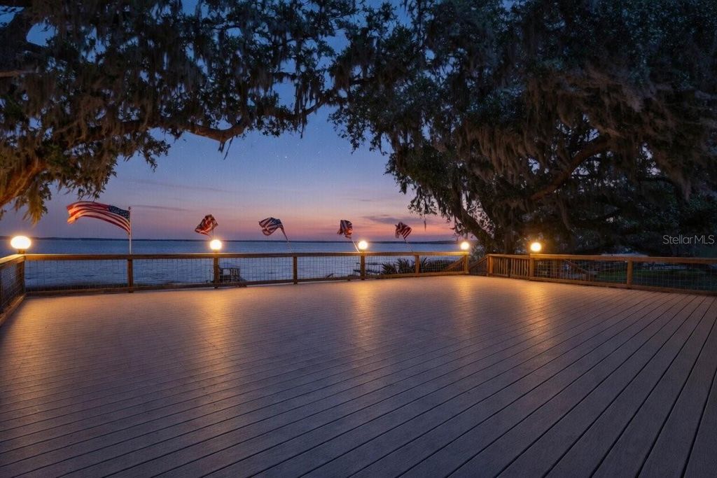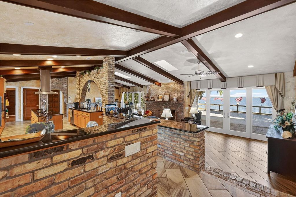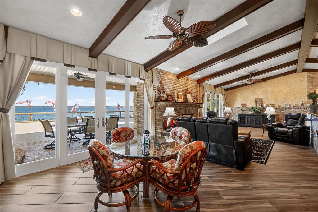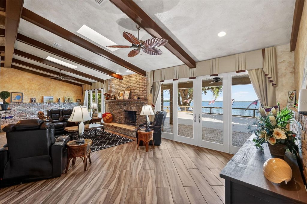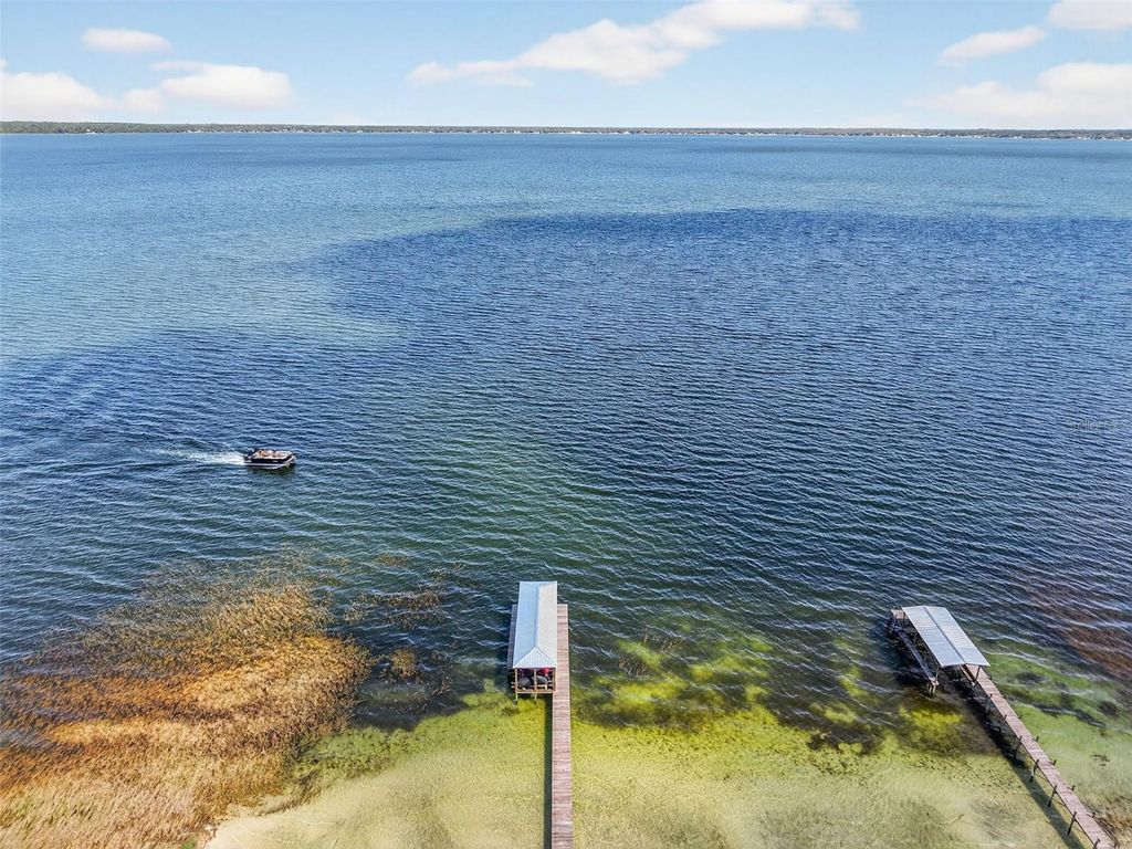 One or more photo(s) has been virtually staged. Experience elevated lakefront living on the shores of Lake Weir with this exquisitely remodeled 4 bedroom, 4 bathroom estate, perfectly positioned on 2.12 private acres with an impressive 185 feet of pristine waterfront. Designed for both luxury and comfort, three of the bedrooms offer en-suite bathrooms and spacious walk-in closets, creating an ideal retreat for family and guests alike. The home has been thoughtfully renovated from the inside out, featuring high-end stainless steel appliances, solid granite countertops throughout, rich hardwood cabinetry, and stunning custom Chicago brick accents that add warmth and character. Every detail has been carefully curated, from the professionally painted interiors to the seamless indoor-outdoor flow created by brand new sliding glass doors showcasing breathtaking lake views from the living room and three bedrooms. The inviting living space is anchored by a wood-burning fireplace and framed by panoramic water views, while the expansive 32 x 46 deck provides a front-row seat to some of the most spectacular scenery on the entire lake. The newly constructed 2024 dock and boathouse elevate the waterfront experience, complete with electric lifts for both a boat and two jet skis. Additional features include a detached carport with a covered breezeway for convenient access to the home, as well as a separate garage/workshop with its own covered carport. This is a rare opportunity to own a fully upgraded, luxury waterfront estate offering privacy, craftsmanship, and unmatched views in one of Lake Weir's most desirable settings.