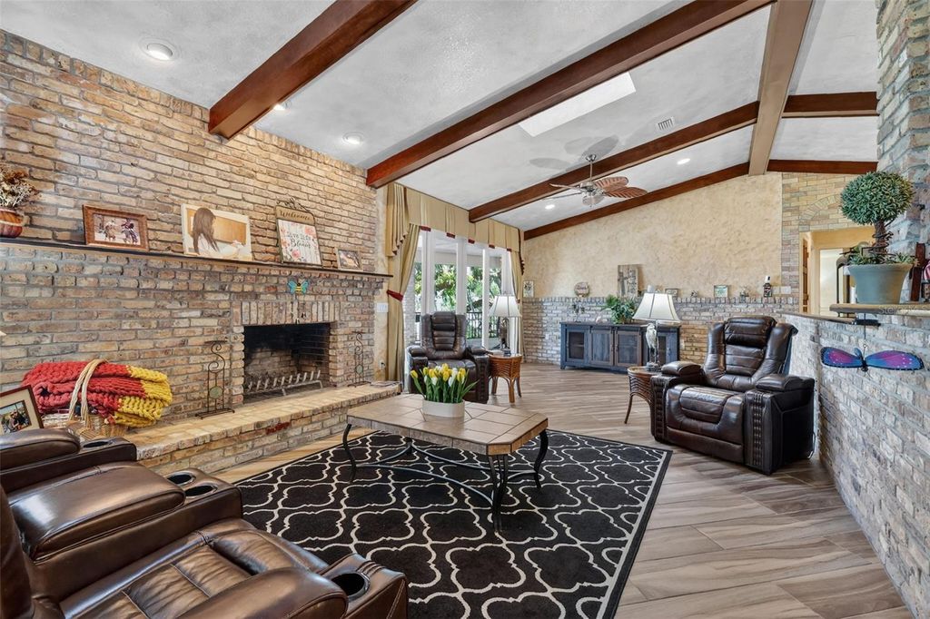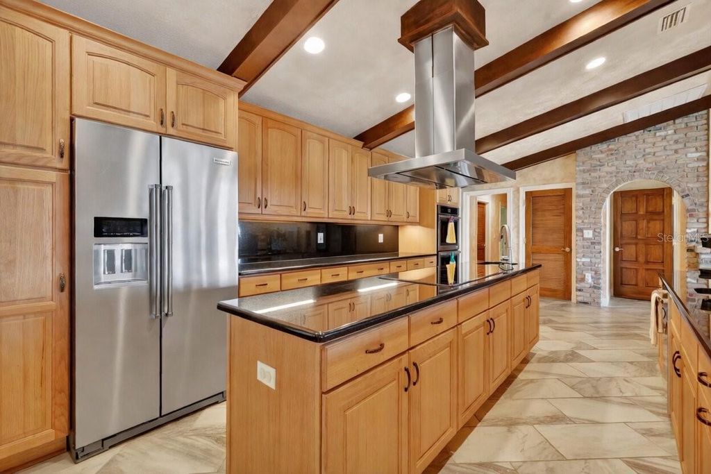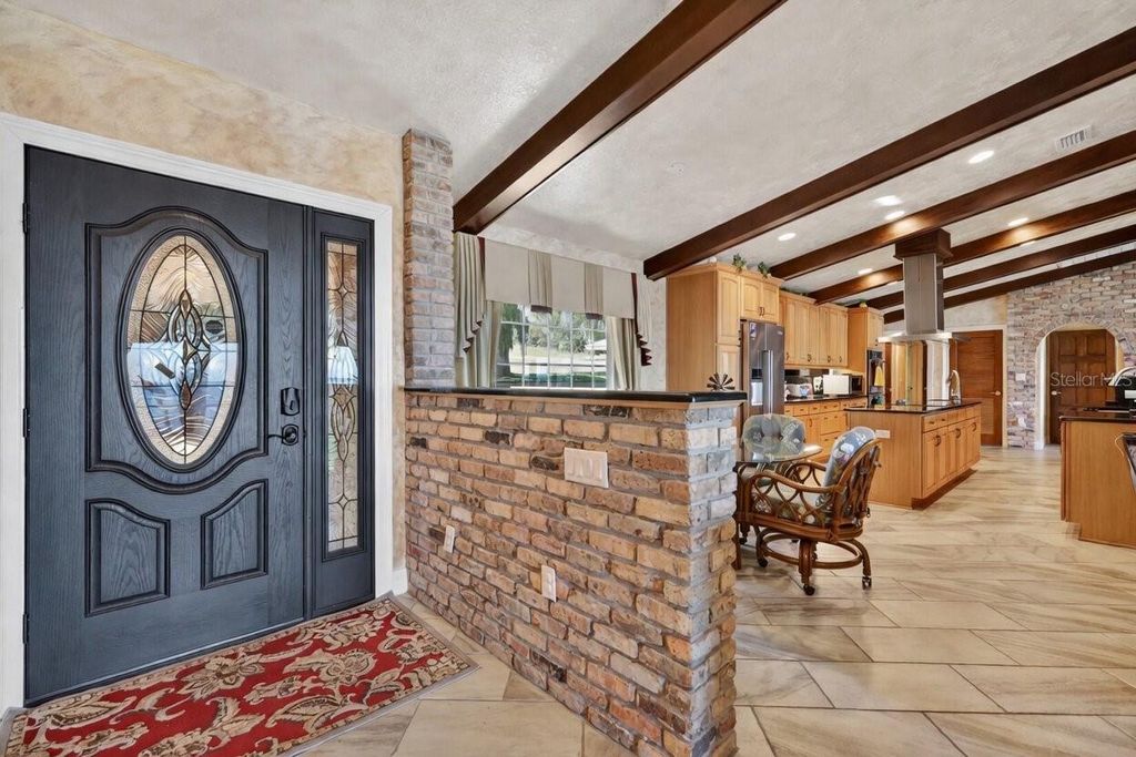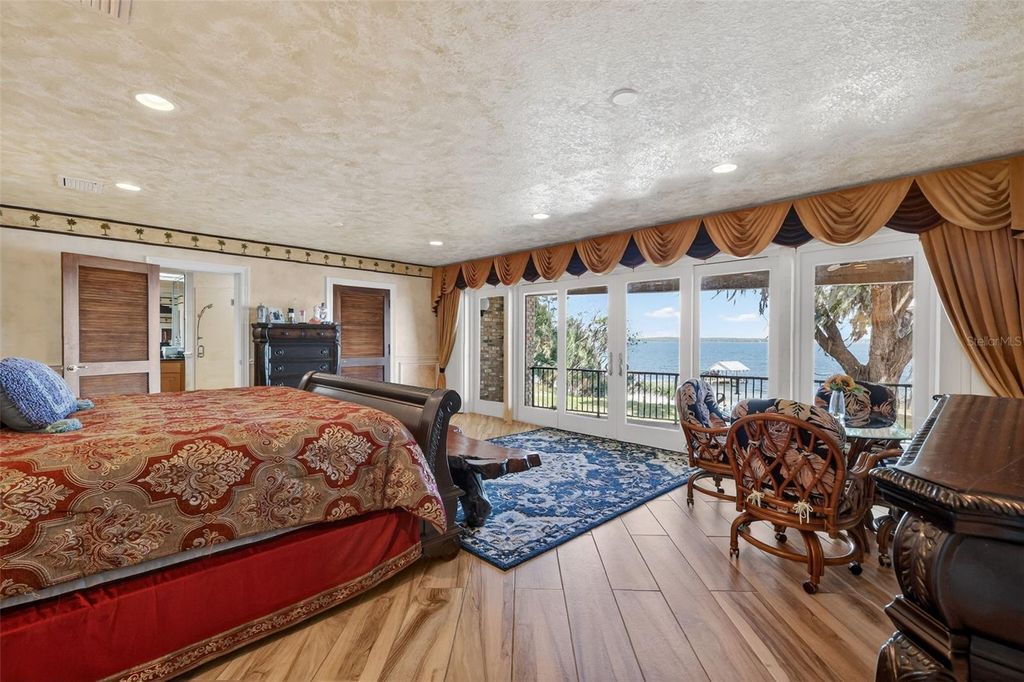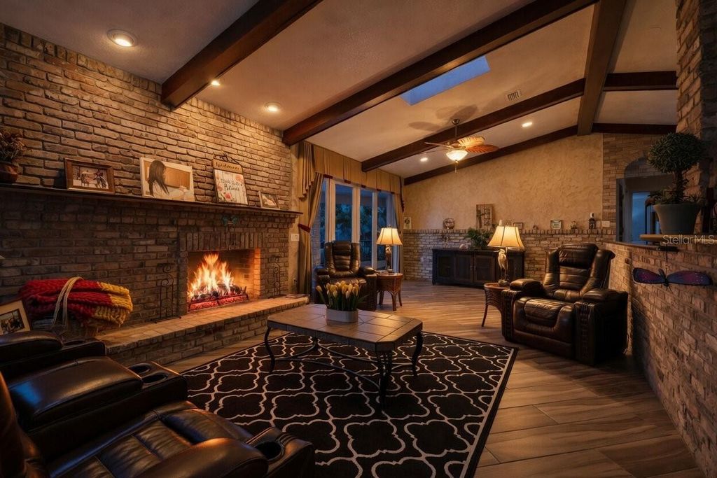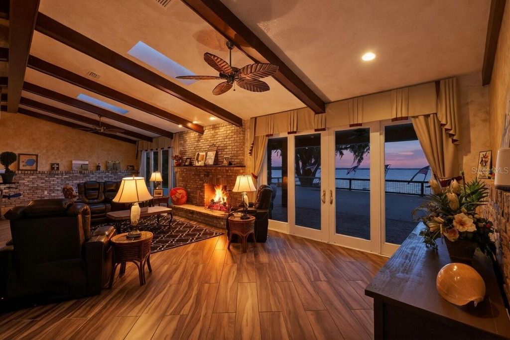 One or more photo(s) has been virtually staged. Experience elevated lakefront living on the shores of Lake Weir with this exquisitely remodeled 4 bedroom, 4 bathroom estate, perfectly positioned on 2.12 private acres with an impressive 185 feet of pristine waterfront. Designed for both luxury and comfort, three of the bedrooms offer en-suite bathrooms and spacious walk-in closets, creating an ideal retreat for family and guests alike. The home has been thoughtfully renovated from the inside out, featuring high-end stainless steel appliances, solid granite countertops throughout, rich hardwood cabinetry, and stunning custom Chicago brick accents that add warmth and character. Every detail has been carefully curated, from the professionally painted interiors to the seamless indoor-outdoor flow created by brand new sliding glass doors showcasing breathtaking lake views from the living room and three bedrooms. The inviting living space is anchored by a wood-burning fireplace and framed by panoramic water views, while the expansive 32 x 46 deck provides a front-row seat to some of the most spectacular scenery on the entire lake. The newly constructed 2024 dock and boathouse elevate the waterfront experience, complete with electric lifts for both a boat and two jet skis. Additional features include a detached carport with a covered breezeway for convenient access to the home, as well as a separate garage/workshop with its own covered carport. This is a rare opportunity to own a fully upgraded, luxury waterfront estate offering privacy, craftsmanship, and unmatched views in one of Lake Weir's most desirable settings.