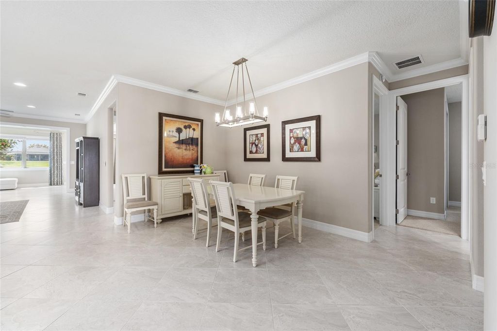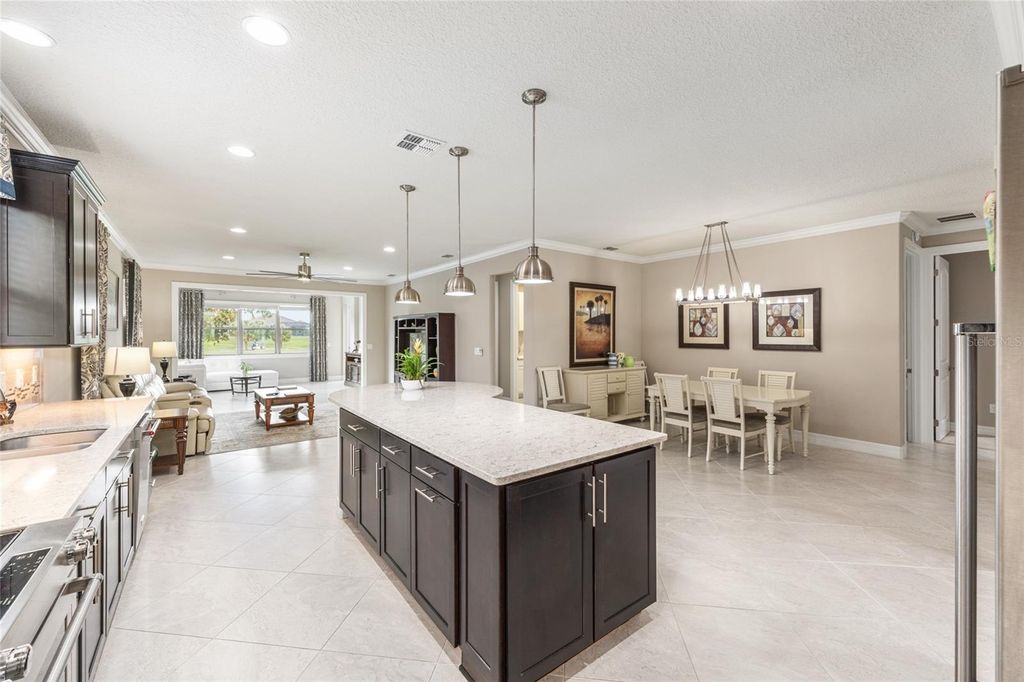 Experience retirement at its finest in this custom-finished masterpiece located in the highly sought-after Sandalwood section of Stone Creek. If you have been considering building your dream home, stop and look no further; this residence offers a once-in-a-lifetime opportunity to own a home on the golf course. Situated perfectly on the 6th fairway, this home provides breathtaking sunset views from an expansive, custom-stonework raised patio that serves as a fabulous outdoor entertaining area, all set against a backdrop of mature, professional landscaping with hardwired low-voltage lighting. The interior boasts an elegant open floor plan defined by large tile floors set on the diagonal, wide baseboards, crown molding, and eight-foot doors throughout. The gourmet kitchen is a chef's dream, featuring 42-inch upper cabinets with crown molding, upgraded granite countertops, a custom tile backsplash, and high-end KitchenAid appliances, including a convection oven and microwave. Every lower cabinet in the kitchen and bar area is equipped with convenient pull-out drawers, and all cabinetry throughout the kitchen, bar, and master bath features soft-close technology. The dedicated bar area with a wine cooler and storage makes hosting effortless, while a private office/den with French doors offers the perfect quiet retreat. The oversized master suite is a true sanctuary, complete with a tray ceiling, a large walk-in closet with ample storage, and a spa-like bath featuring dual sinks on an elongated vanity, a walk-in shower with a pivot glass door, and a separate water closet. Practical luxury extends to every corner of the home, from the custom shelving and coat rack in the garage entry to the energy-saving heat pump hot water heater and the Florida Room equipped with impact windows. The garage even includes a pull-down screen door to enjoy the Florida breeze. The Stone Creek by Del Webb lifestyle is second to none, centered around the famous Terry Doss championship golf course and the brand-new, state-of-the-art Waterstone clubhouse. Residents enjoy world-class amenities including a social bar, premium golf simulator, modern outdoor fireplace, large amphitheater, bocce courts, and billiards. Perfectly located just 8 miles from the World Equestrian Center, 4 miles from Florida Aquatics Swimming and Training (FAST), and 3 miles from Shalom Park, this home offers the ultimate combination of luxury, location, and value for even the pickiest of buyers.