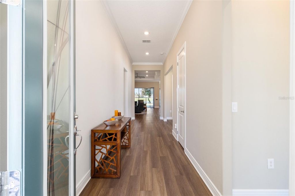 Extraordinary views set the tone for refined resort-style living in this beautiful 2-bedroom, 2.5 bath Prestige model, perfectly positioned on one of Stone Creek's most desirable lots with tranquil golf course vistas and breathtaking waterfront scenes overlooking Reflection Bay. In this gated 55+ golf community known for its exceptional amenities, homes offering this rare blend of premier location, thoughtful upgrades, and elevated outdoor living are seldom available. Curb appeal begins with a recently sealed paver driveway and walkway, a Kordella glass-inset front door, and manicured landscaping enhanced with river rock ground cover and custom concrete curbing. Inside, the home offers an elegant setting for both everyday living and sunset entertaining, enhanced by a versatile bonus room/den with a decorative tray ceiling and a screened-in paver-lined lanai situated for privacy while enjoying the stunning views. Designed with luxury and comfort in mind, this open concept layout home features high ceilings, luxury vinyl plank flooring, and refined crown molding accents in the main living areas. The gathering room is further enhanced by a dramatic tray ceiling and dual sliding glass doors that blur the line between indoors and out, drawing your eye straight to the priceless views. The Chef's Kitchen is a standout, offering Shaker-style cabinetry, sleek quartz countertops, a glass tile backsplash, stainless steel built-in appliances with a vented range hood, bar-height seating with pendant lighting, and a spacious walk-in pantry. The owner's suite is a serene retreat with a drop-soffit ceiling, dual custom-designed walk-in closets, including one with a convenient laundry chute, and a spa-inspired bath featuring dual vanities and a zero-entry shower with decorative glass tile inlay and a transom window for soft natural light. A private secondary bedroom with its own full bathroom with an upgraded walk-in shower and walk-in closet, a separate powder room for guests, and a generous laundry room with a laundry tub, storage cabinets, and a folding table add everyday convenience. A well-placed mudroom offers access to the 4' extended garage offering overhead storage, rubber floor tiles, and ample room for a golf cart. Additional upgrades include a Kinetico water softener, blinds and ceiling fans throughout, and a whole-home surge protector for added peace of mind. Embrace the exceptional lifestyle of this vibrant community, featuring a 24/7 staffed gated entrance for security and peace of mind. Luxury-inspired amenities include heated pools, a state-of-the-art fitness center, a spa, and relaxing hot tubs and saunas. Stay active with pickleball, bocce, tennis, and a softball field, while a dedicated lifestyle staff curates entertainment, activities, and special events to foster connections. Just beyond the gates, enjoy a golf course, pro shop, and restaurant"”perfect for socializing and unwinding. Make your move today and experience resort-style living at its finest!