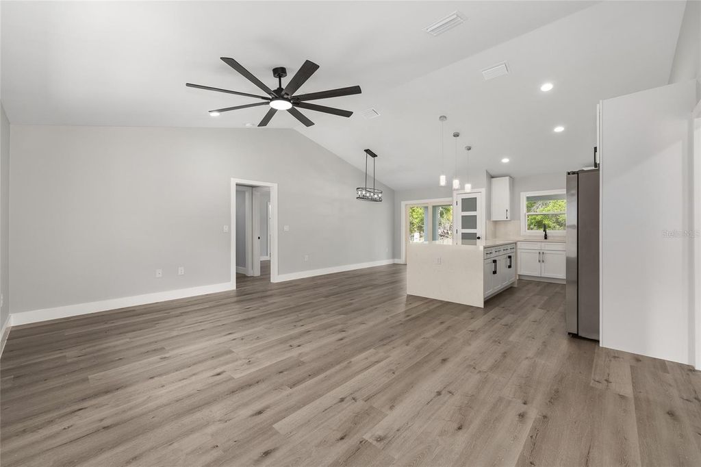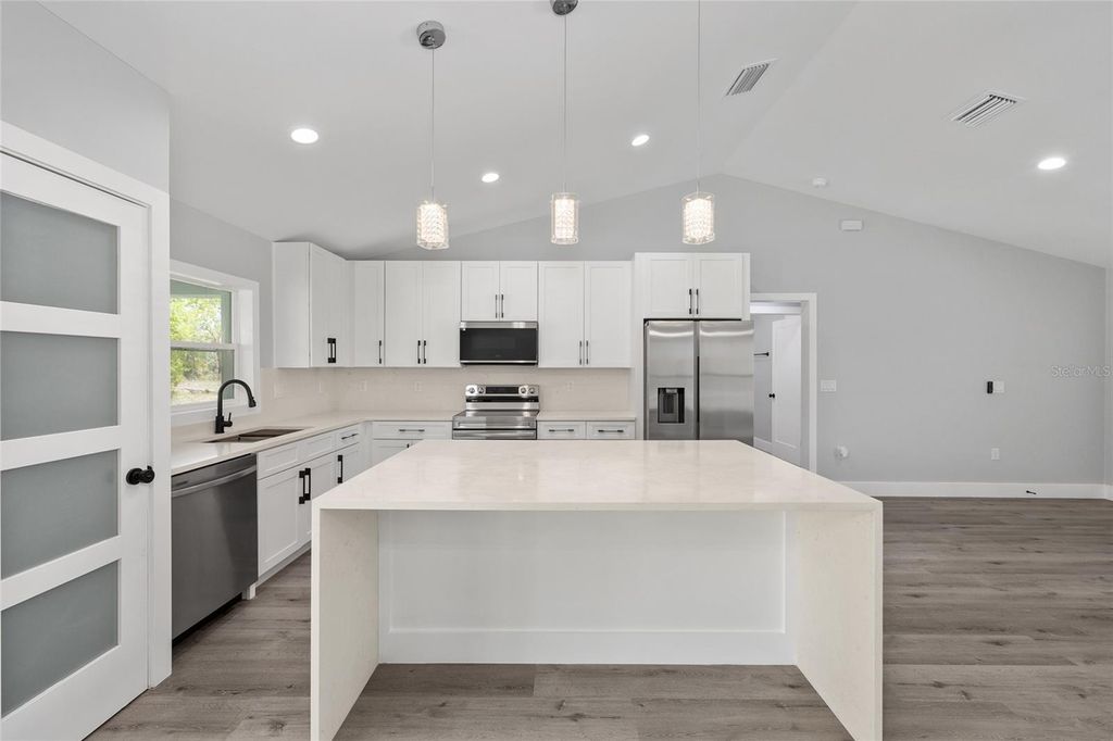 One or more photo(s) has been virtually staged. Brand-new construction in Ocklawaha offering the perfect blend of style and functionality. This 3-bedroom, 2-bath home with a 2-car garage is thoughtfully upgraded throughout. The kitchen is designed to impress with 42" soft-close cabinets, a stunning Quartz waterfall island that features as backsplash also, and plenty of space for entertaining. Additional features include soft-close closet doors in bedrooms, a farmhouse-style laundry door with added cabinetry, and convenient attic storage with ladder access.The oversized garage accommodates trucks with 8-ft beds, while the bathrooms showcase elegant porcelain tile finishes for a modern touch.Enjoy outdoor living on the covered back porch, perfect for relaxing year-round. A beautifully upgraded home in a growing area"”ready for its new owners.