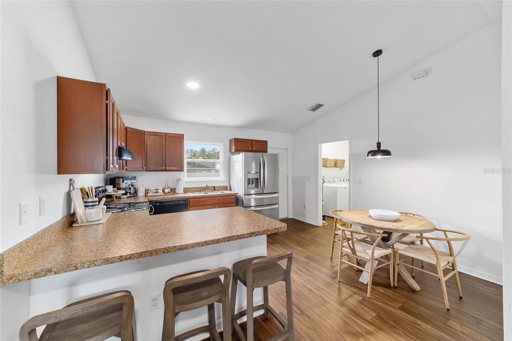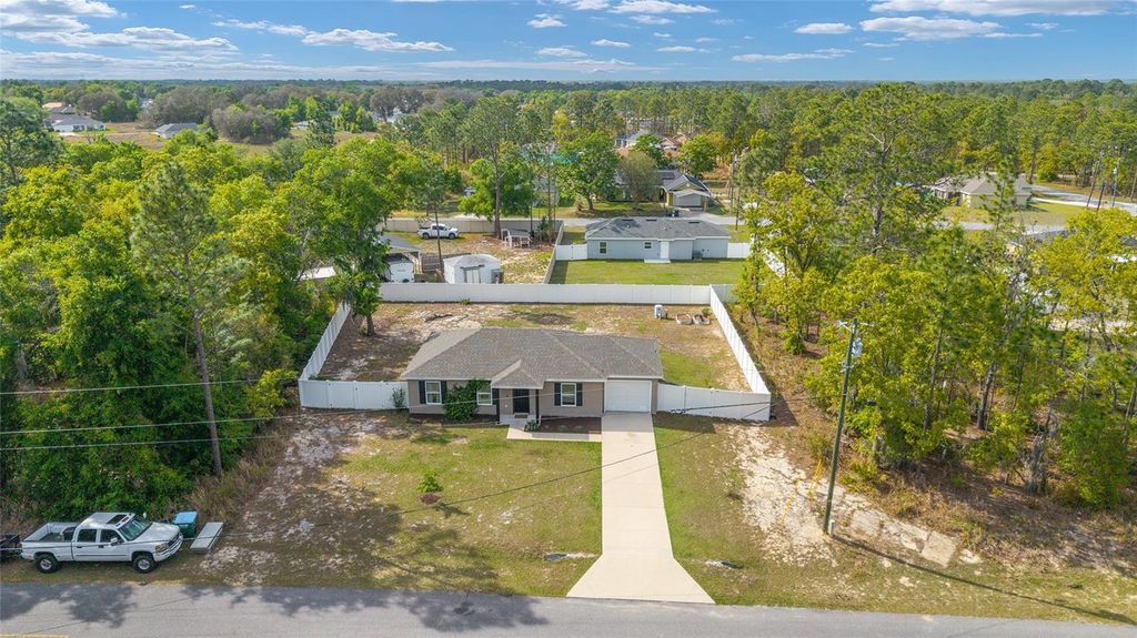 Experience modern comfort and privacy in this well-priced and nearly new three-bedroom, two-bath split-plan home set on an oversized .29 acre lot. Thoughtfully crafted for efficiency and style, the home features upgraded R44 insulation, a light and bright neutral palette, and open-concept living spaces that feel both inviting and functional. The living room offers lofty cathedral ceilings and luxury vinyl plank flooring throughout creates a seamless flow, making everyday living and entertaining effortless. The eat-in kitchen offers stainless steel appliances, recessed lighting, abundant cabinetry and counter space, a breakfast nook, and an island offering bar-height seating ideal for casual meals. The Owner's suite provides peaceful space to relax and a private ensuite bath with a fiberglass surround shower. Two additional guest rooms, a convenient inside laundry room, and a garage equipped with a cooling fan add to the home's practical appeal, and the large vinyl privacy-fenced backyard offers plenty of space for outdoor gatherings or a future pool. The Silver Springs Shores community is perfectly positioned just a short drive from The Villages and also offers close proximity to abundant shopping, dining, and medical facilities. Outdoor enthusiasts will love the ease of access to local parks and natural attractions, including Silver Springs State Park for kayaking and camping, as well as swimming, boating, and fishing on nearby Lake Weir.
