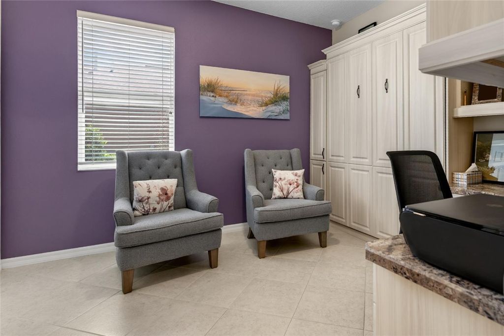 Welcome to this well-maintained Kent model in the Avalon 4 community. This 2-bedroom, 2-bath home with a 2-car garage features modern upgrades, an open layout, luxury vinyl plank flooring, crown molding, and plenty of natural light. The kitchen offers two-tone cabinetry, granite countertops, tile backsplash, stainless steel appliances, a pantry, and an eat-in dining area. The living room opens to a screened lanai with a ceiling fan and pull-down shades, overlooking private landscaping. The primary suite includes a walk-in closet and a zero-entry tiled shower with dual quartz sinks. The guest bedroom features a Murphy bed with built-in desk. Additional highlights include a Maytag washer and dryer, epoxy garage floor, gutters, and curbed landscaping. Located in a gated 55+ community with amenities and golf cart access to nearby shopping.