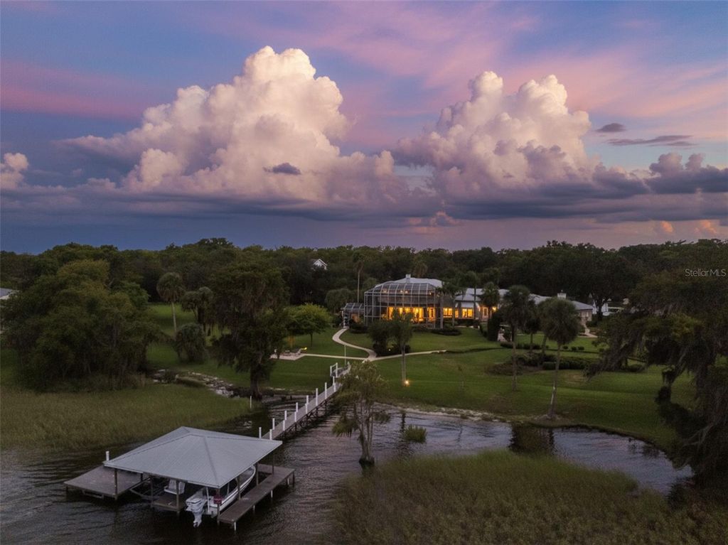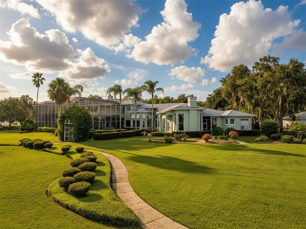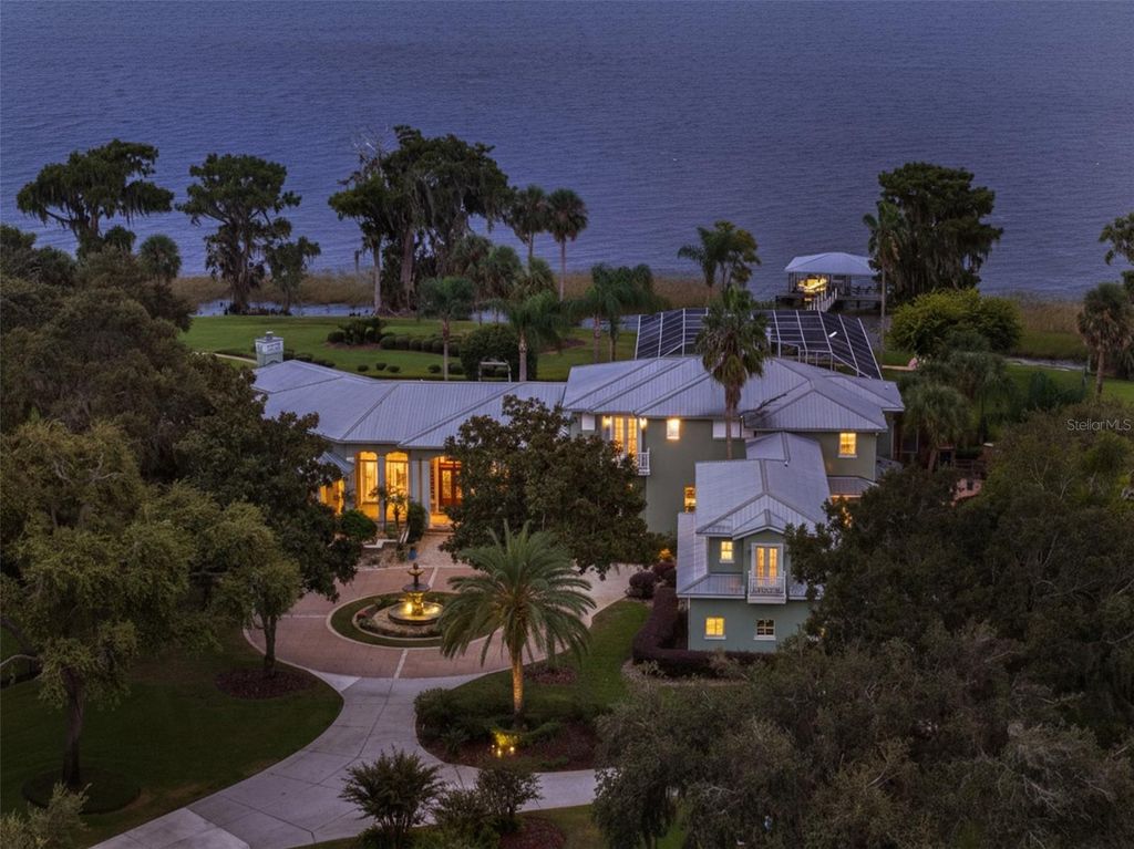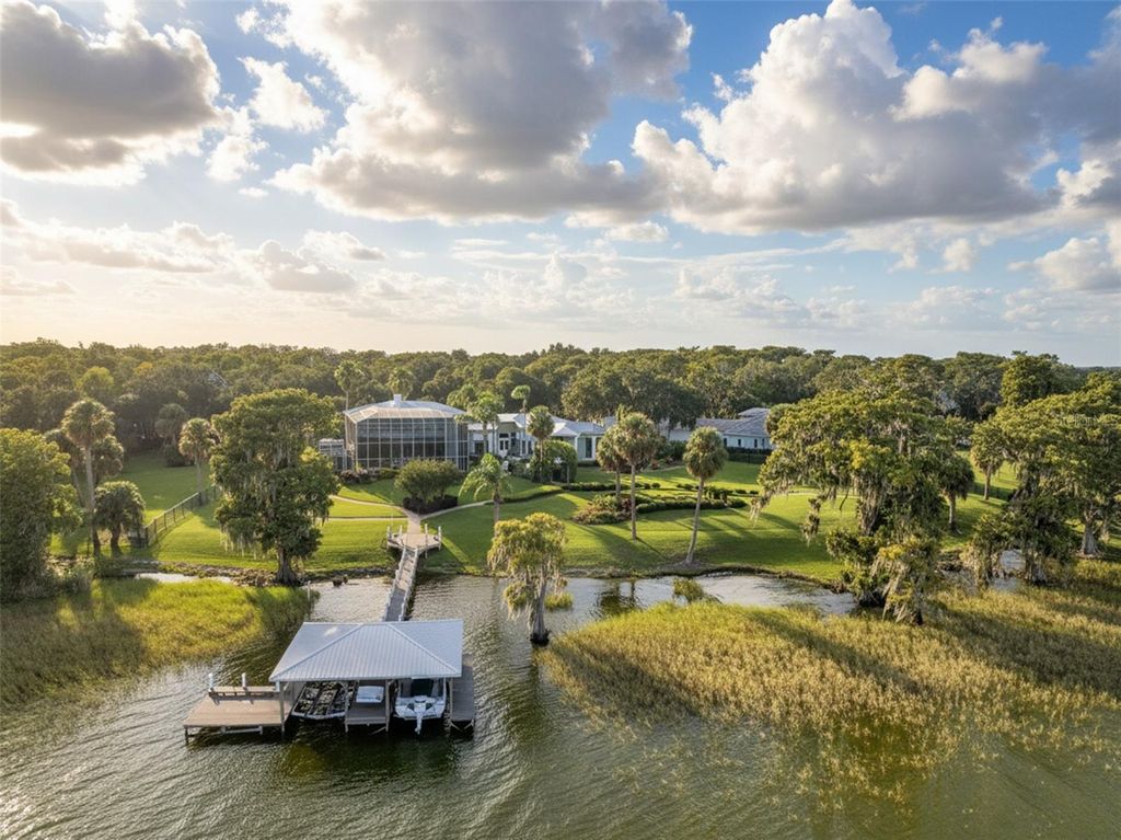 Experience a rare blend of serenity, sophistication, and lakefront living on the pristine shores of Lake Harris, part of Central Florida's famed Harris Chain of Lakes. Tucked behind a private gated drive, this extraordinary property spans 3.06 acres with the added benefit of 46± acres of protected conservation land, creating a sense of unrivaled privacy and natural beauty. Inside the 8,596-square-foot custom residence, craftsmanship takes center stage. Walls of windows capture shimmering water views from nearly every room, while rich design details, from diagonal-laid hardwood floors and porcelain tile to tongue-and-groove, barrel, coffered, and tray ceilings, set an elegant tone. Handcrafted millwork, a stunning leaded glass entry, granite surfaces, multiple fireplaces, and upscale finishes add warmth and timeless appeal. The home was designed for both quiet moments and unforgettable gatherings. An open chef's kitchen flows into welcoming dining and living areas, perfect for entertaining. Additional spaces include a first-floor game room with its own chilled wine room, a private office with custom woodwork, a dedicated homework station, and a versatile bonus room over the garage, ideal for a theater, guest suite, fitness area, or creative retreat. Each bedroom features a private ensuite bath, offering comfort and privacy for family and guests alike. Step outside to an outdoor haven where you can wander a serene path to a lakeside firepit, relax by the pool, or enjoy your private boathouse with dual lifts for effortless days on the water. The expansive, beautifully landscaped grounds have even hosted picturesque weddings, making this estate as enchanting for events as it is for everyday living. All this tranquility comes with surprising convenience. You're moments from charming downtown Leesburg and Mount Dora, with nearby golf, shopping, dining, and healthcare options such as UF Health and AdventHealth. Leesburg International Airport is close at hand, while Disney and Orlando International Airport are less than an hour away. This is more than a home, it's a private lakeside retreat designed for refined living, effortless entertaining, and unforgettable memories.